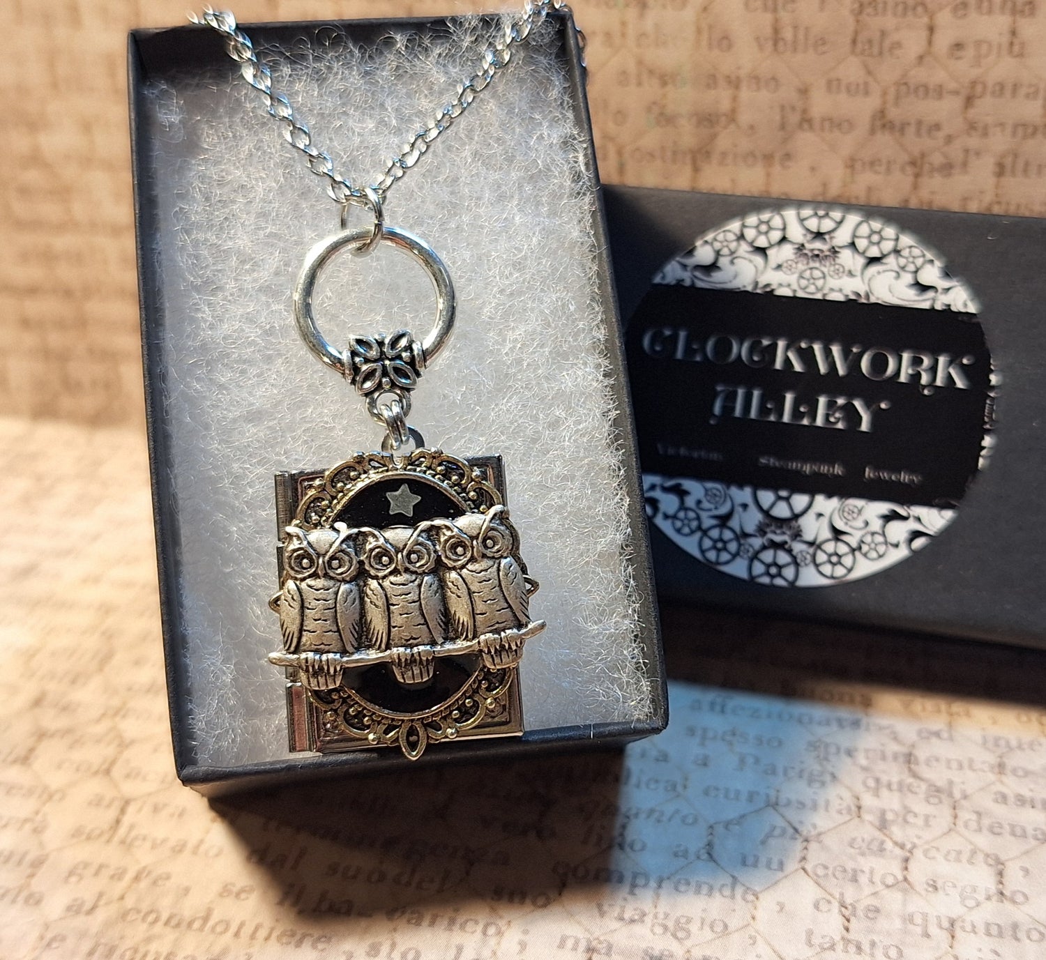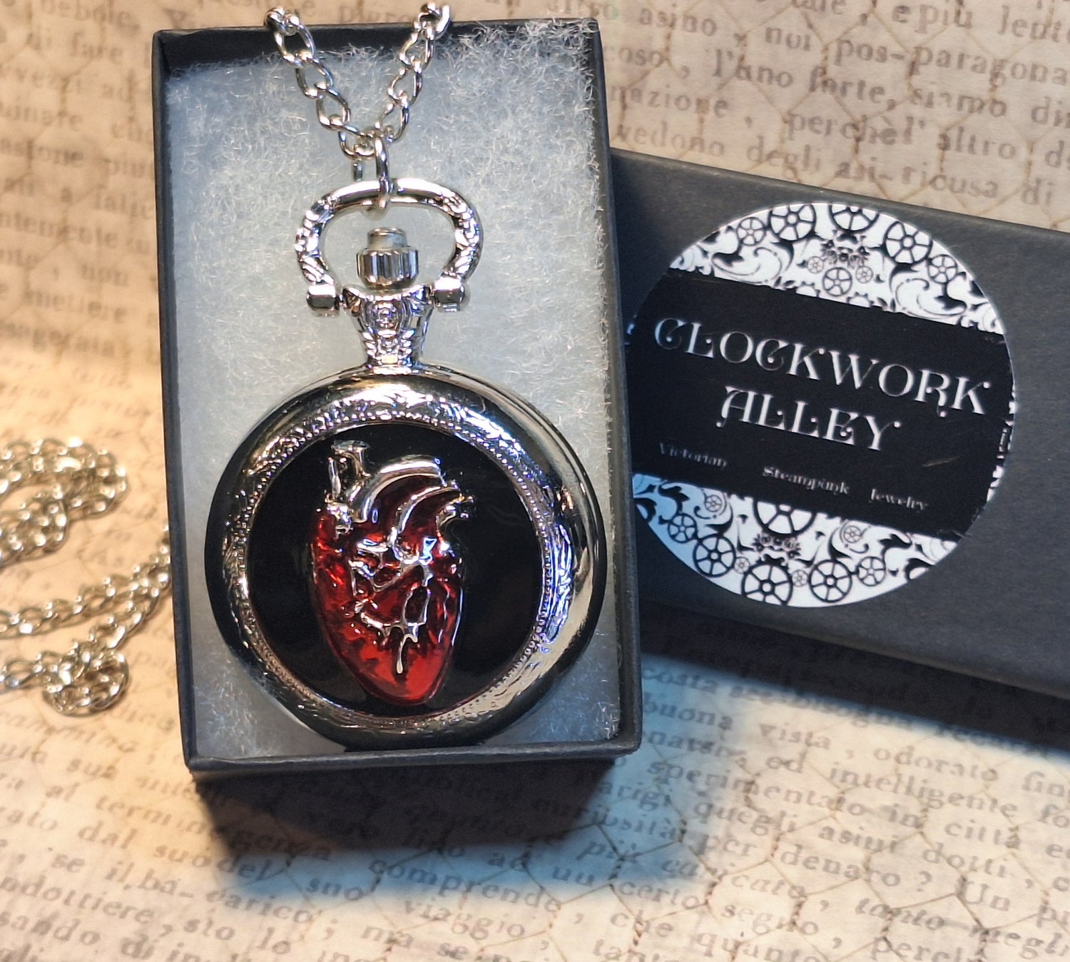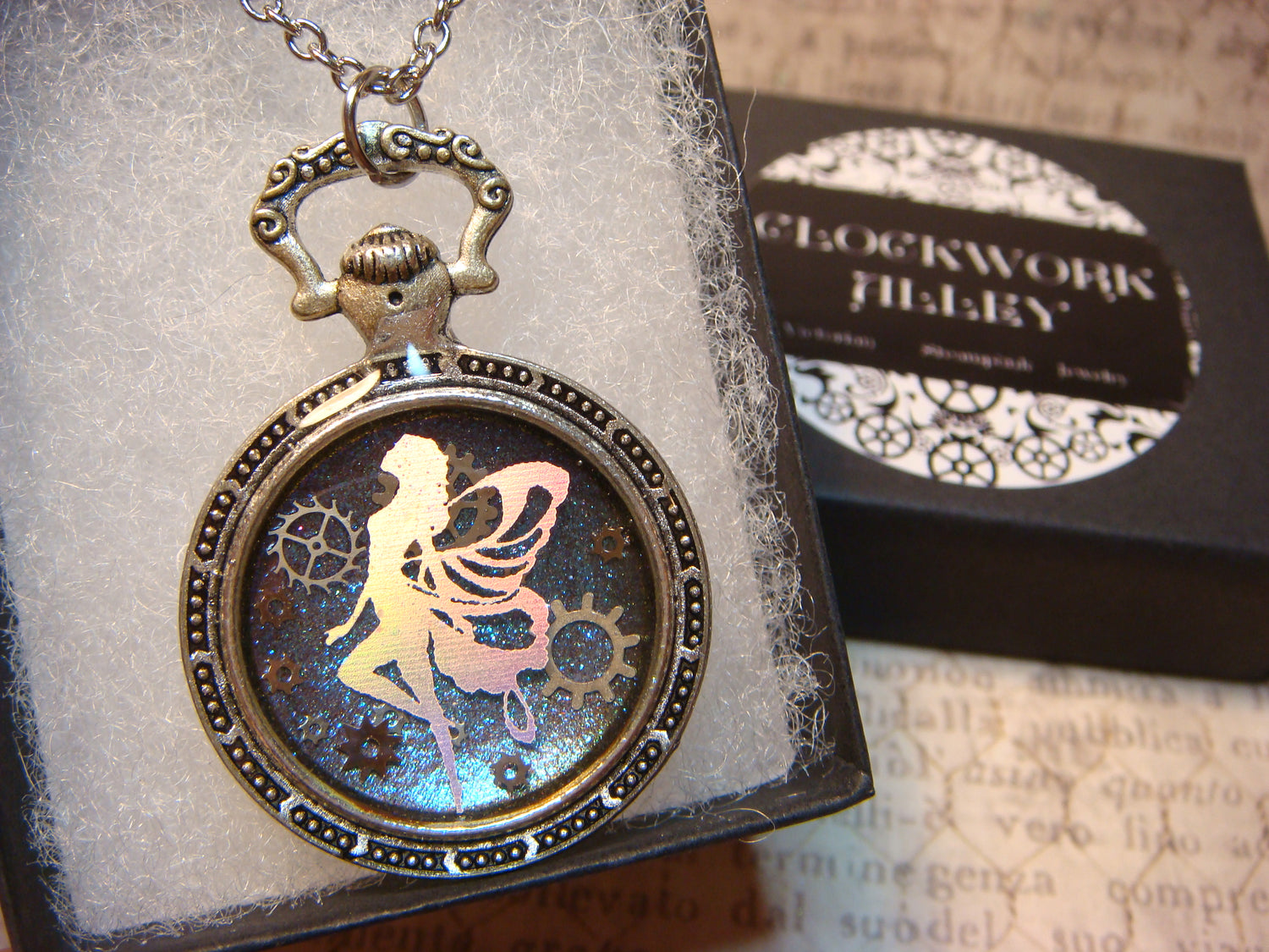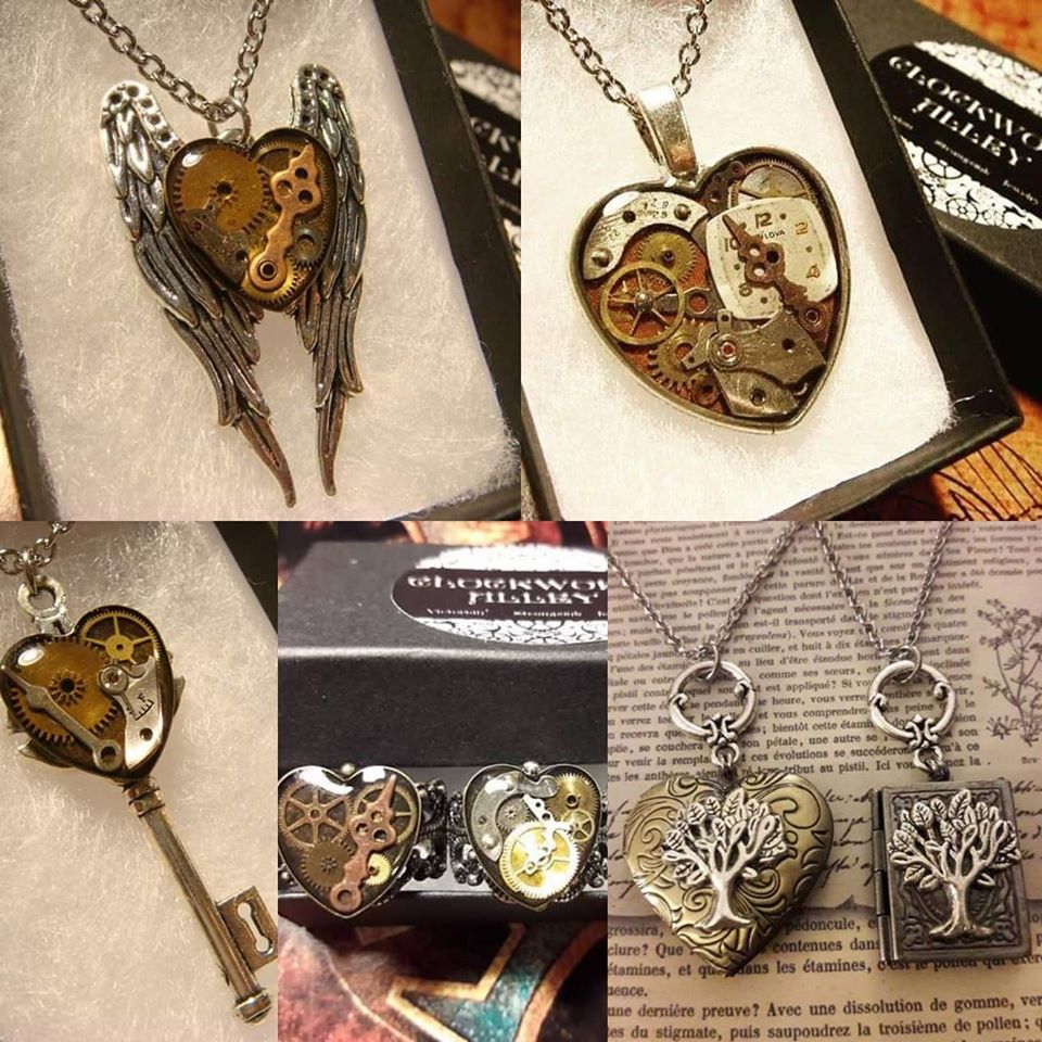 Necklaces made with upcycled watch parts in pocket watch shaped settings.