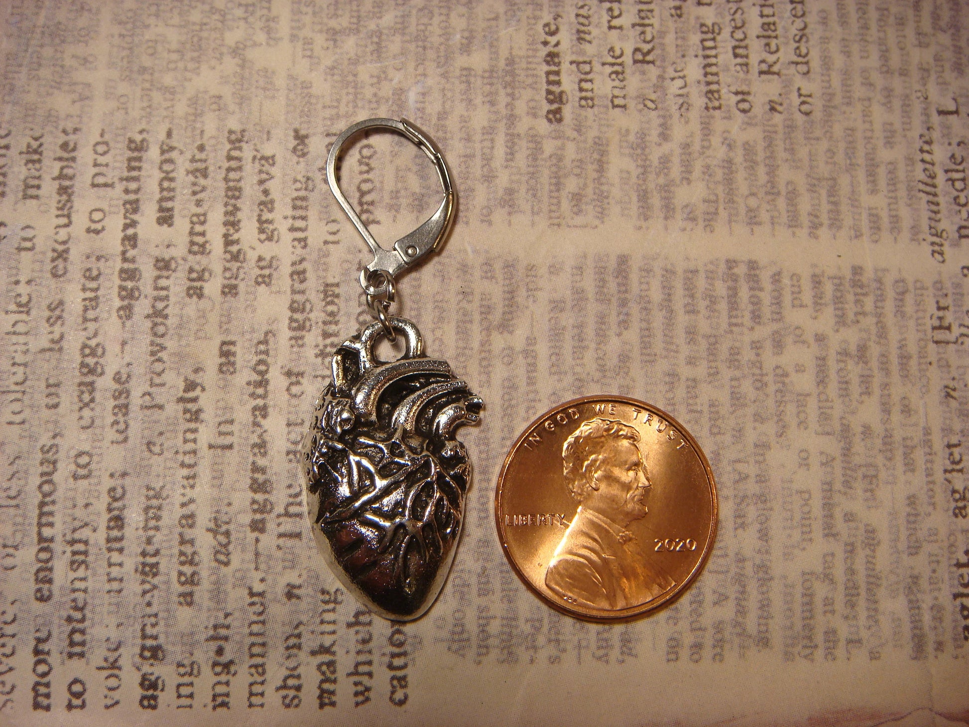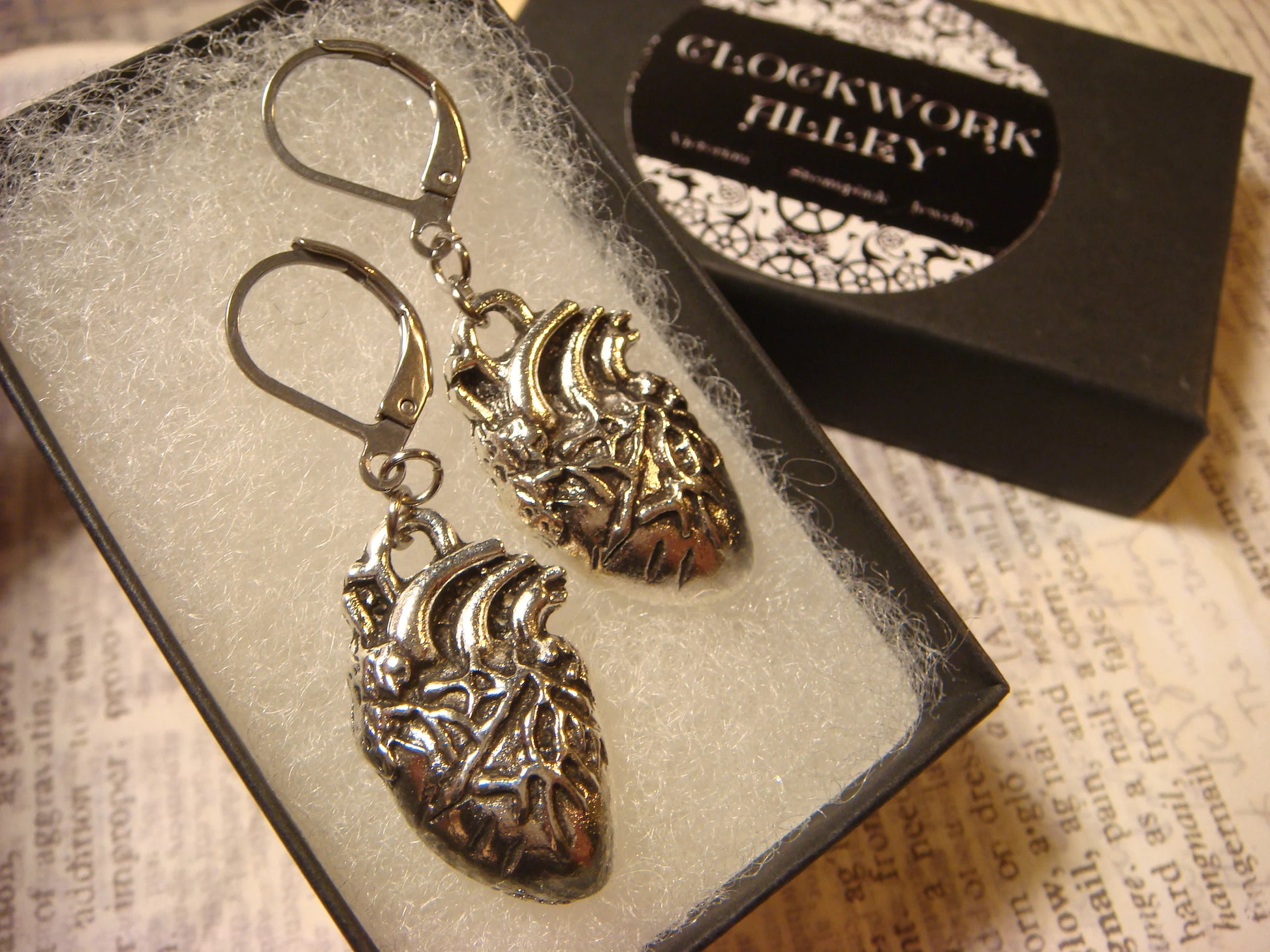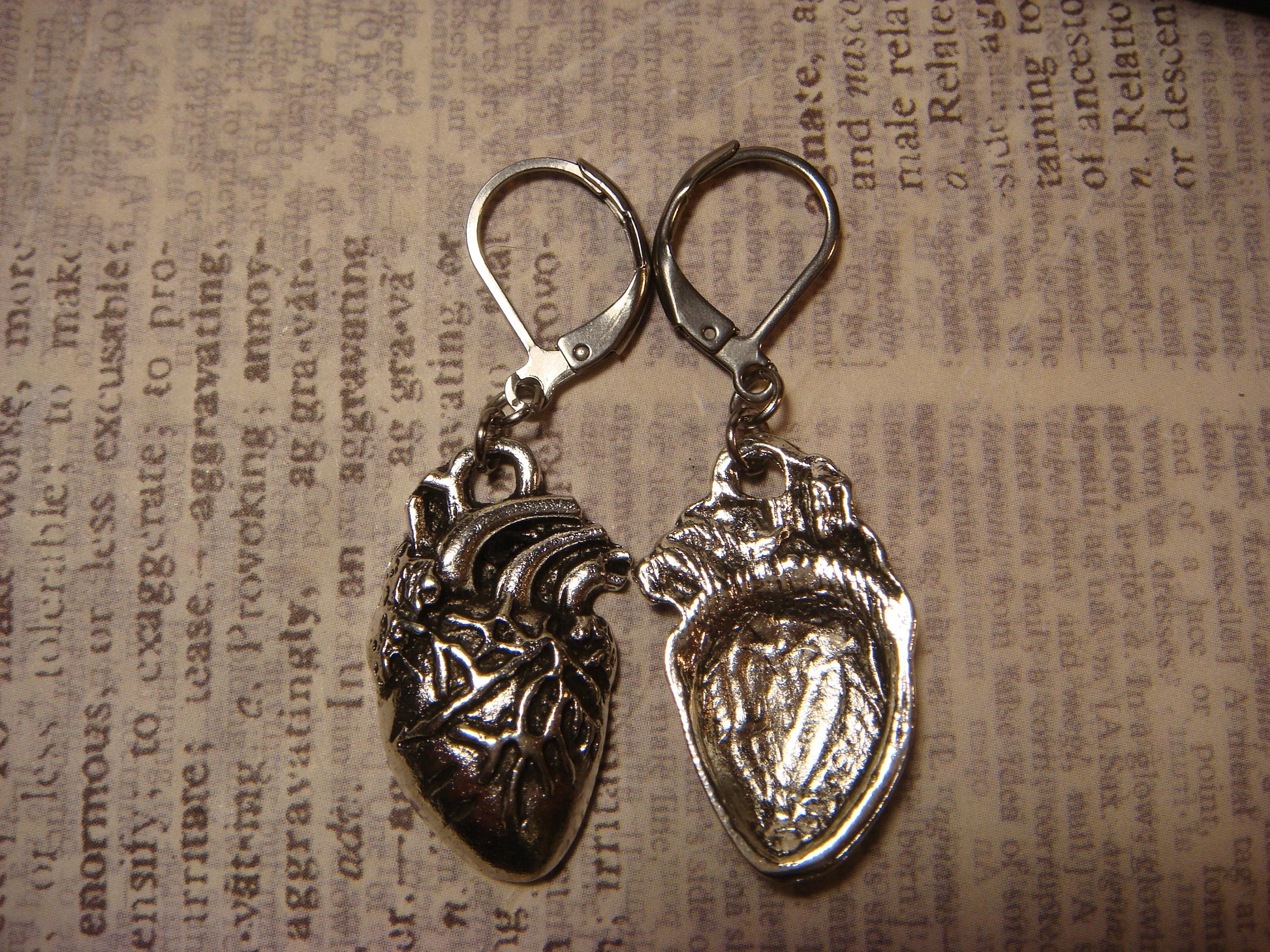 These earrings are made with antique silver anatomical hearts hanging on stainless steel lever back earrings.