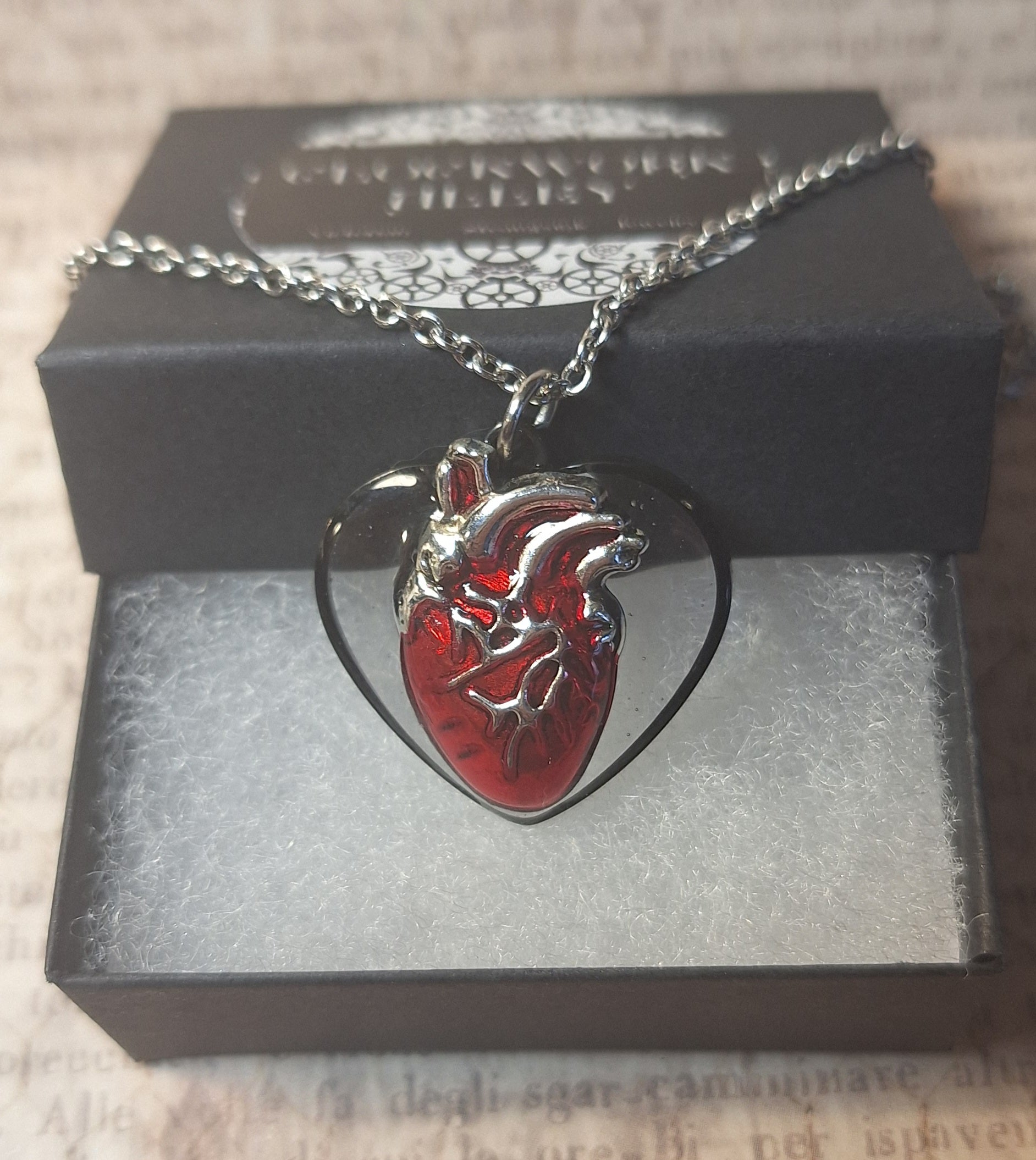 This necklace features a red anatomical heart set in a black heart pendant with resin made transparent.