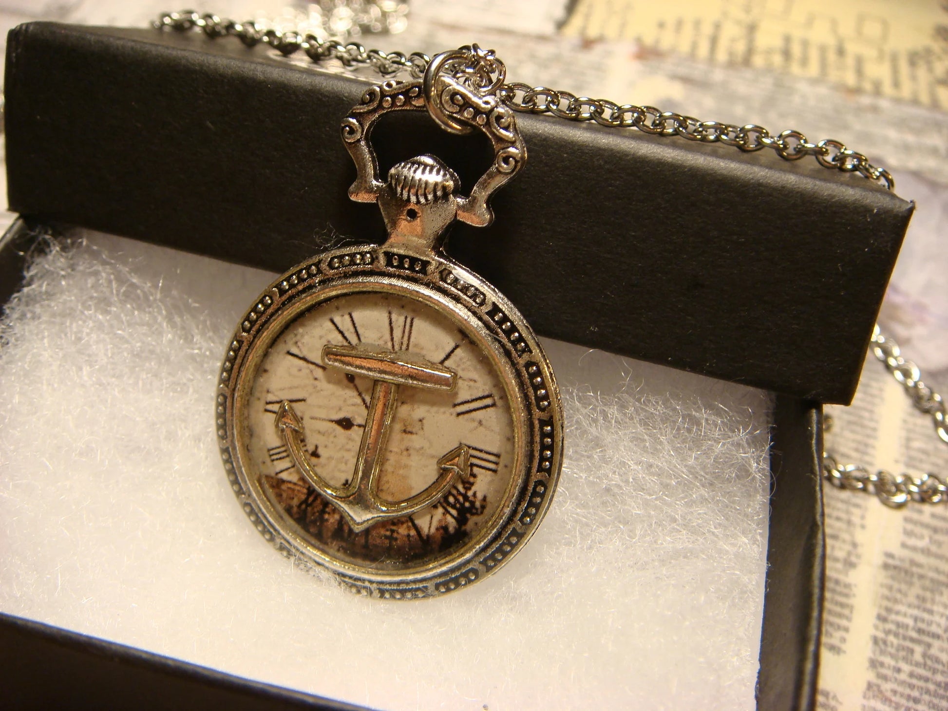 Anchor over Victorian Clock Pocket Watch Pendant Necklace