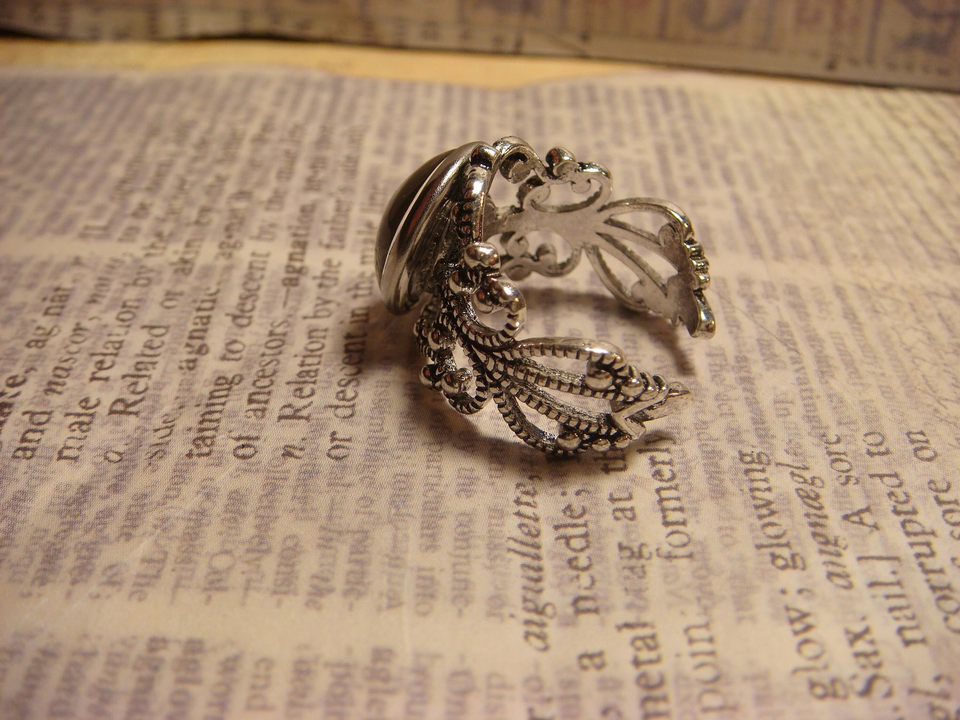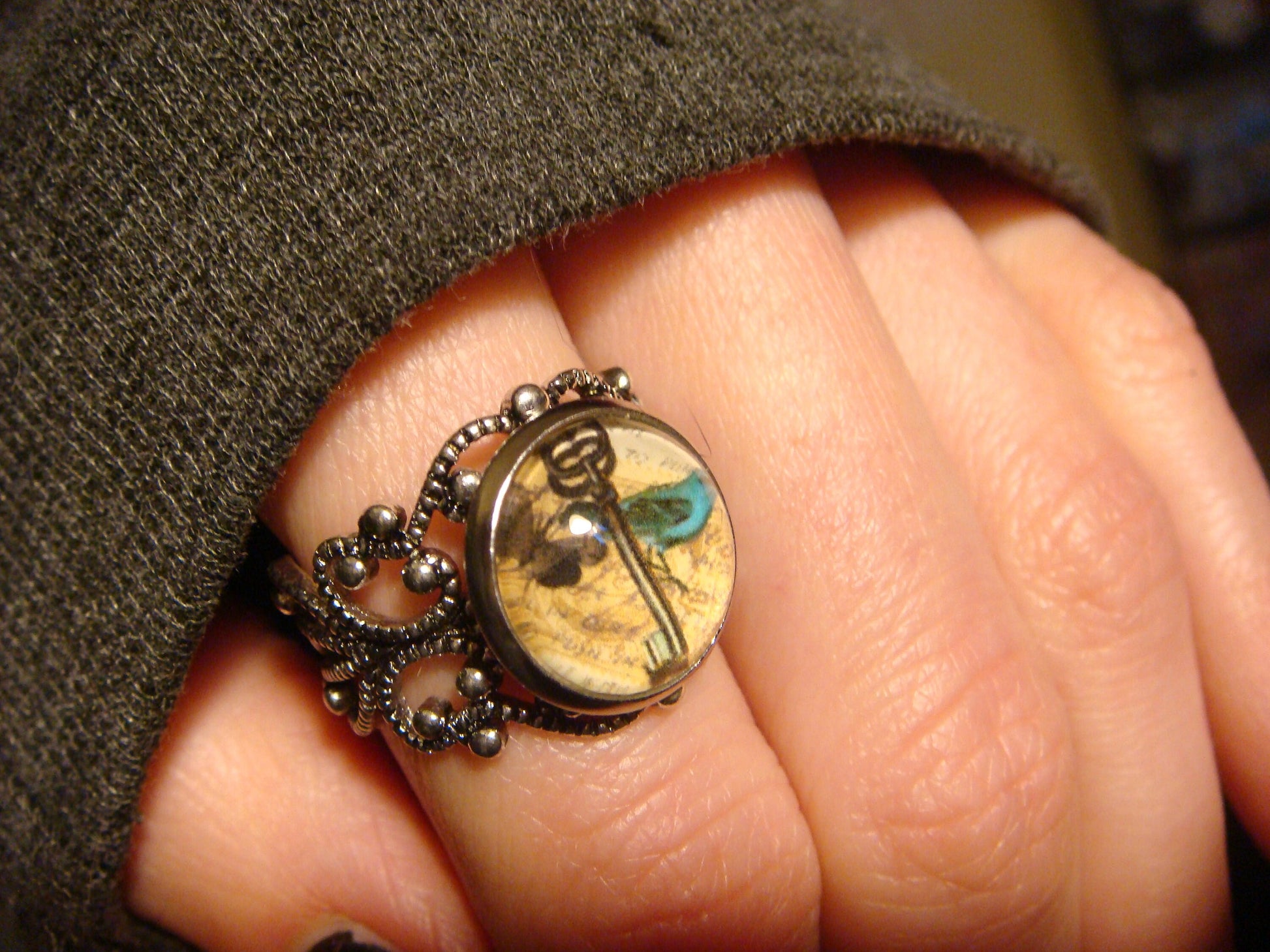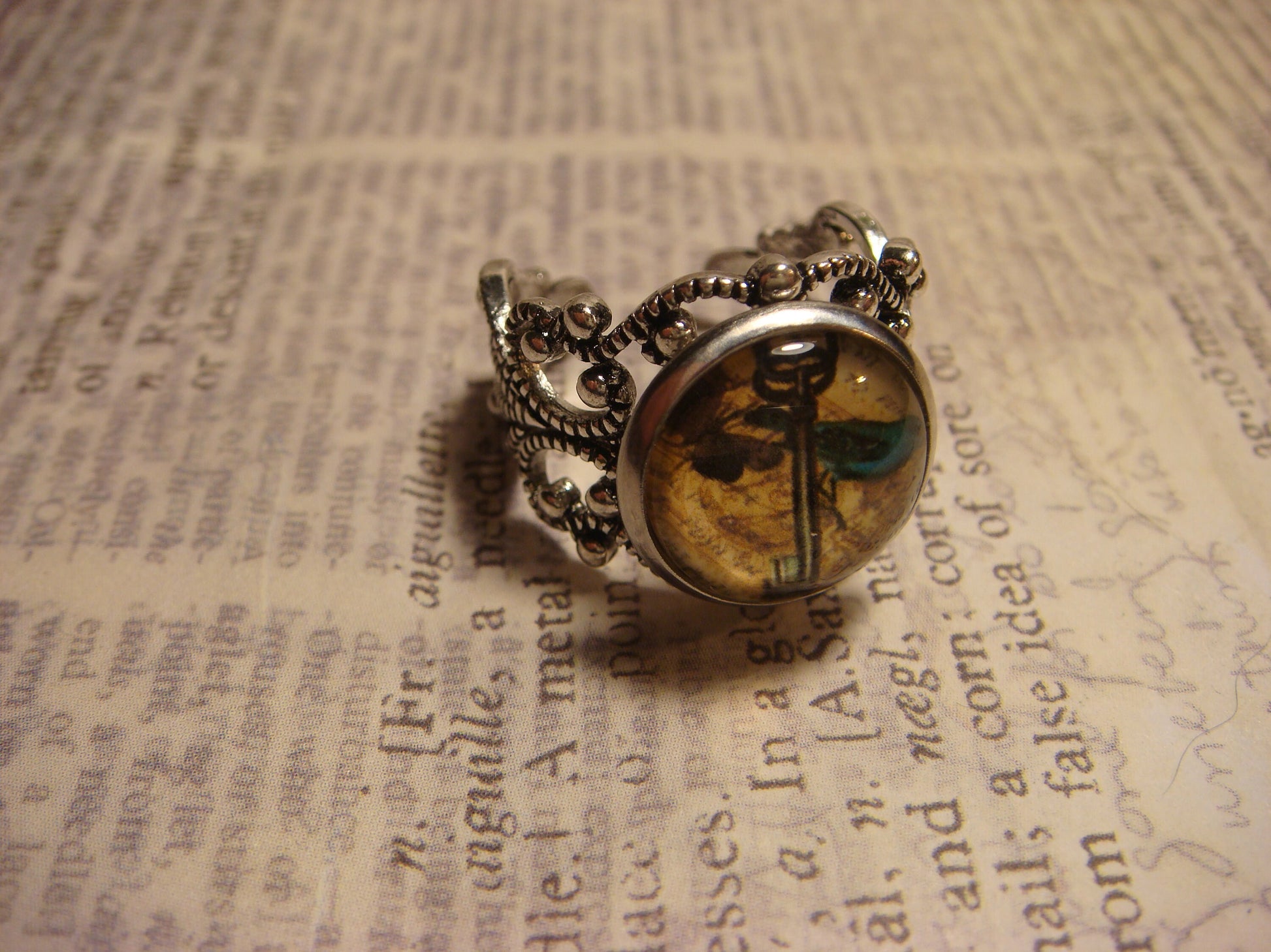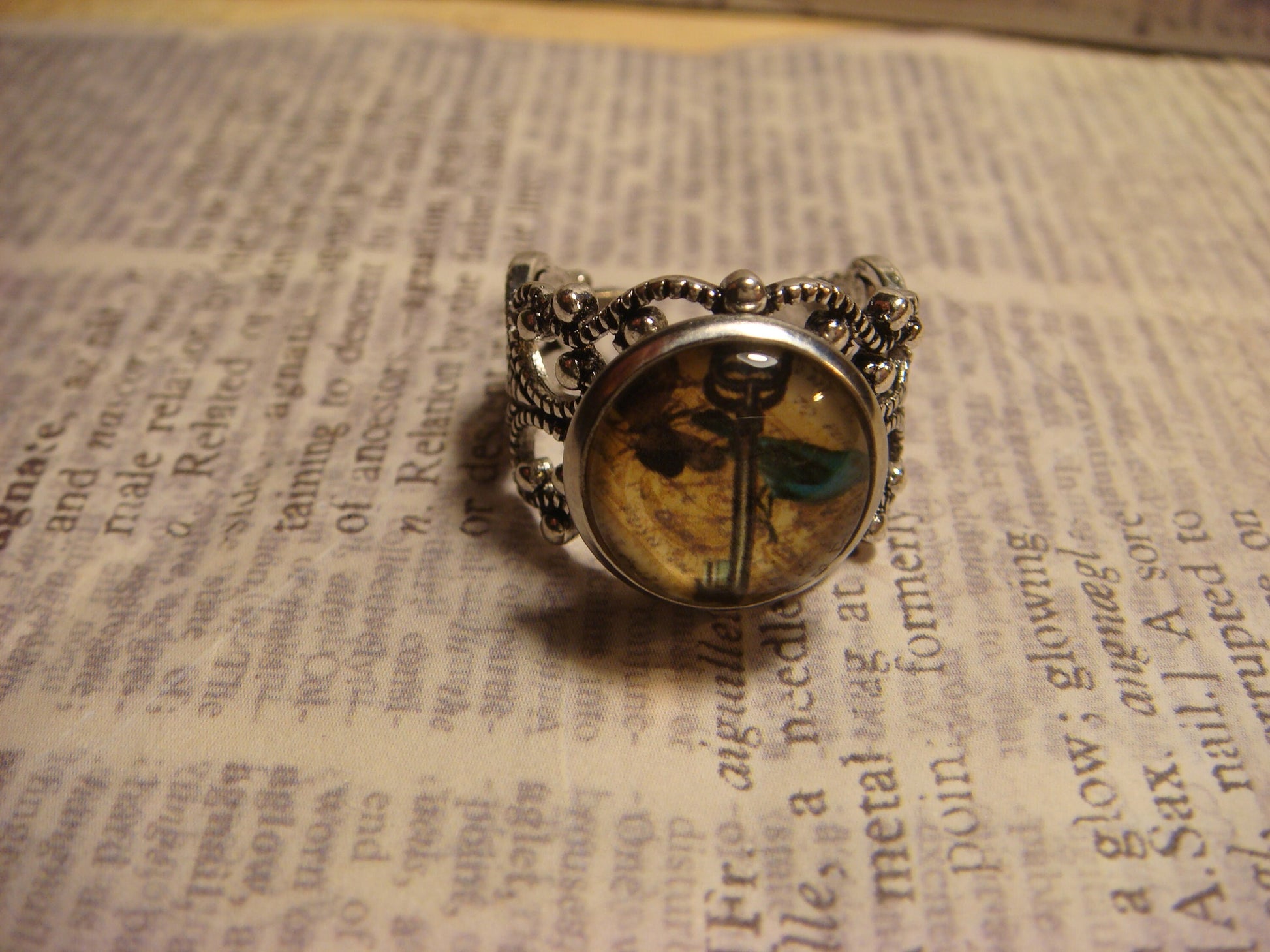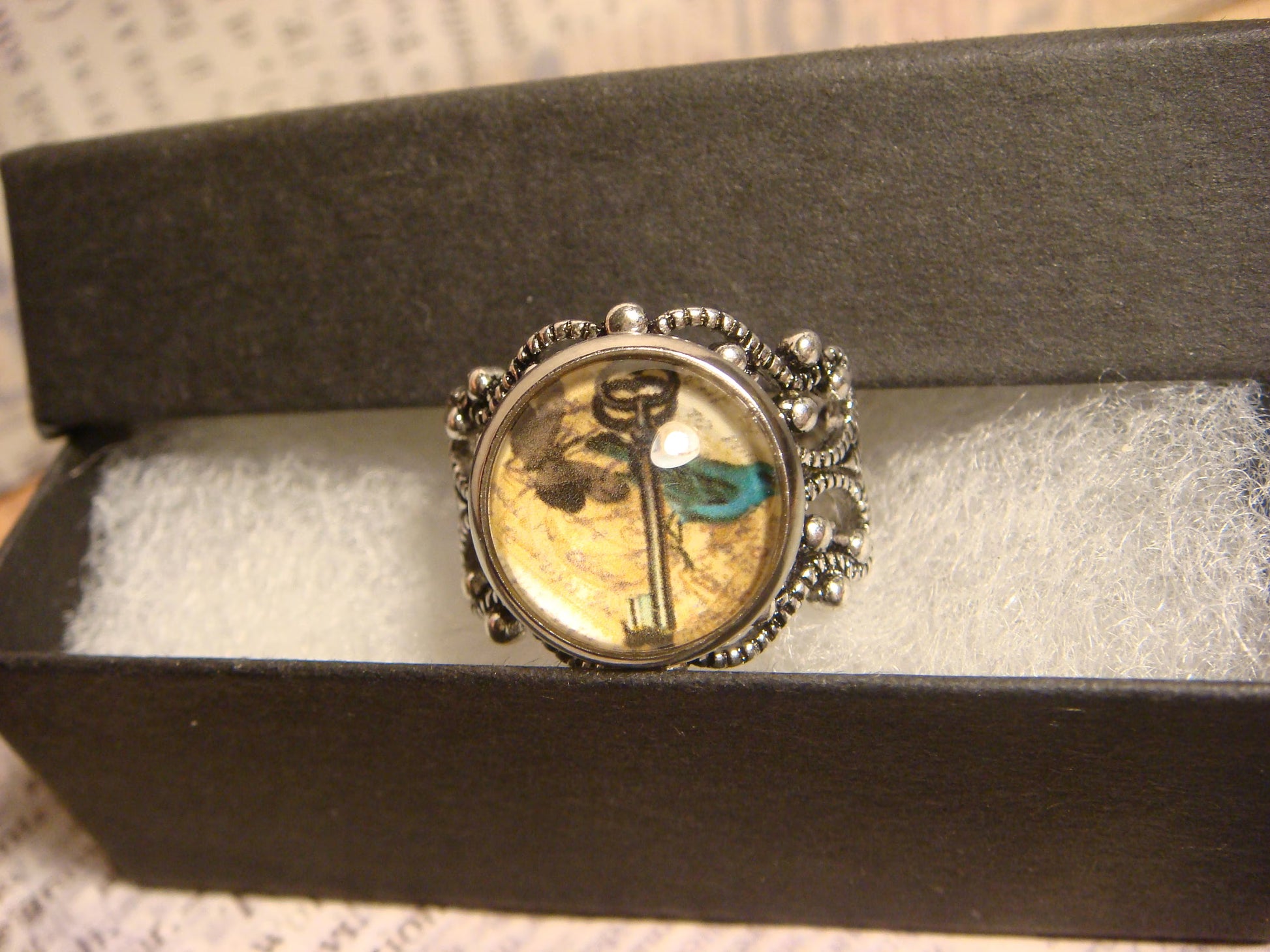 This beautiful ring features a key with a bluebird and butterfly image cabochon set on a sturdy antique silver filigree Victorian style adjustable ring.