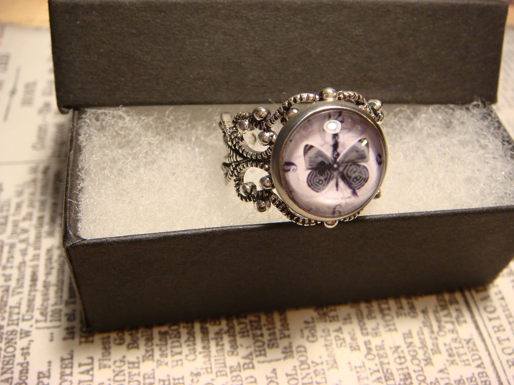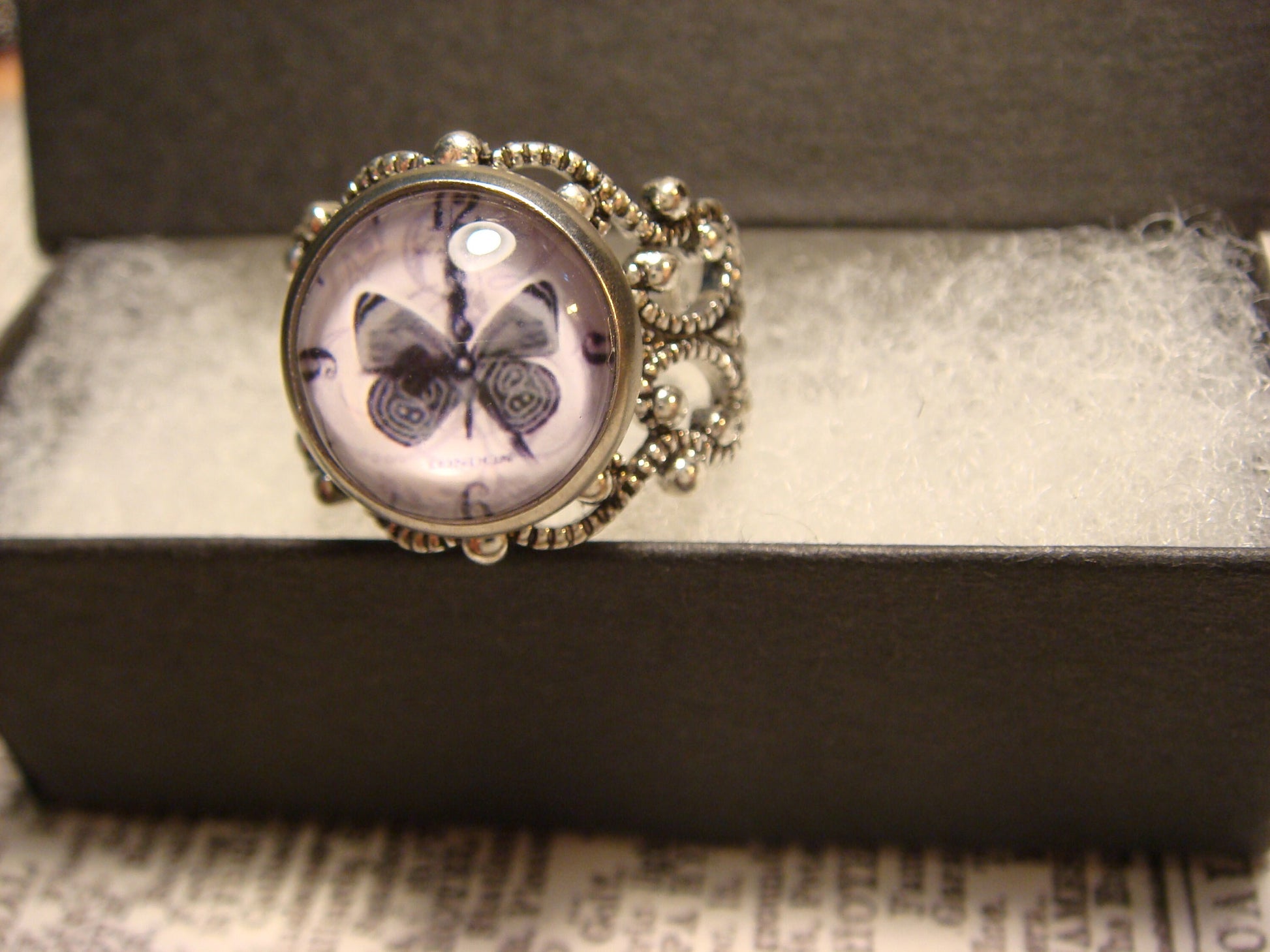 This beautiful ring features a black and white butterfly clock image cabochon set on a sturdy antique silver filigree Victorian style adjustable ring.