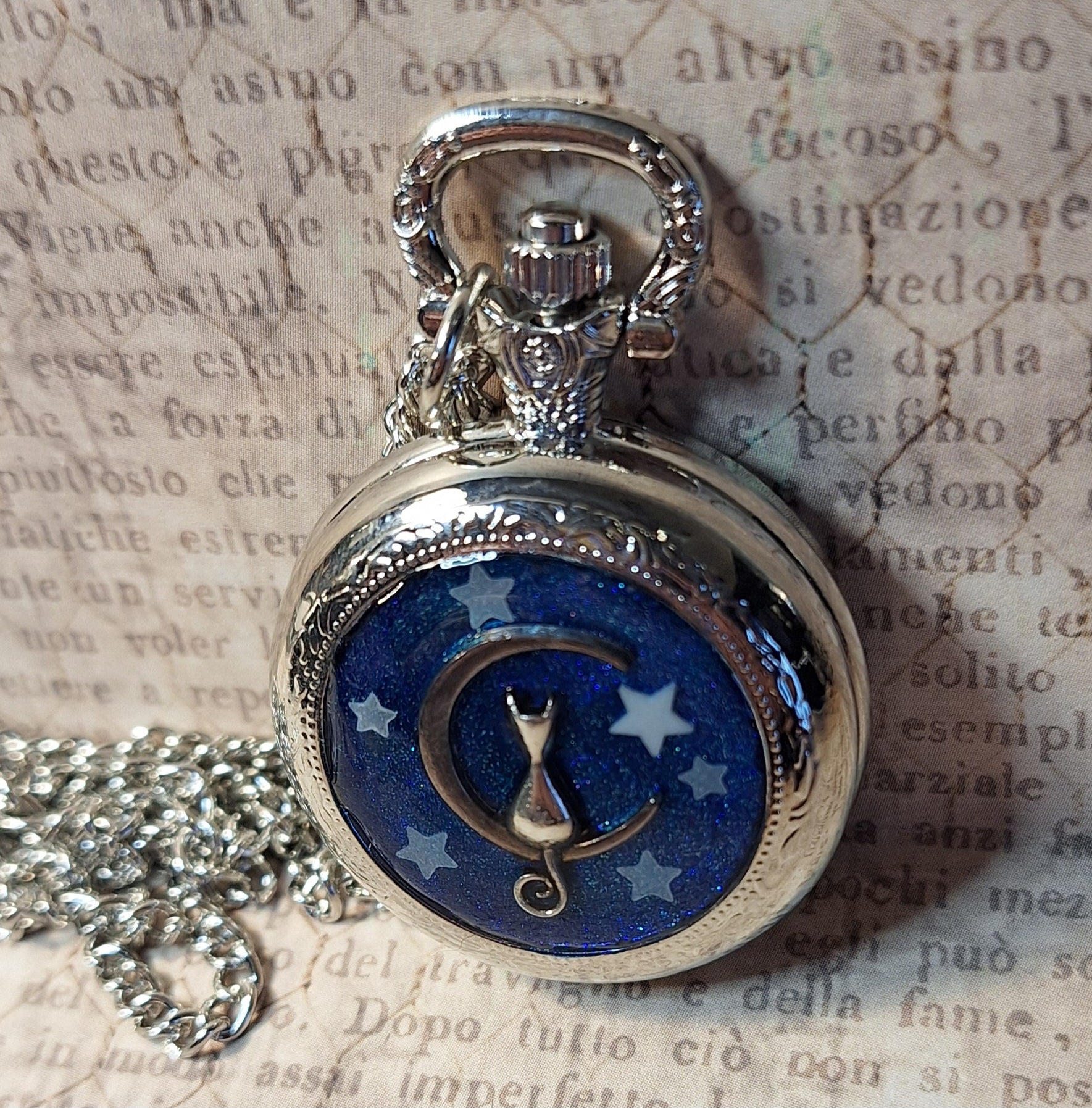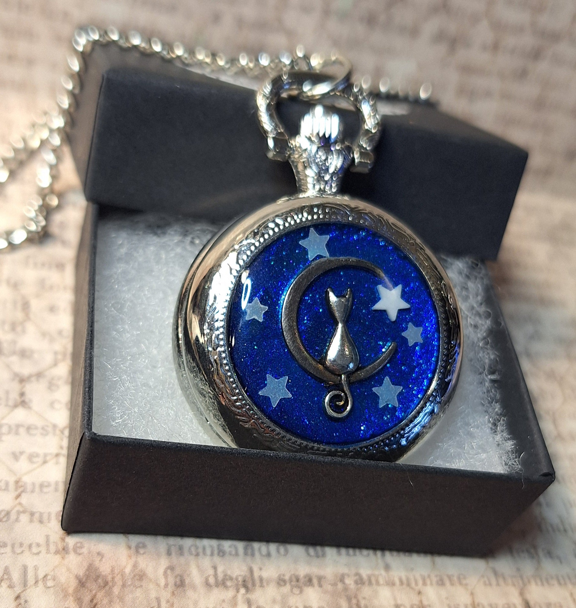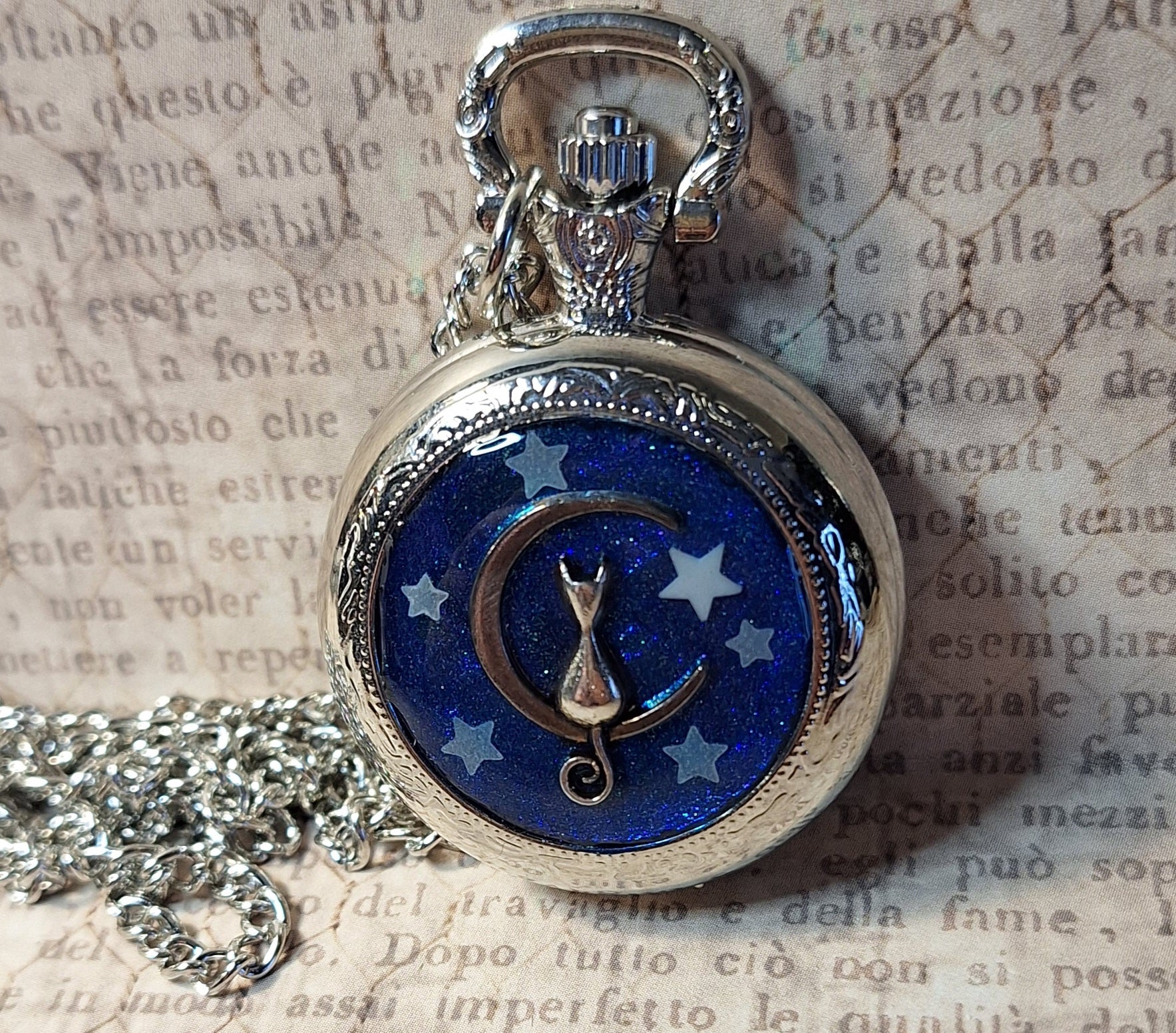 This handmade antique silver functional pocket watch features an antique Silver cat moon with glow-in-the-dark stars over a glittery blue background. Clock pendant measures approximately 2" long