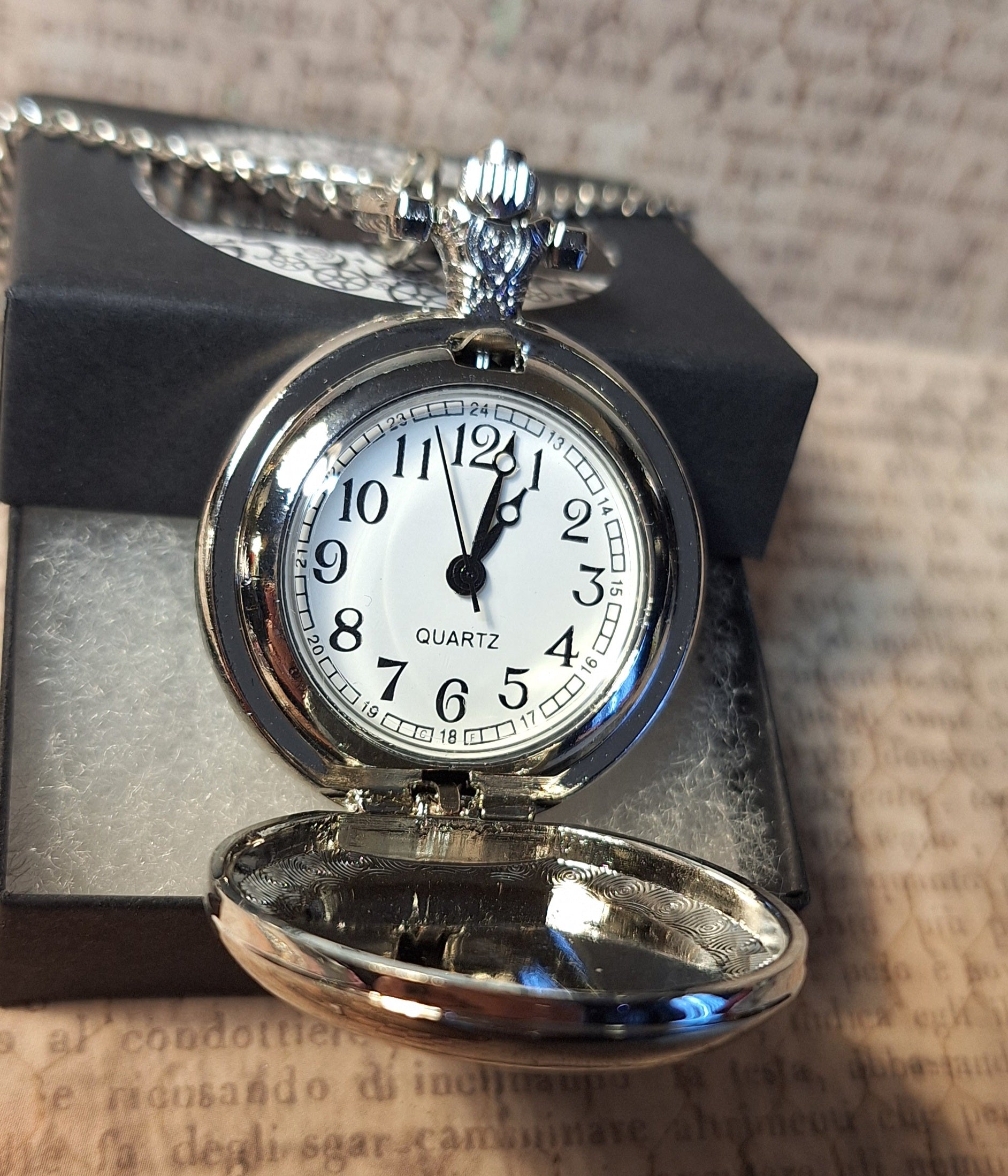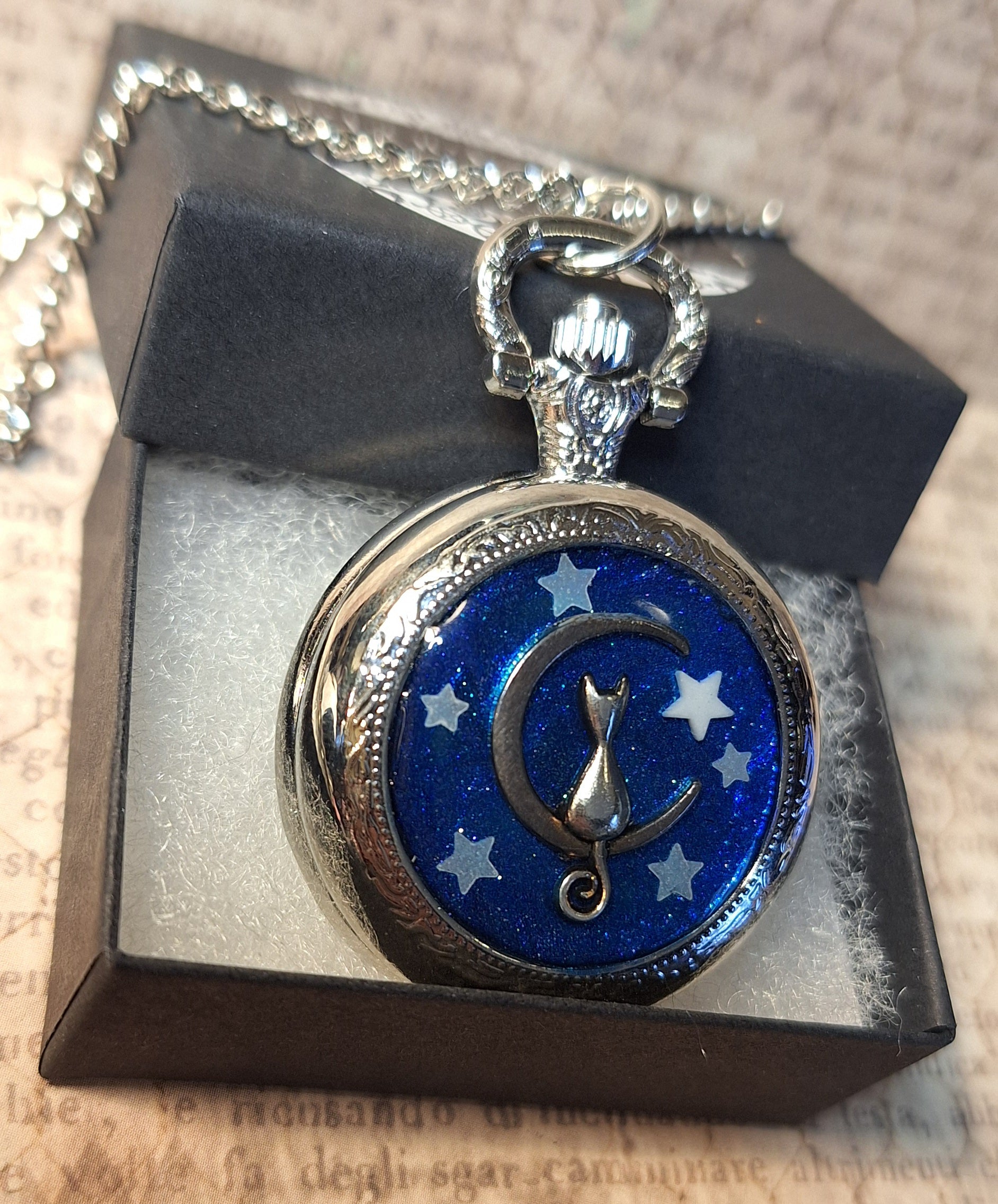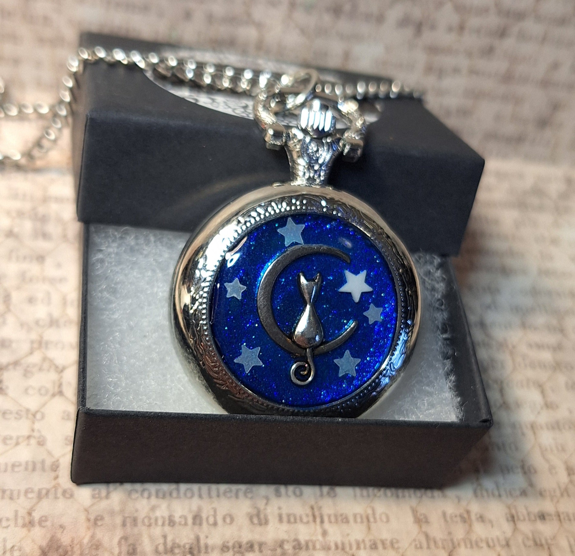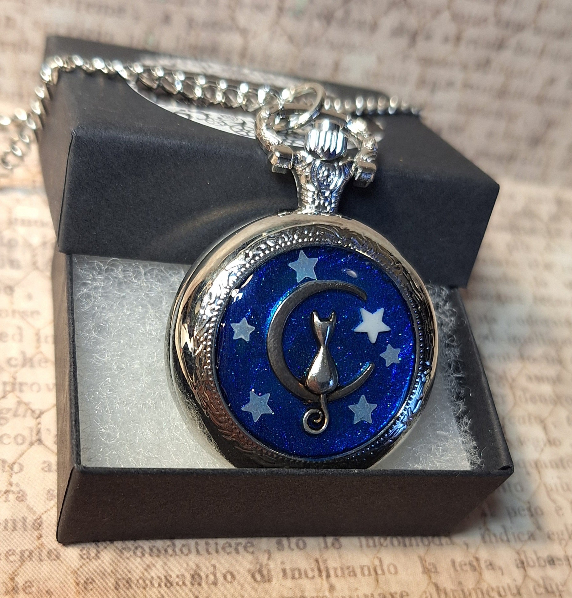 This handmade antique silver functional pocket watch features an antique Silver cat moon with glow-in-the-dark stars over a glittery blue background. Clock pendant measures approximately 2" long