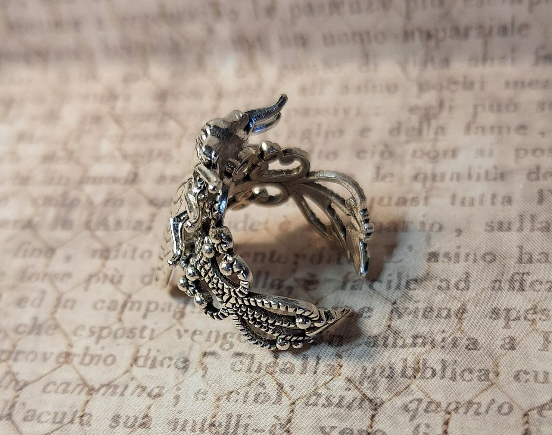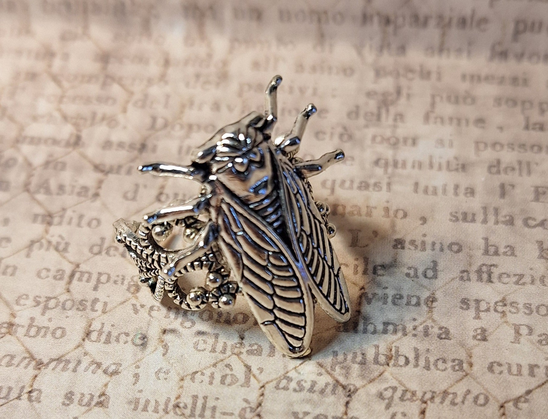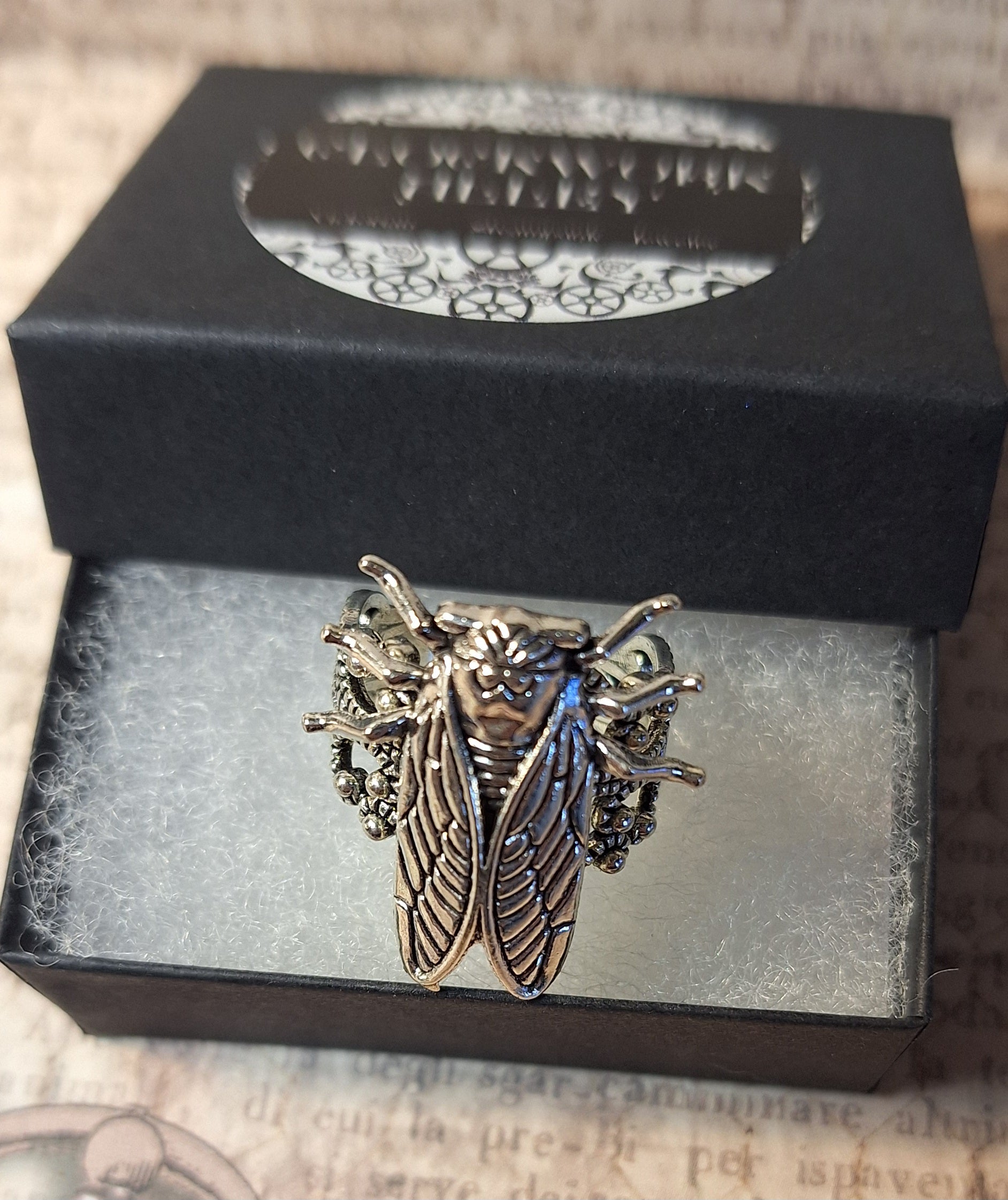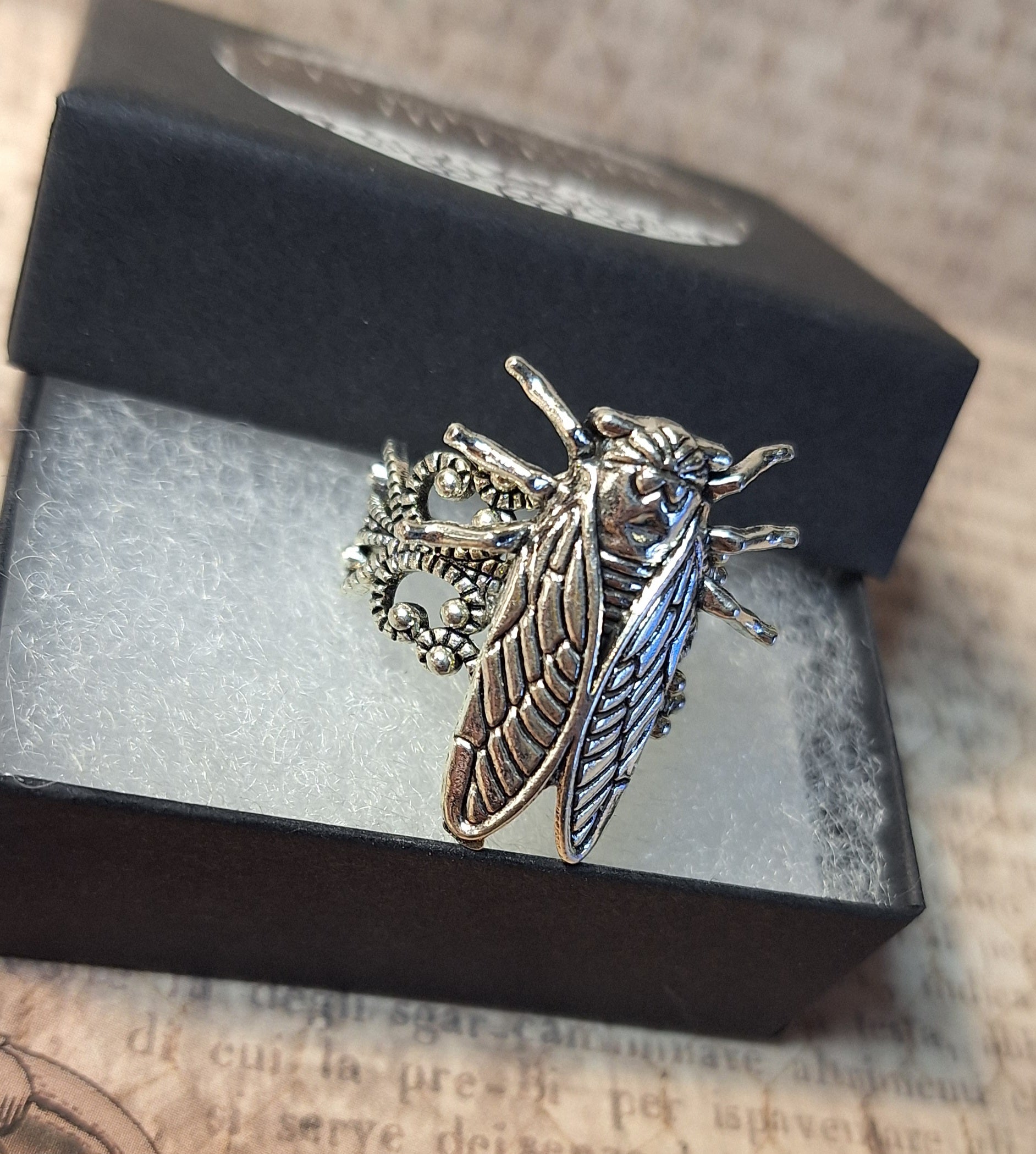 This unique ring features a cicada on a adjustable antique silver filigree ring.