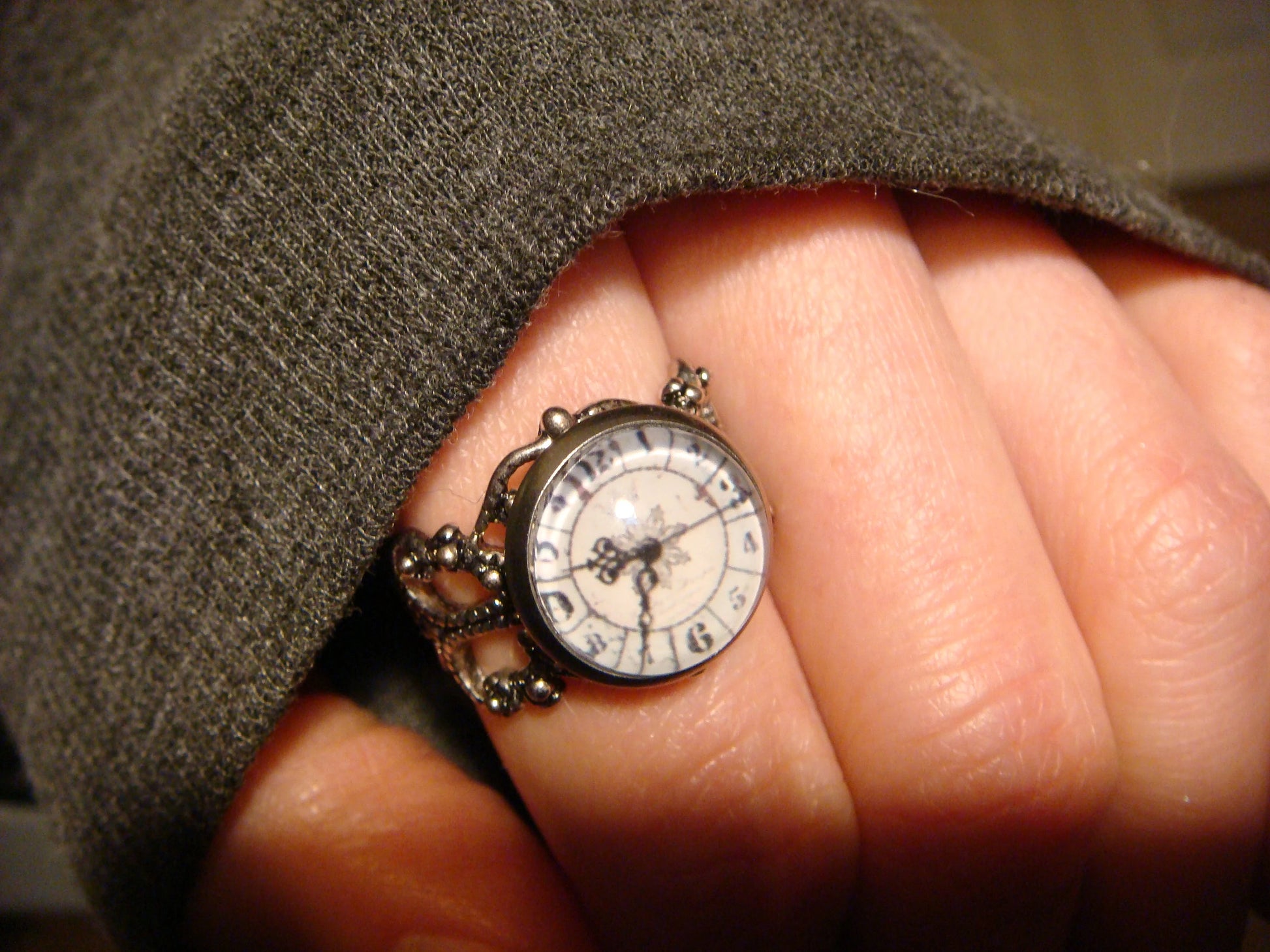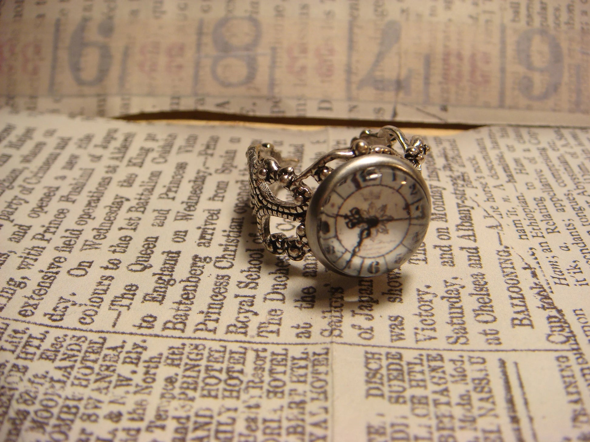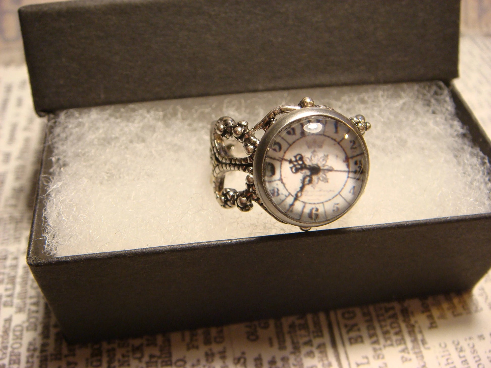 This beautiful ring features a vintage clock image cabochon set on a sturdy antique silver filigree Victorian style adjustable ring.