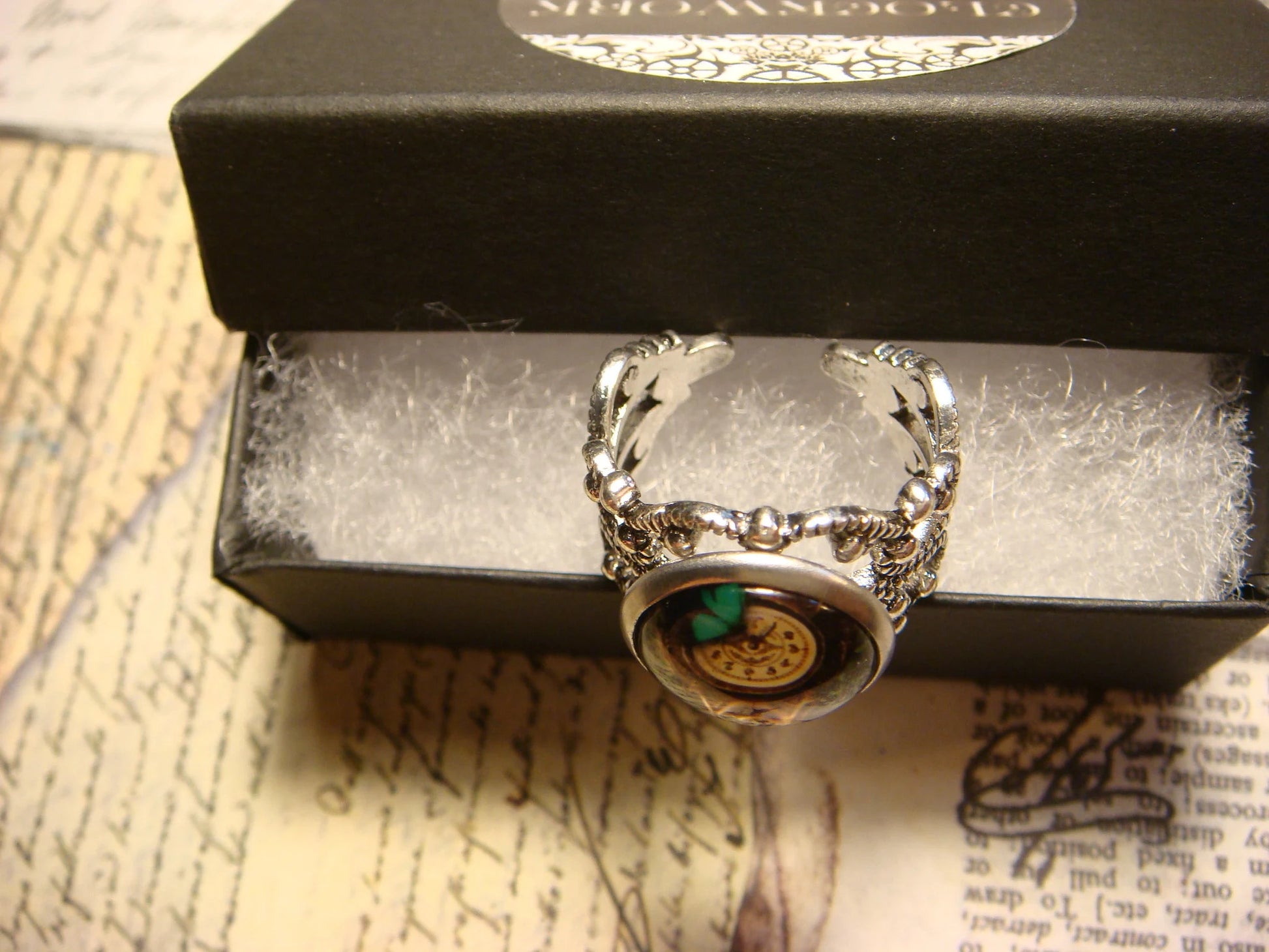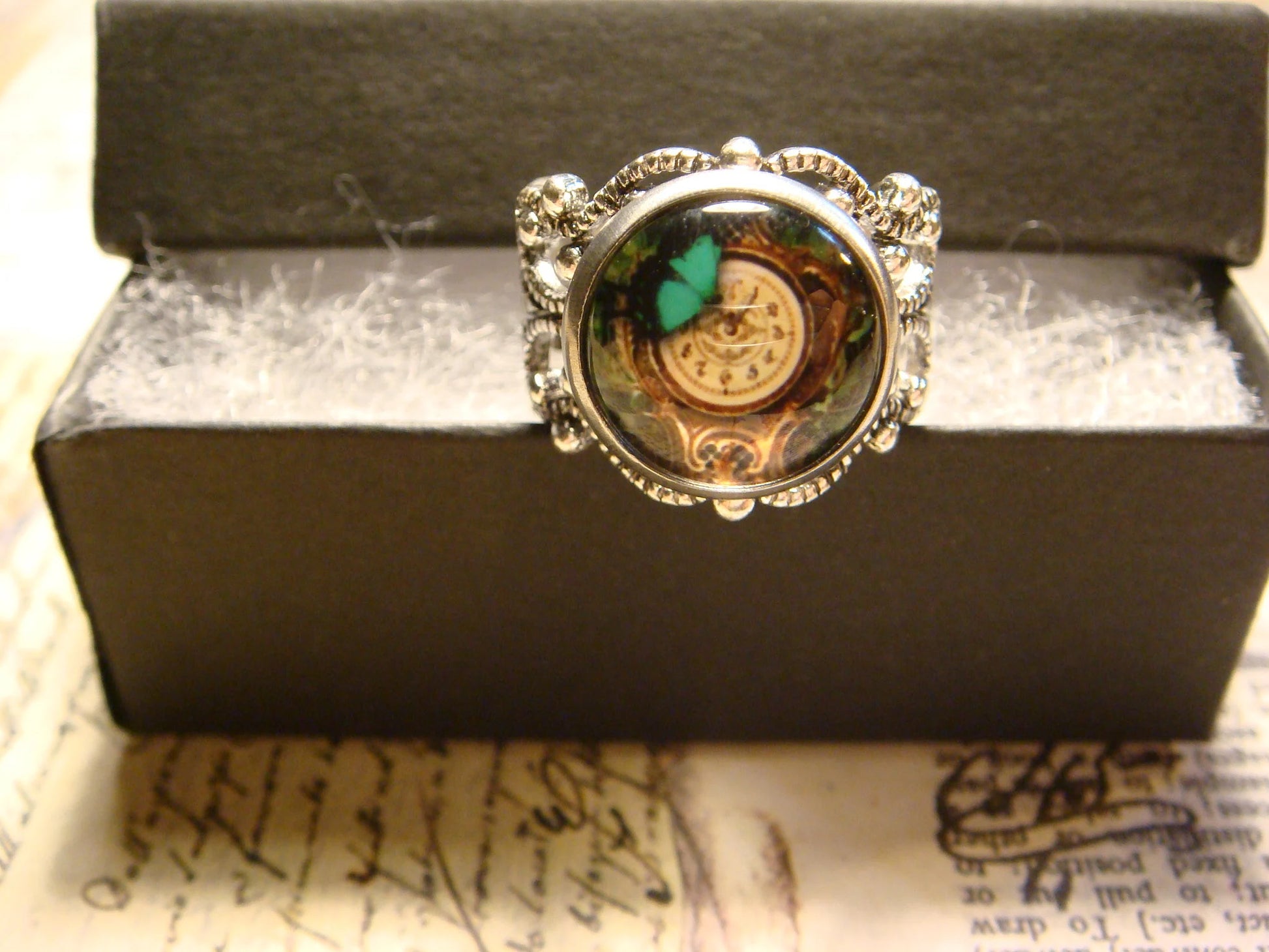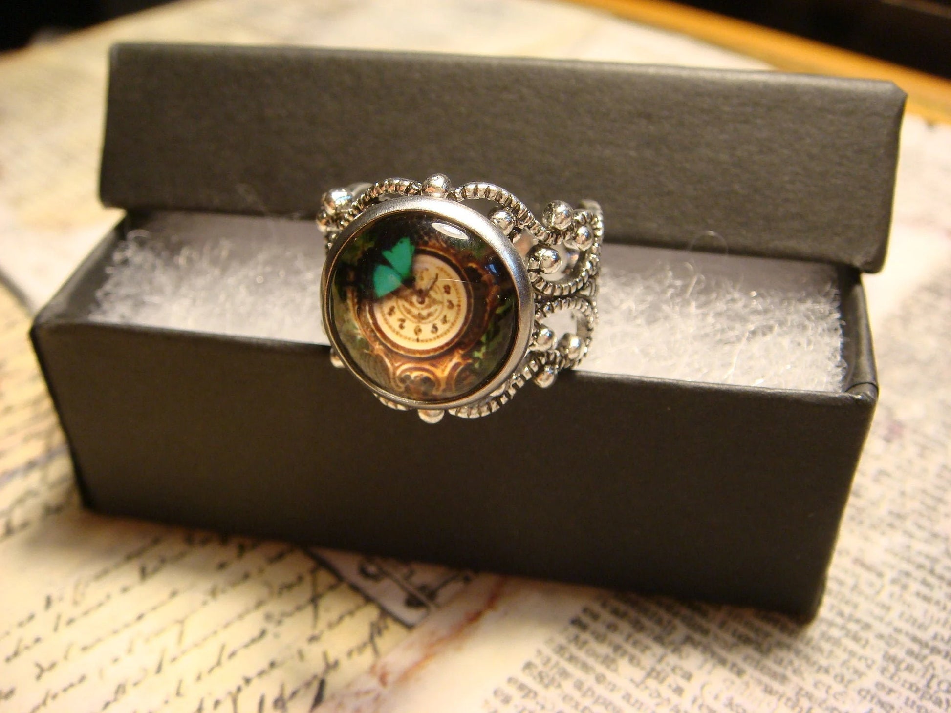 This beautiful ring features a vintage clock and butterfly image cabochon set on a sturdy antique silver filigree Victorian style adjustable ring.