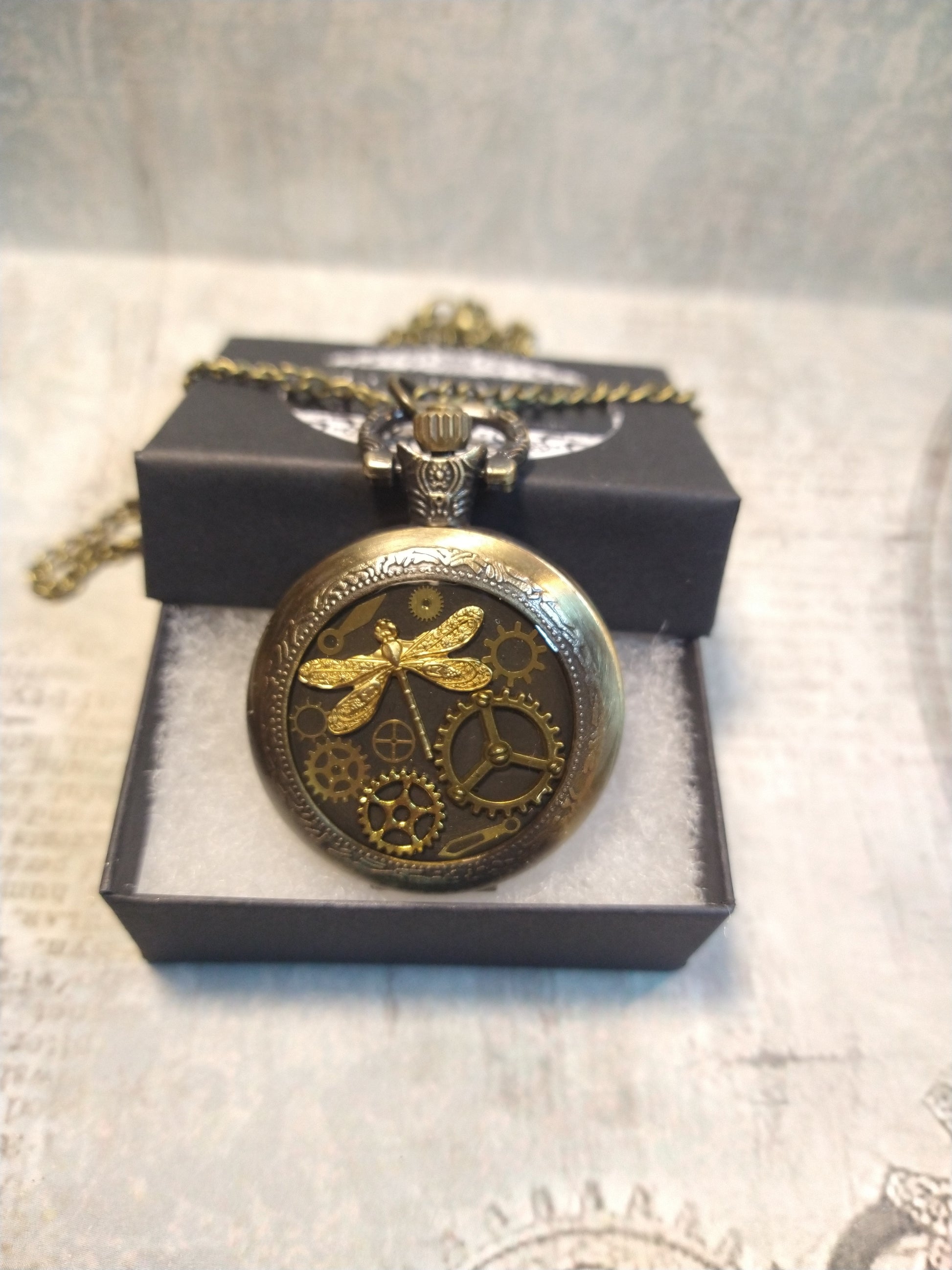 Handmade antique bronze functional pocket watch featuring a brass dragonfly and gears. Clock pendant measures approximately 2" long
