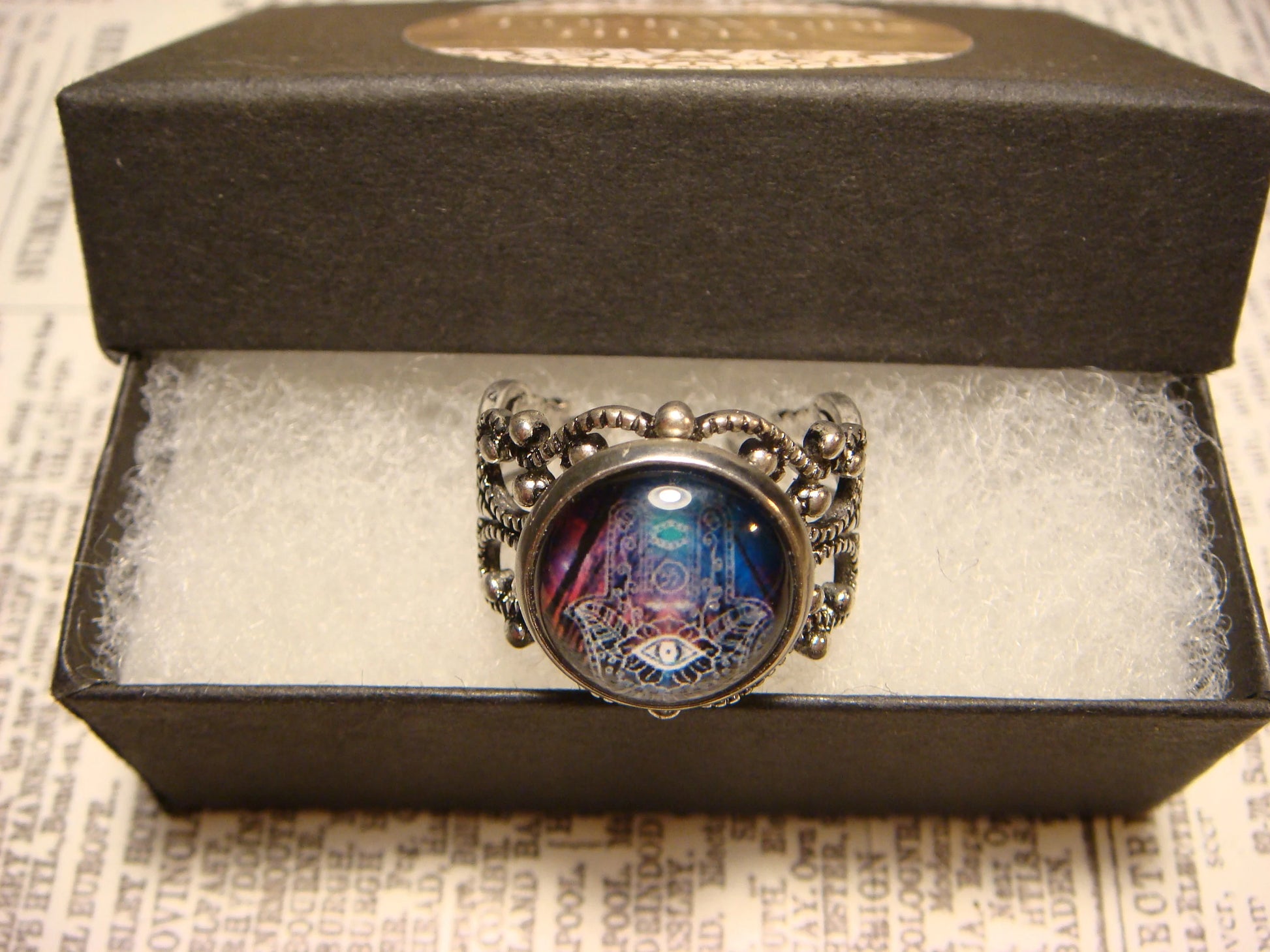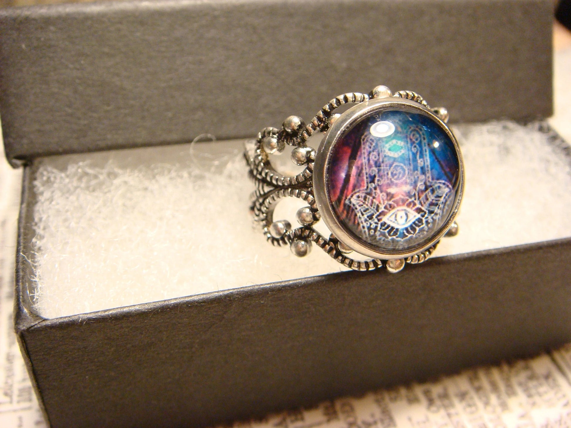 This beautiful ring features a colorful hamsa hand image cabochon set on a sturdy antique silver filigree Victorian style adjustable ring.