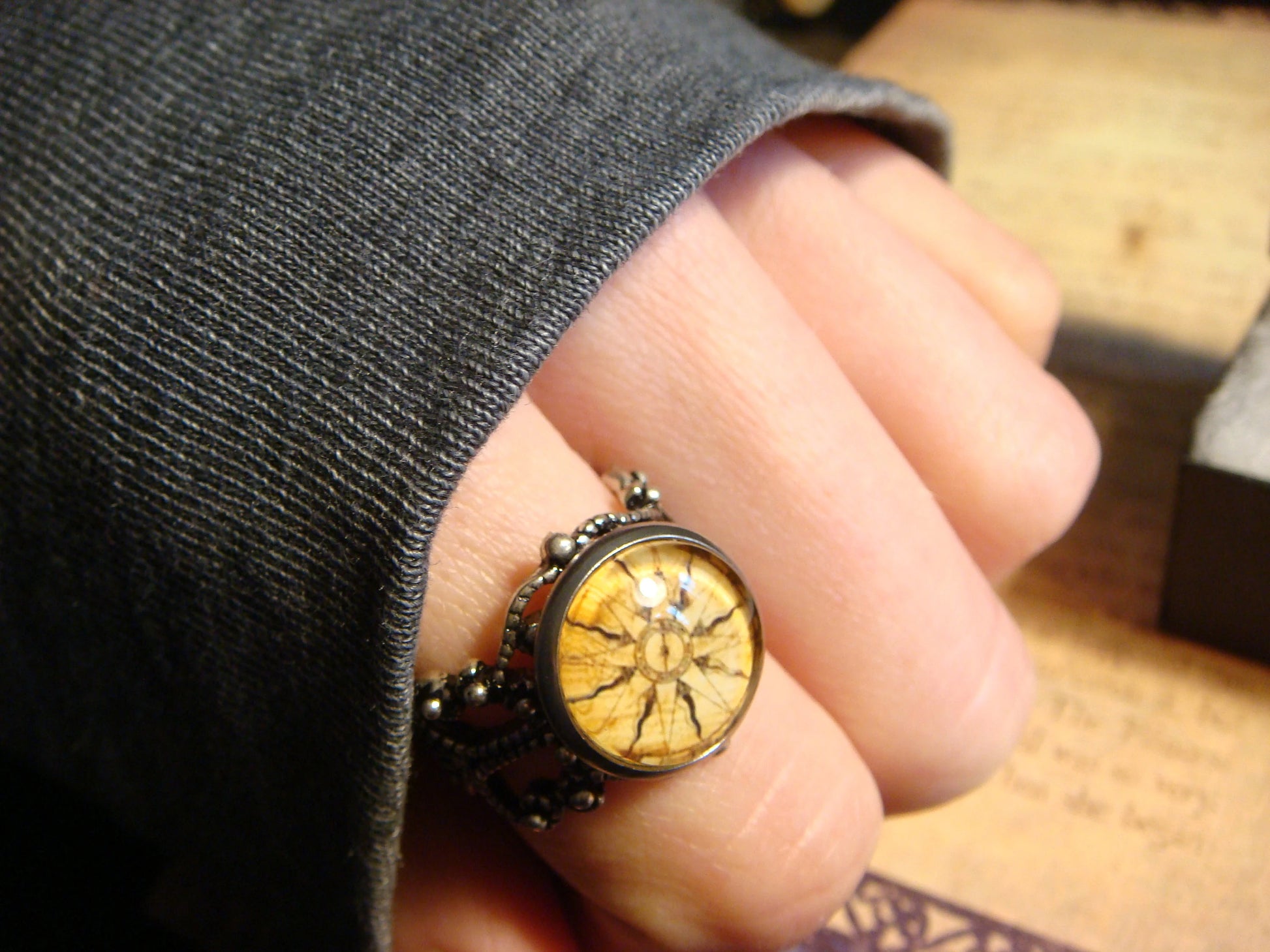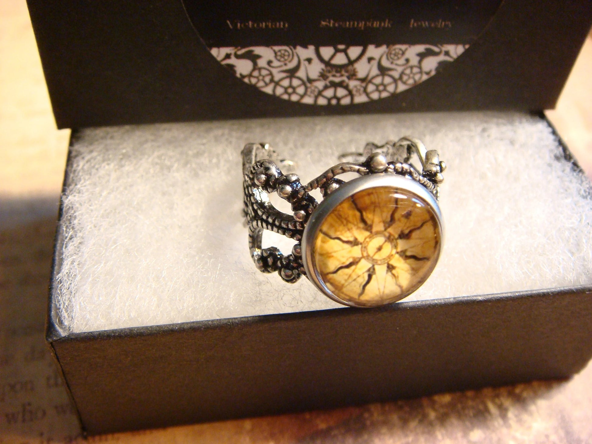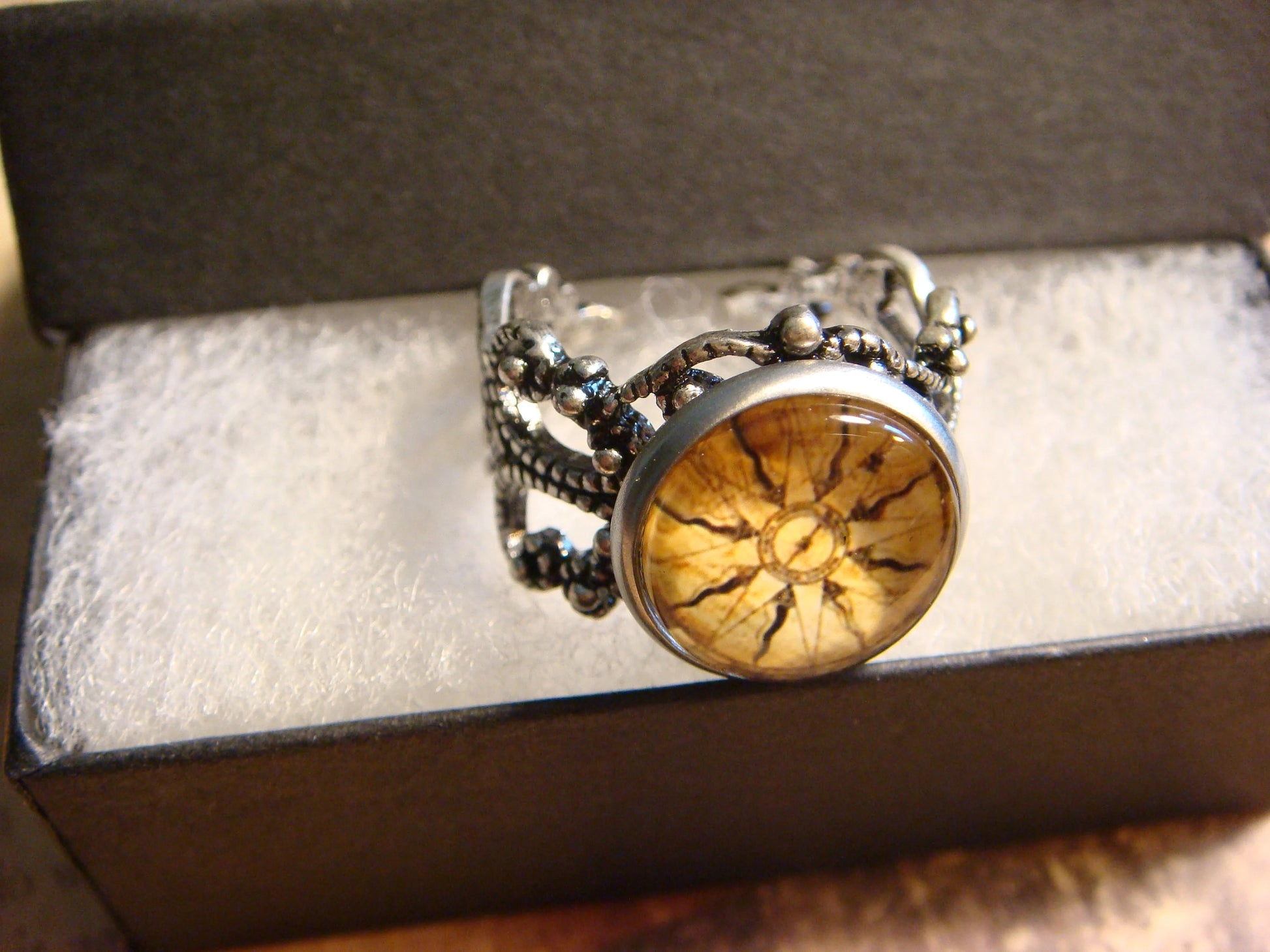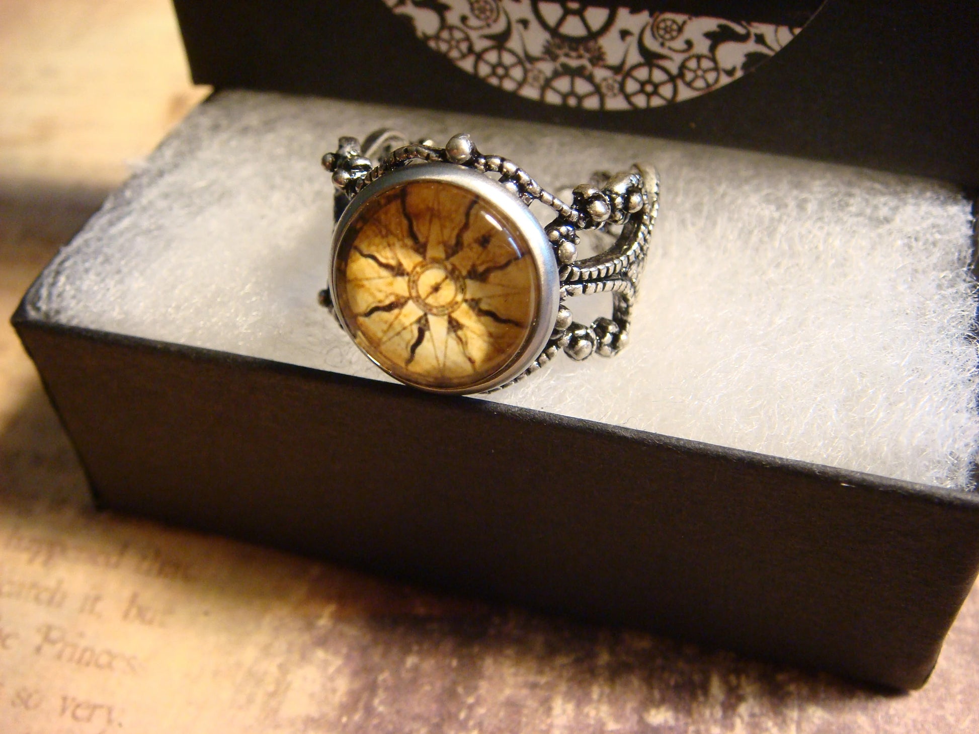 This beautiful ring features a vintage compass rose image cabochon set on a sturdy antique silver filigree Victorian style adjustable ring.