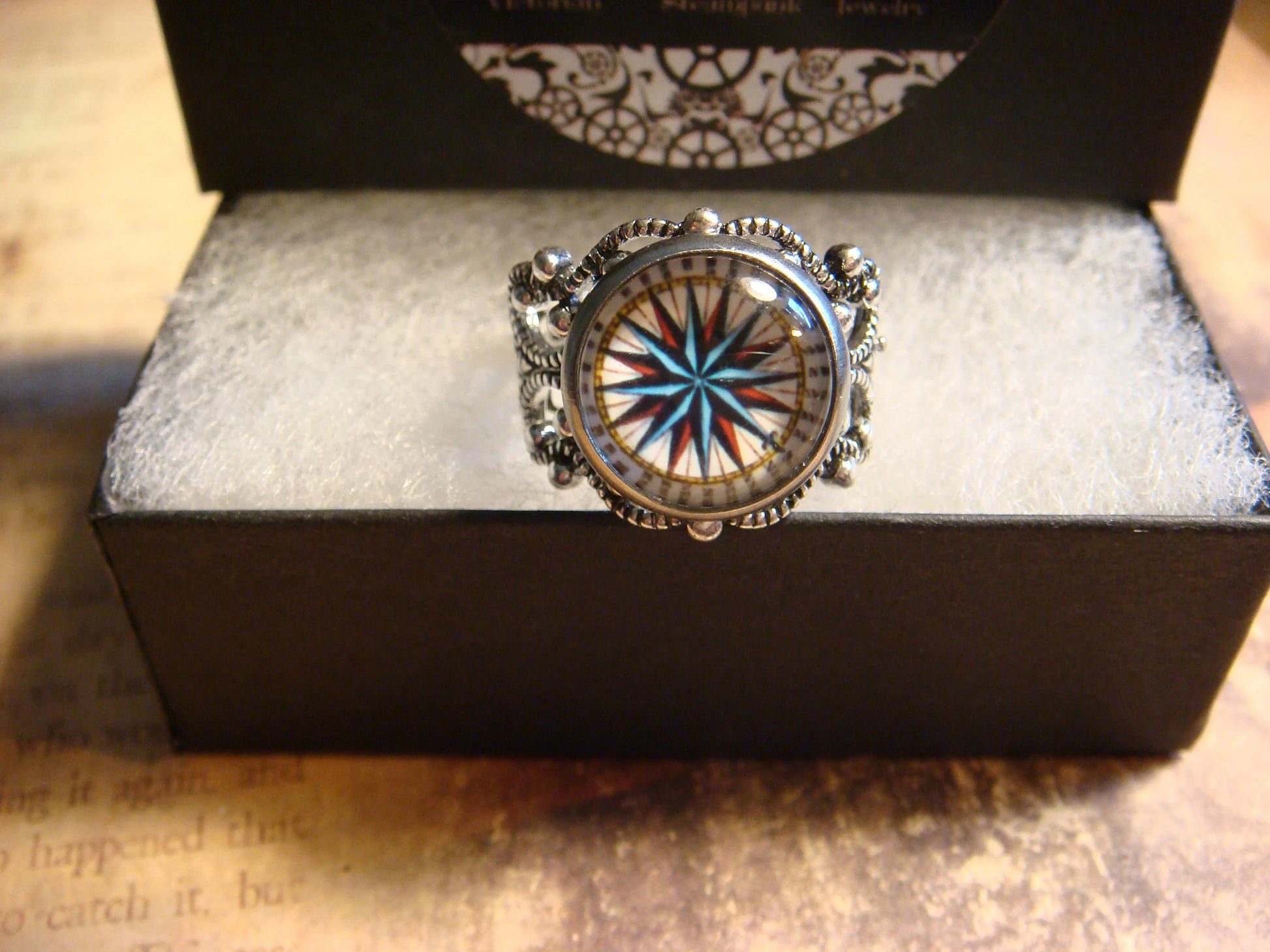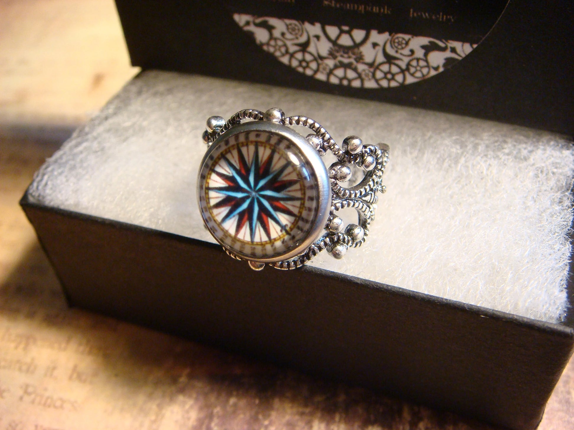 This beautiful ring features a compass star image cabochon set on a sturdy antique silver filigree Victorian style adjustable ring.