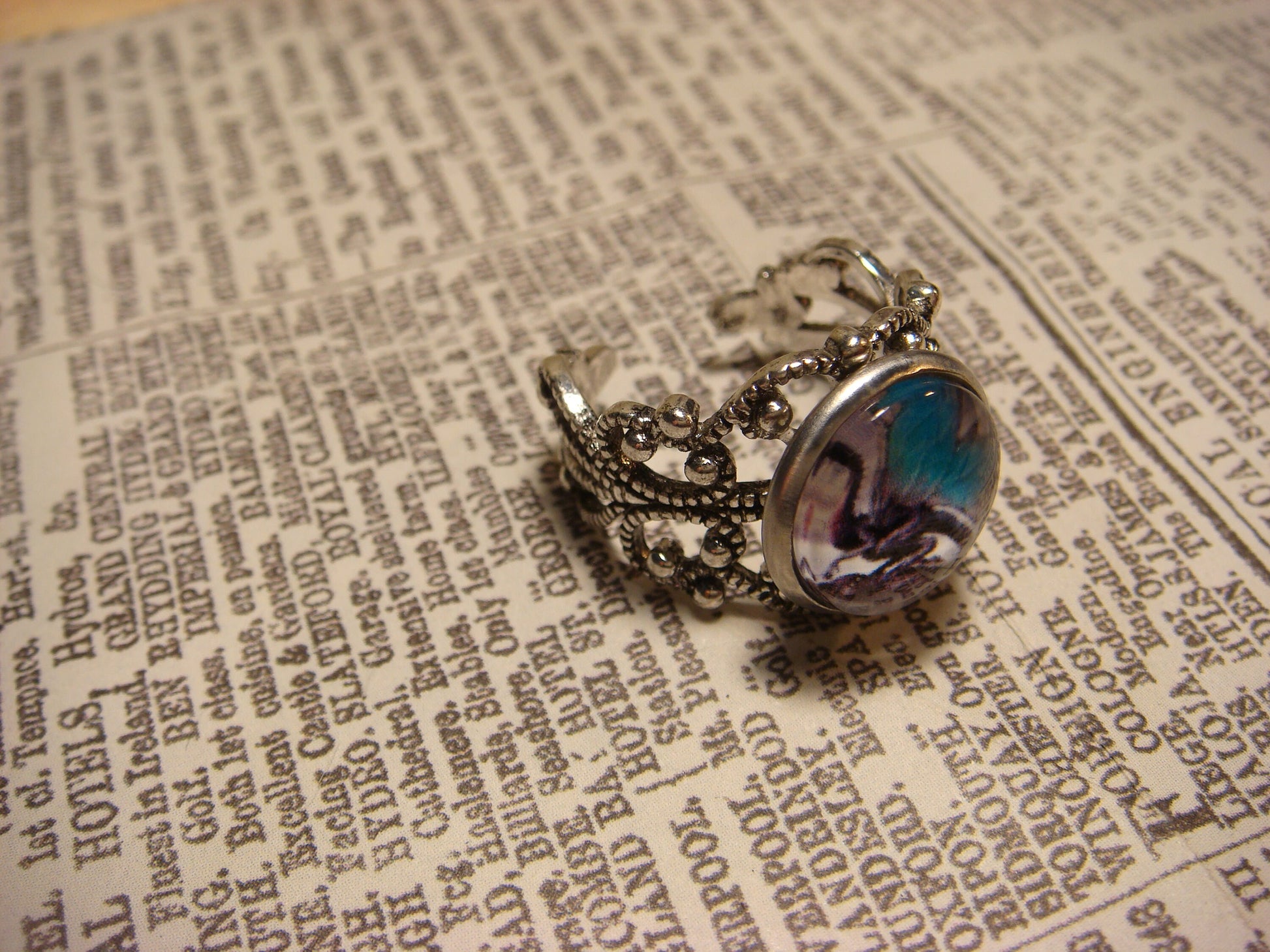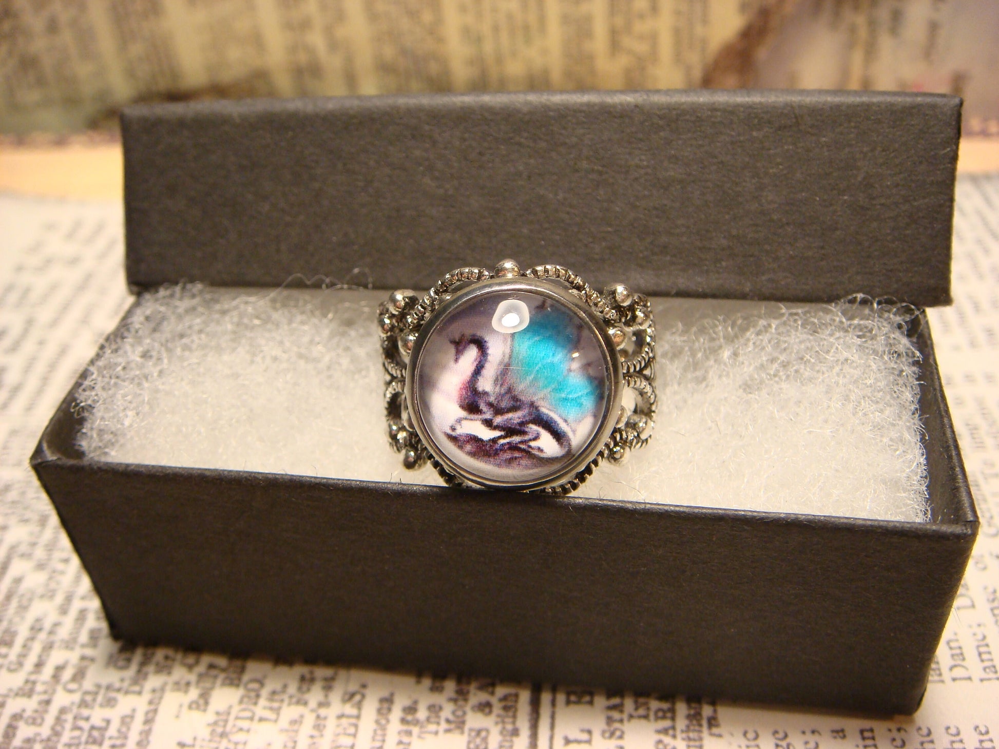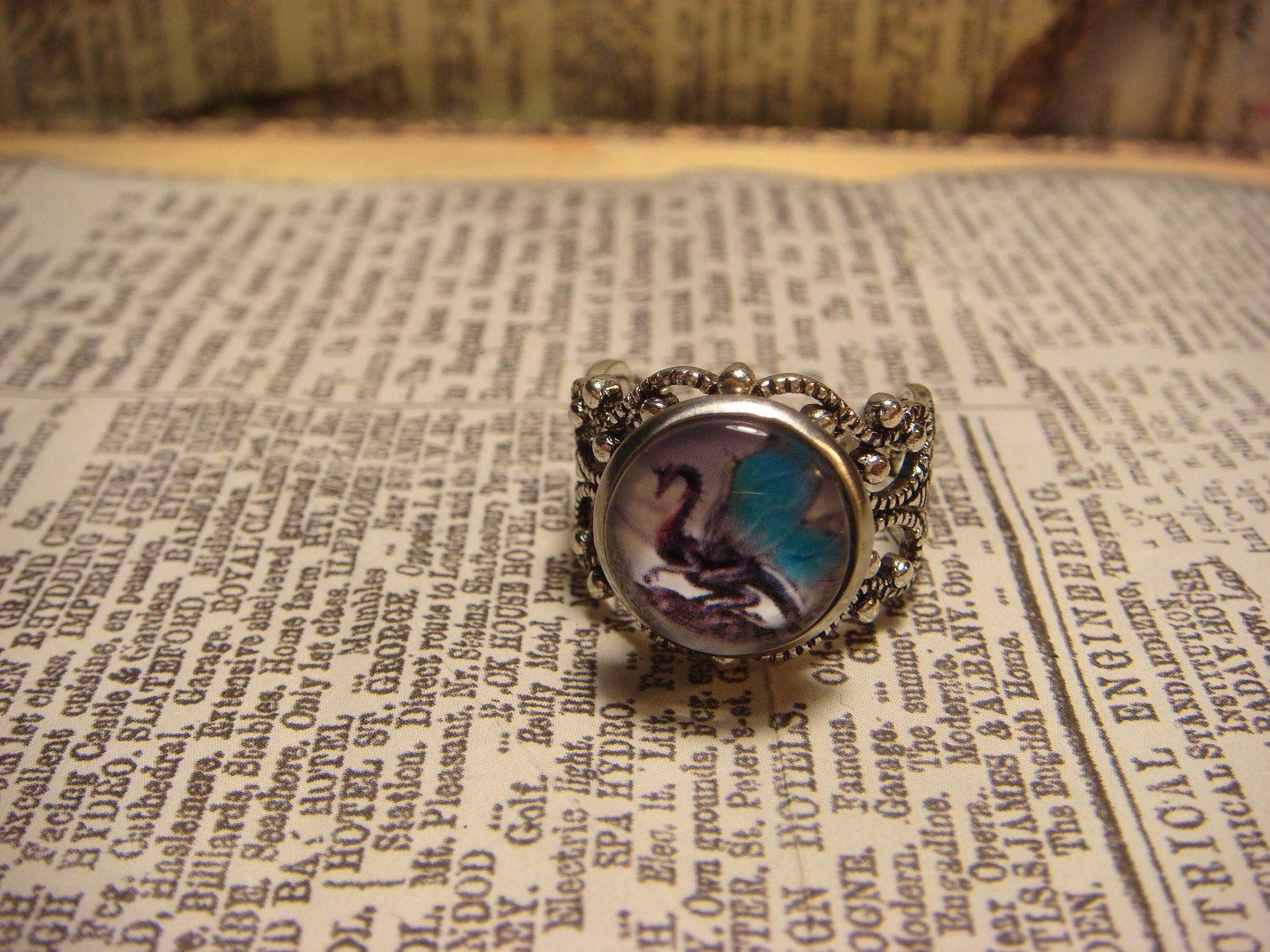 This beautiful ring features a dragon with gossamer wings image cabochon set on a sturdy antique silver filigree Victorian style adjustable ring.