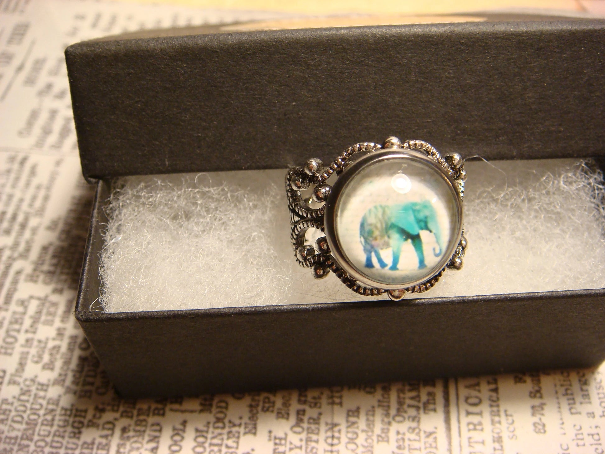 This beautiful ring features an elephant image cabochon set on a sturdy antique silver filigree Victorian style adjustable ring.