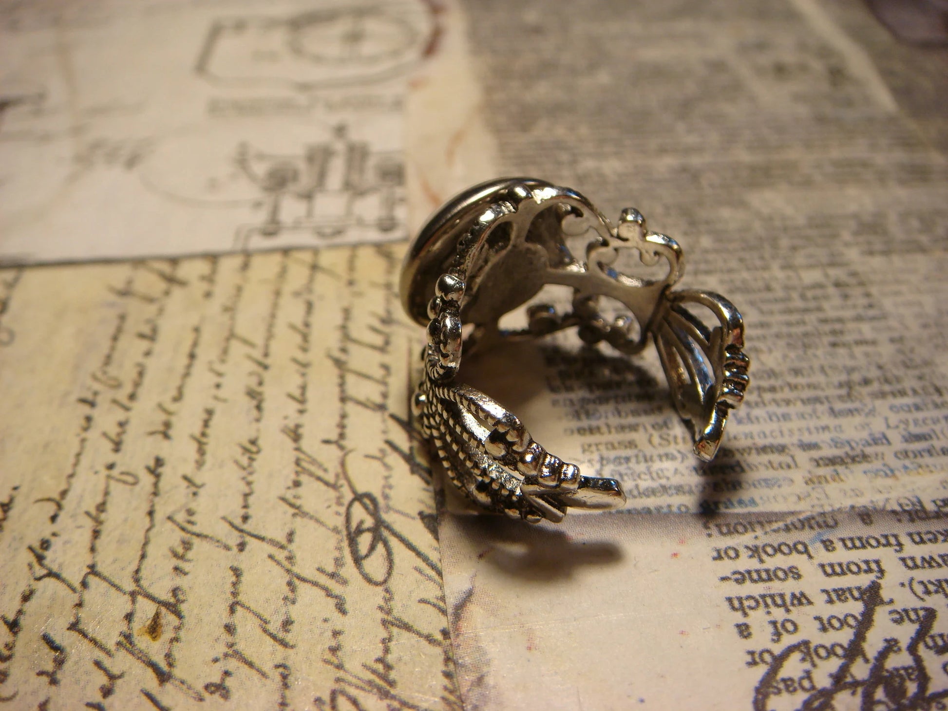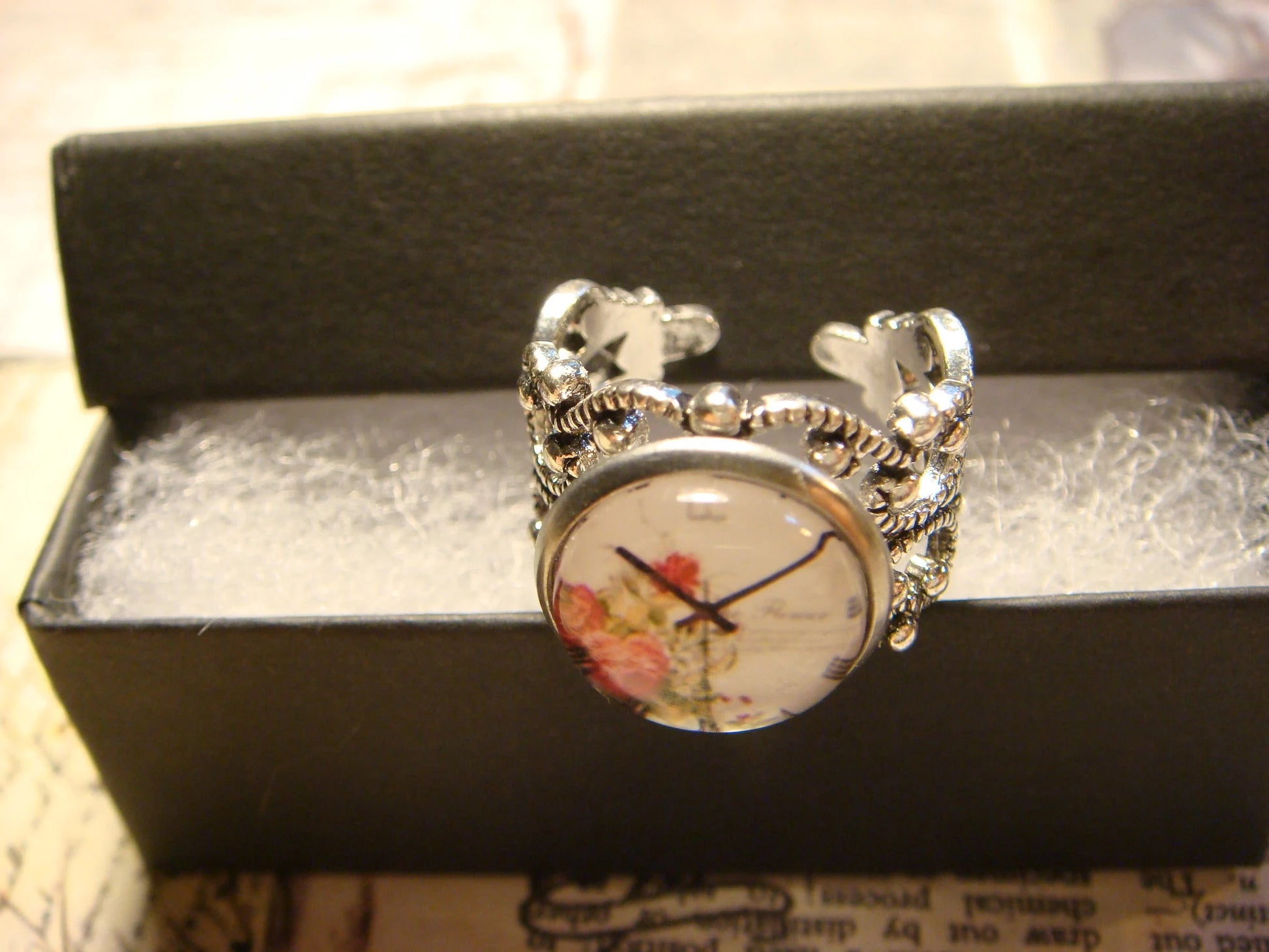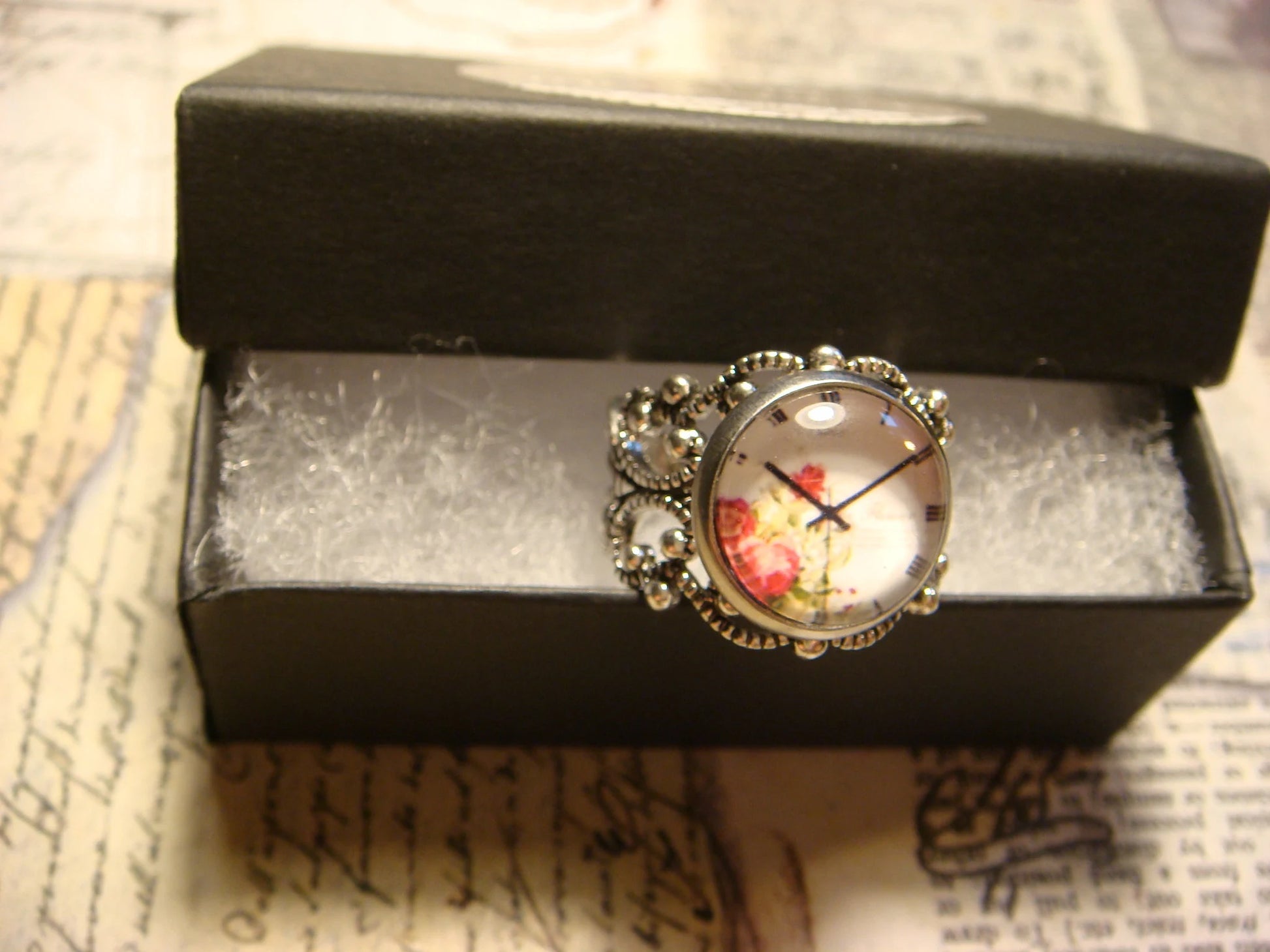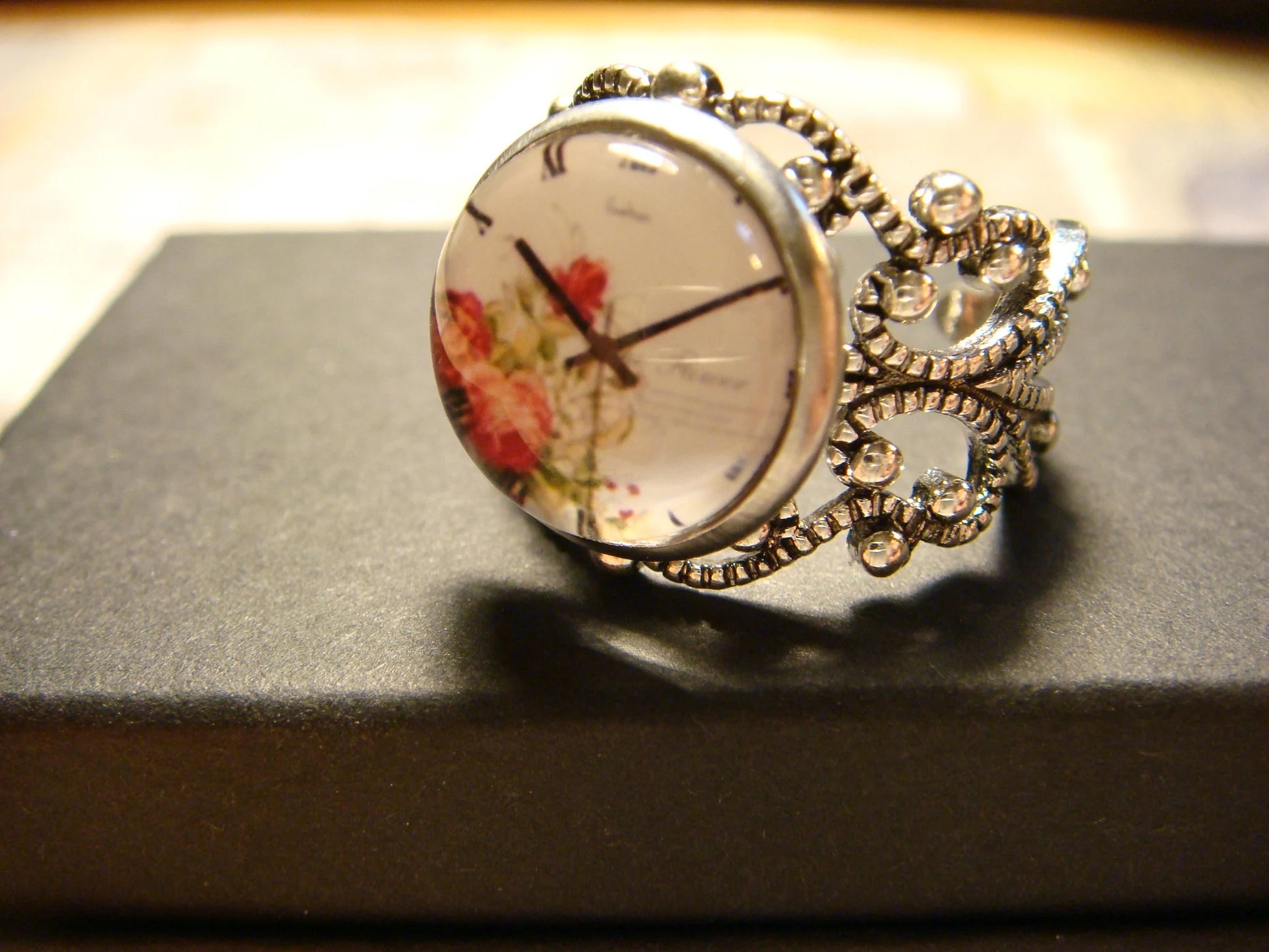 This beautiful ring features a floral clock image cabochon set on a sturdy antique silver filigree Victorian style adjustable ring.