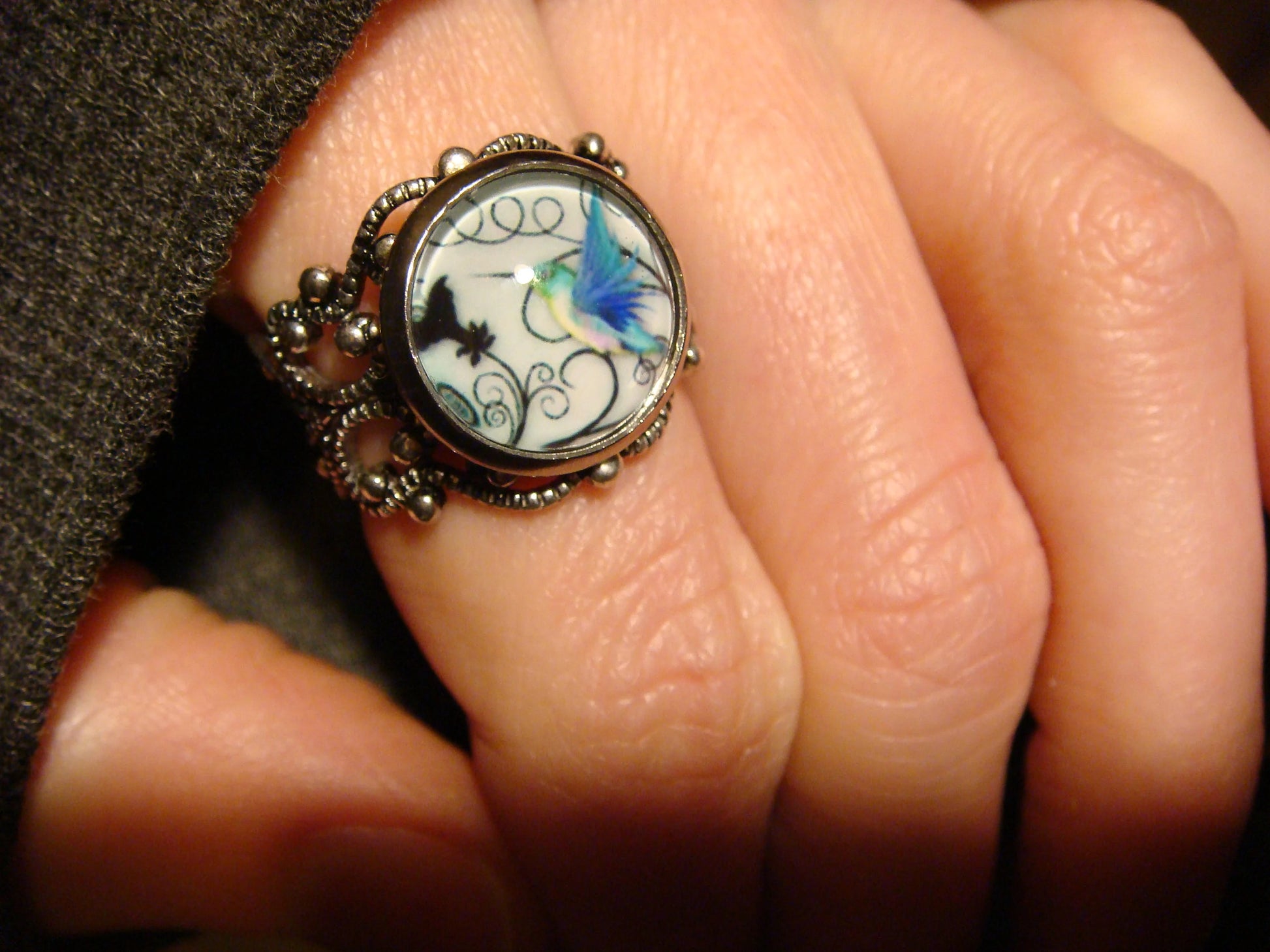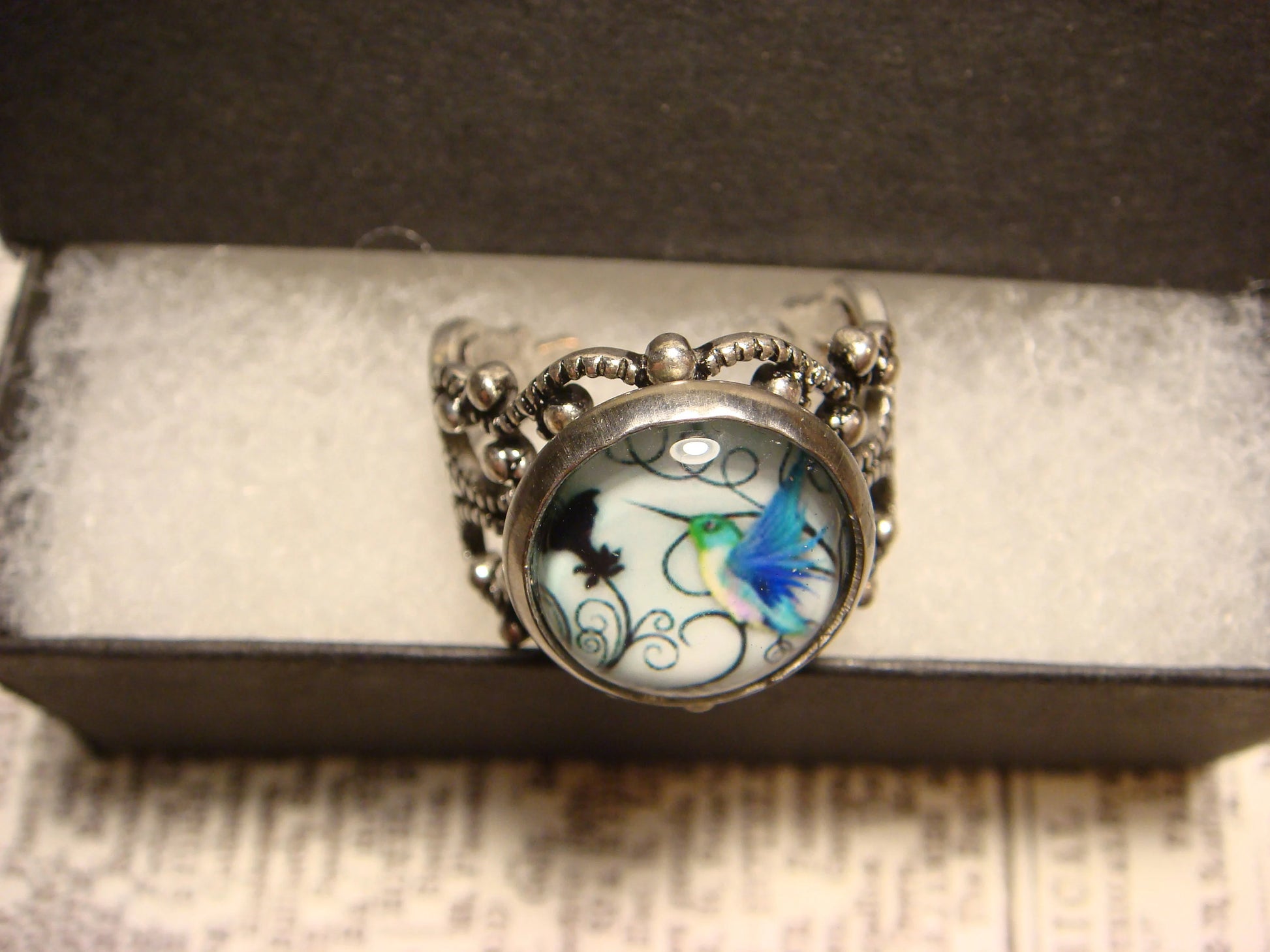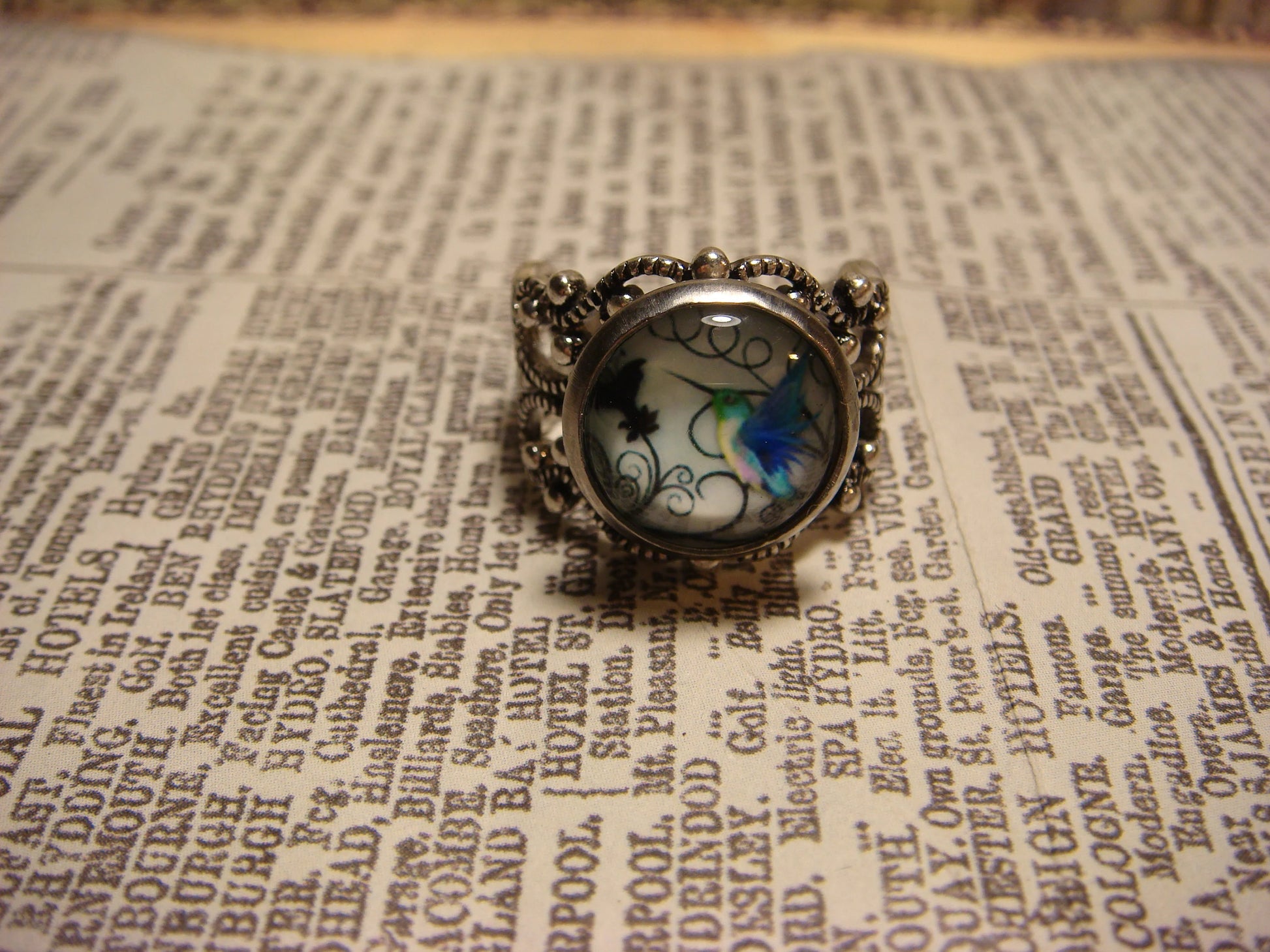 This beautiful ring features a hummingbird image cabochon set on a sturdy antique silver filigree Victorian style adjustable ring.
