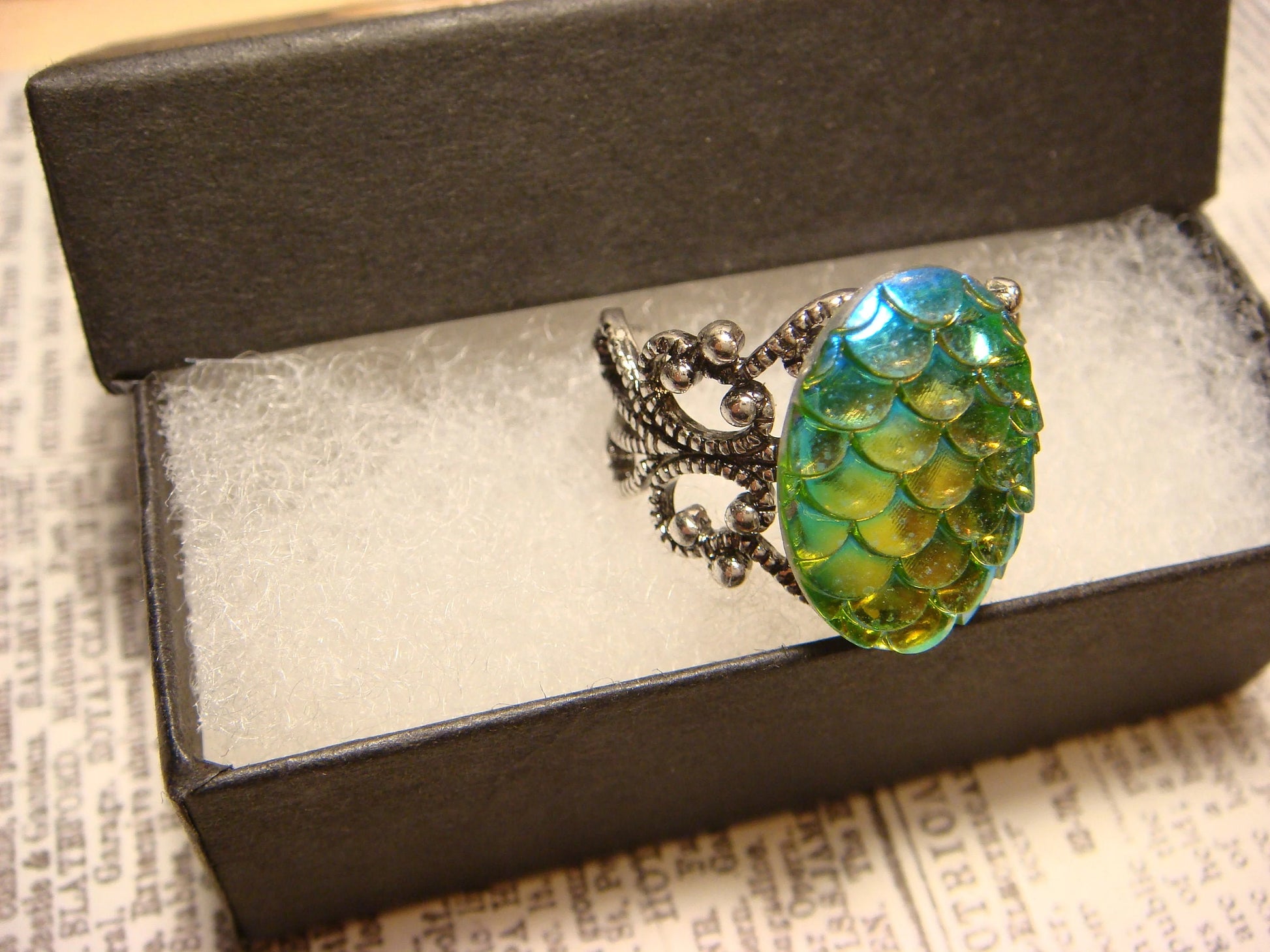 This beautiful ring features oval iridescent mermaid / dragon scale cabochons set on a sturdy antique silver filigree Victorian style adjustable ring.