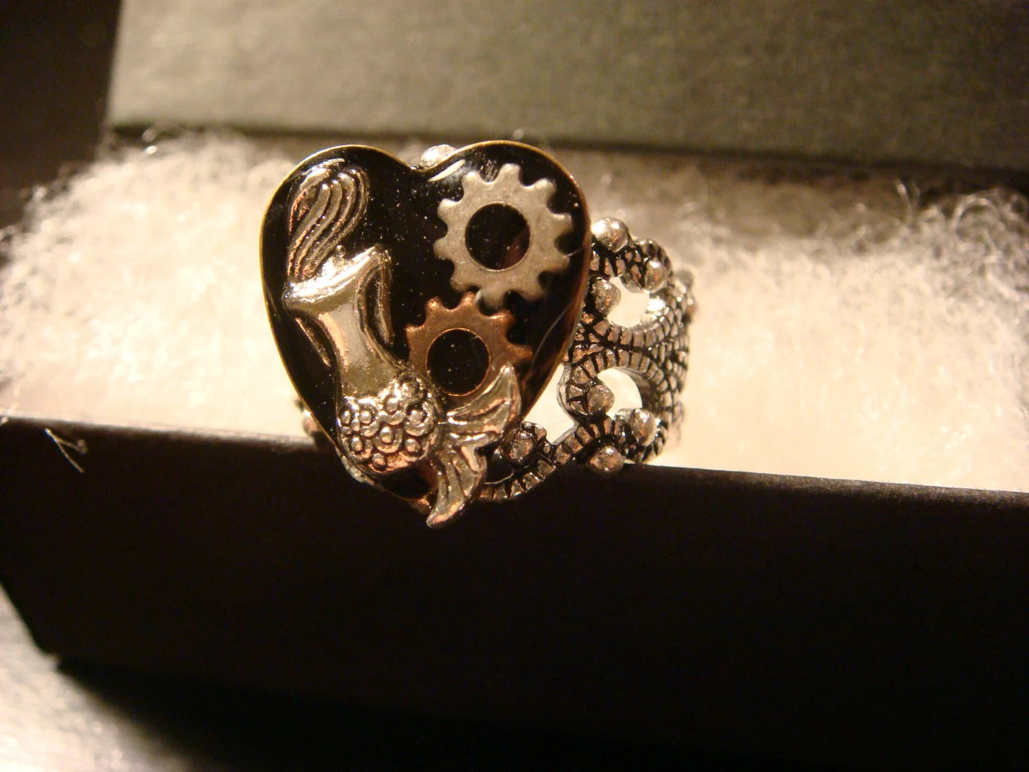 This beautiful steampunk ring features an antique silver mermaid and craft gears on a black background in a heart-shaped bezel and set on a sturdy antique silver filigree Victorian style adjustable ring.