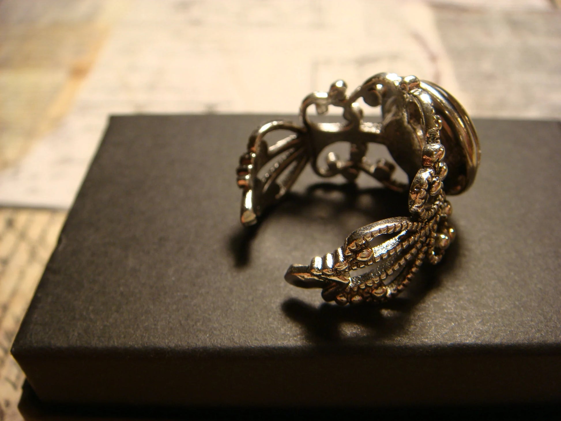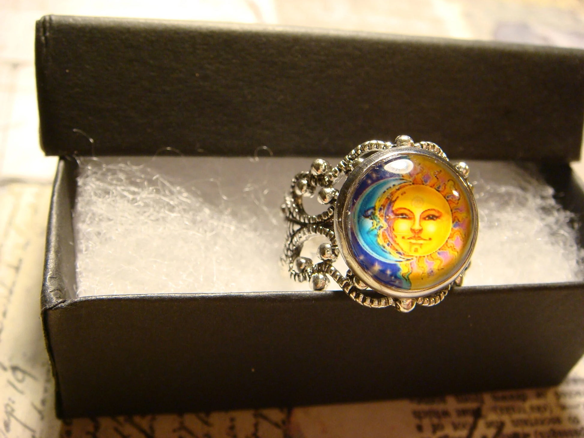 This beautiful ring features a moon and sun image cabochon set on a sturdy antique silver filigree Victorian style adjustable ring.