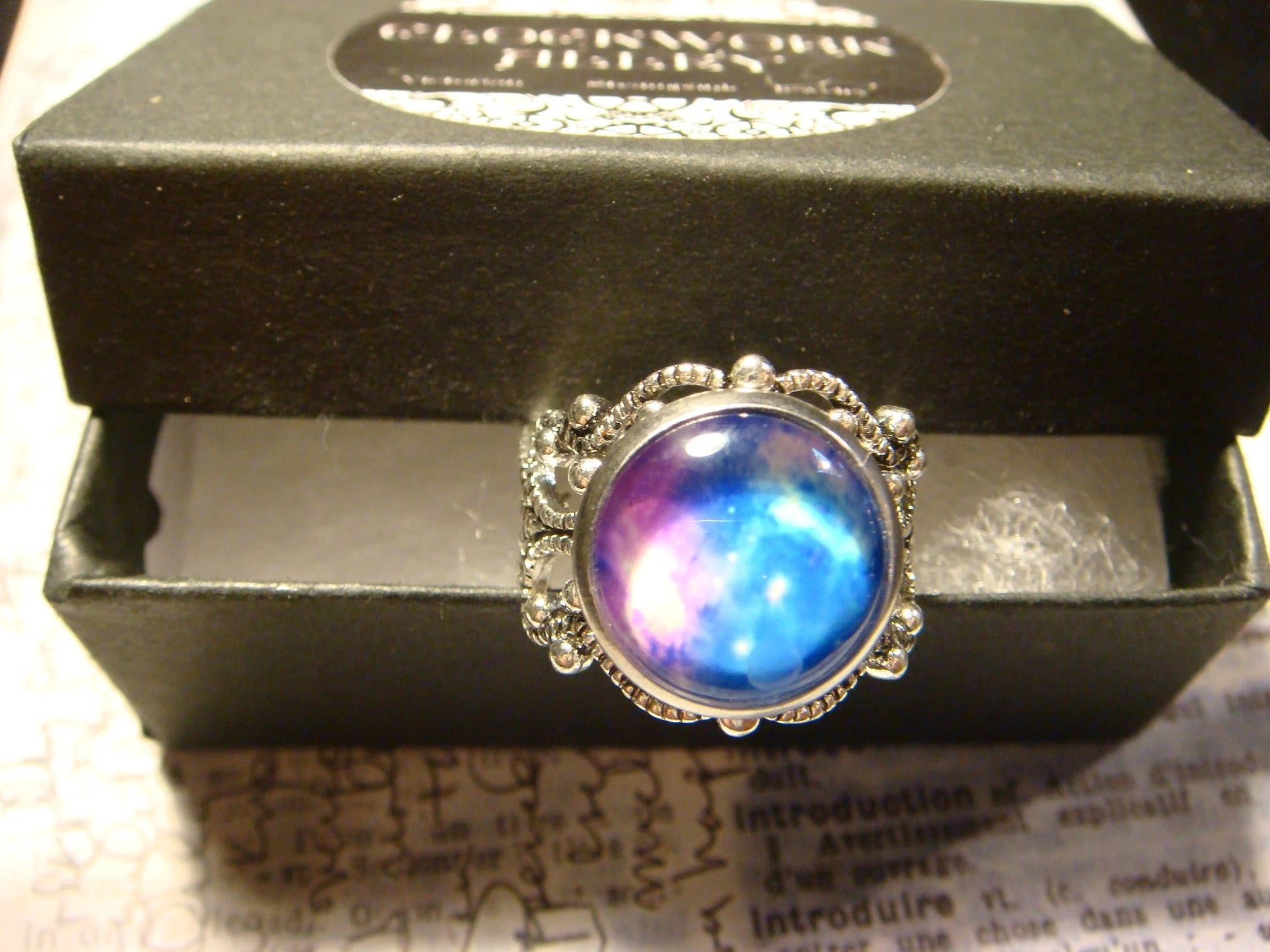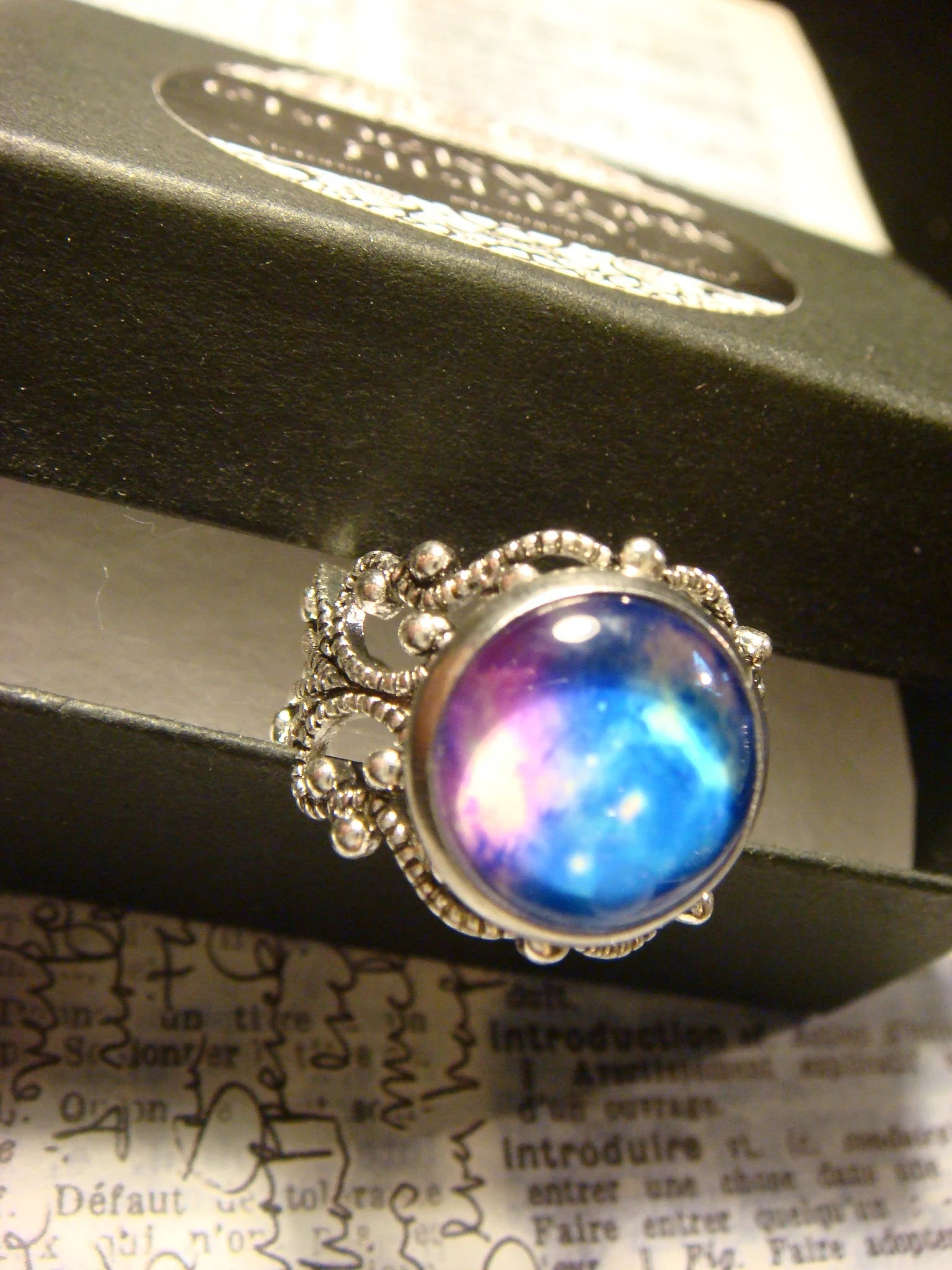 This beautiful ring features a nebula / galaxy image cabochon set on a sturdy antique silver filigree Victorian style adjustable ring.
