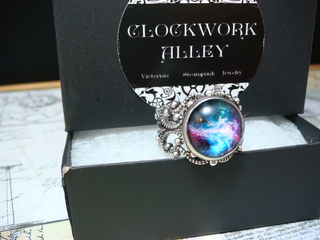 This beautiful ring features a galaxy / nebula image cabochon set on a sturdy antique silver filigree Victorian style adjustable ring.