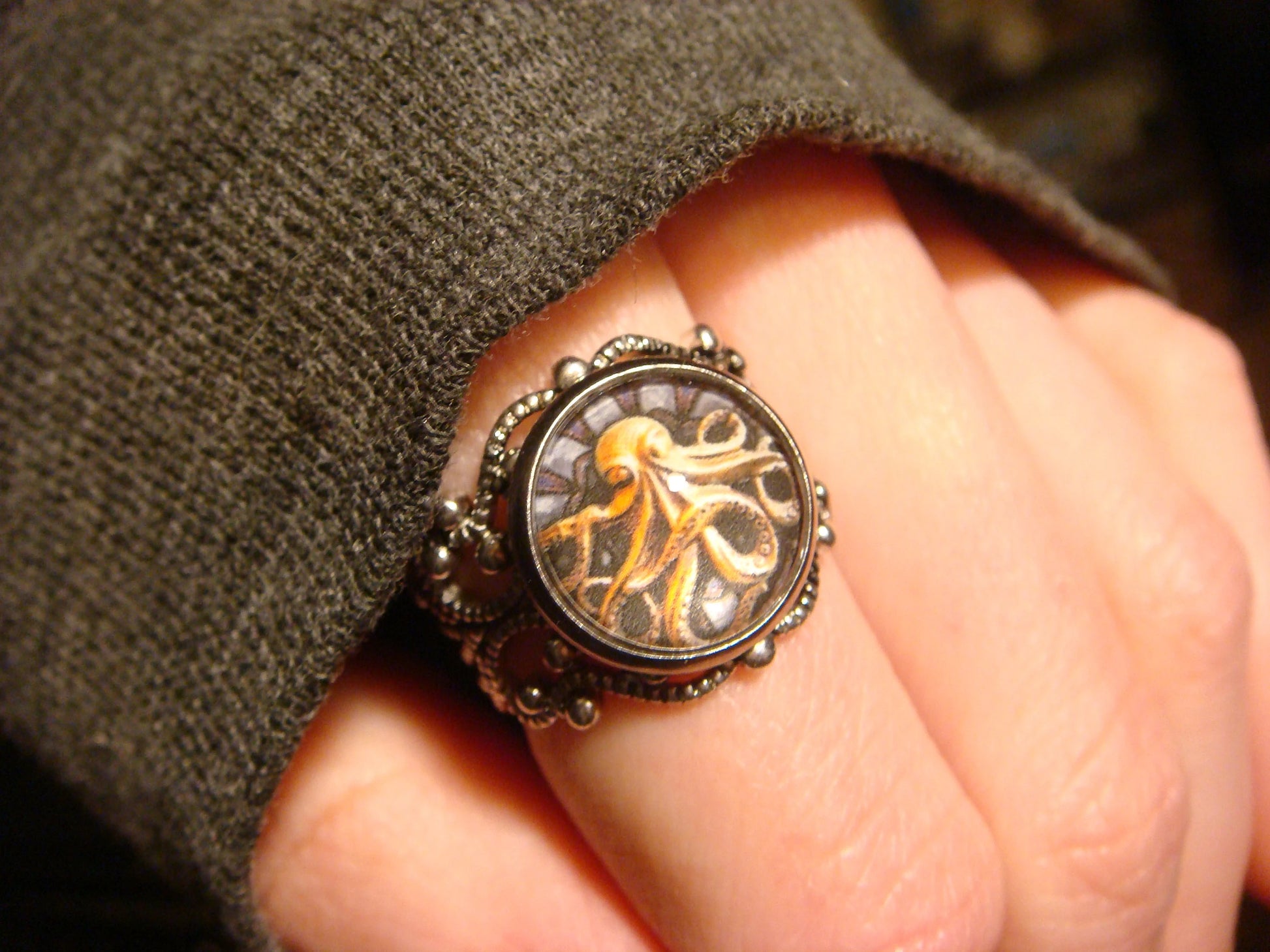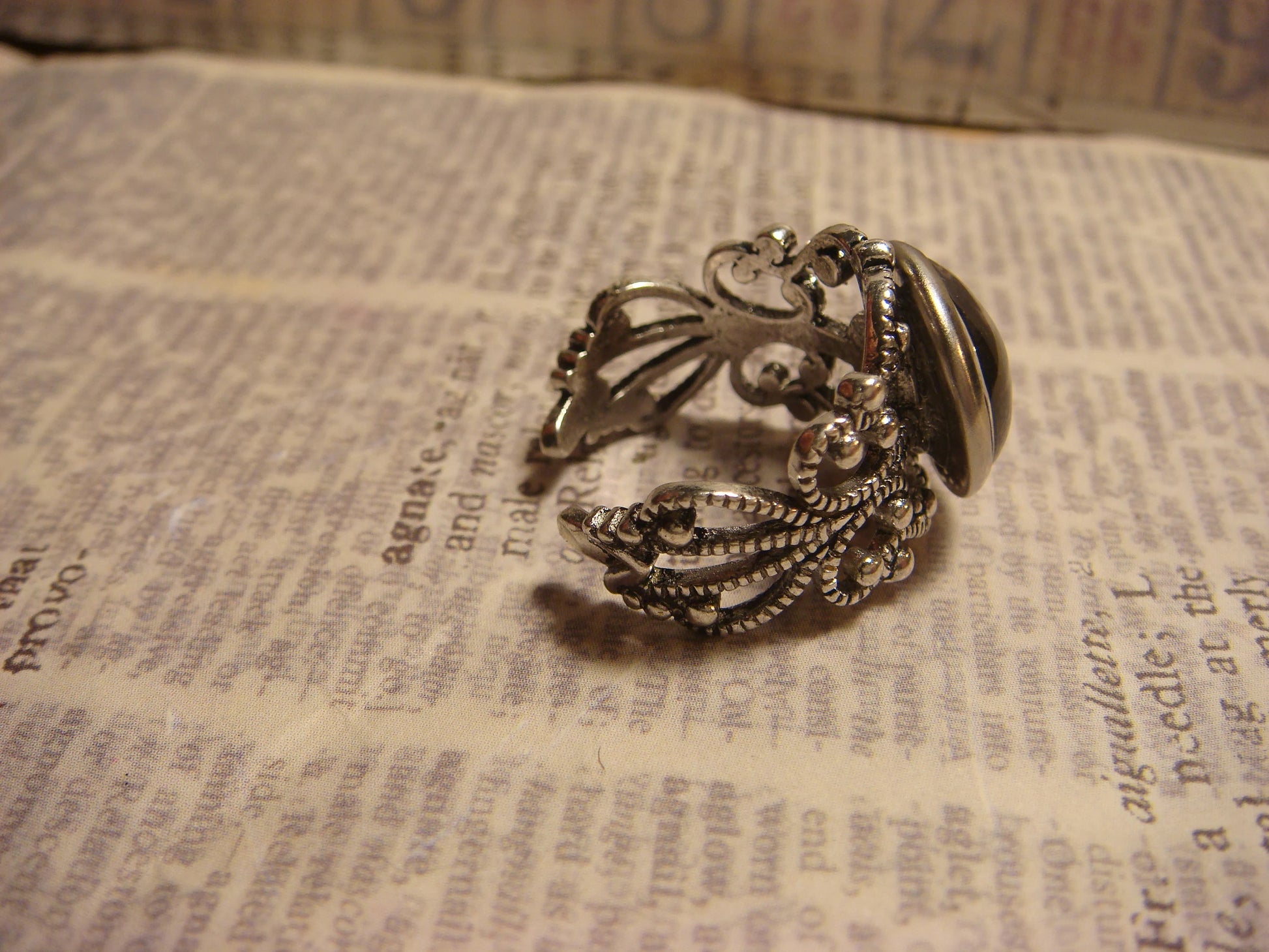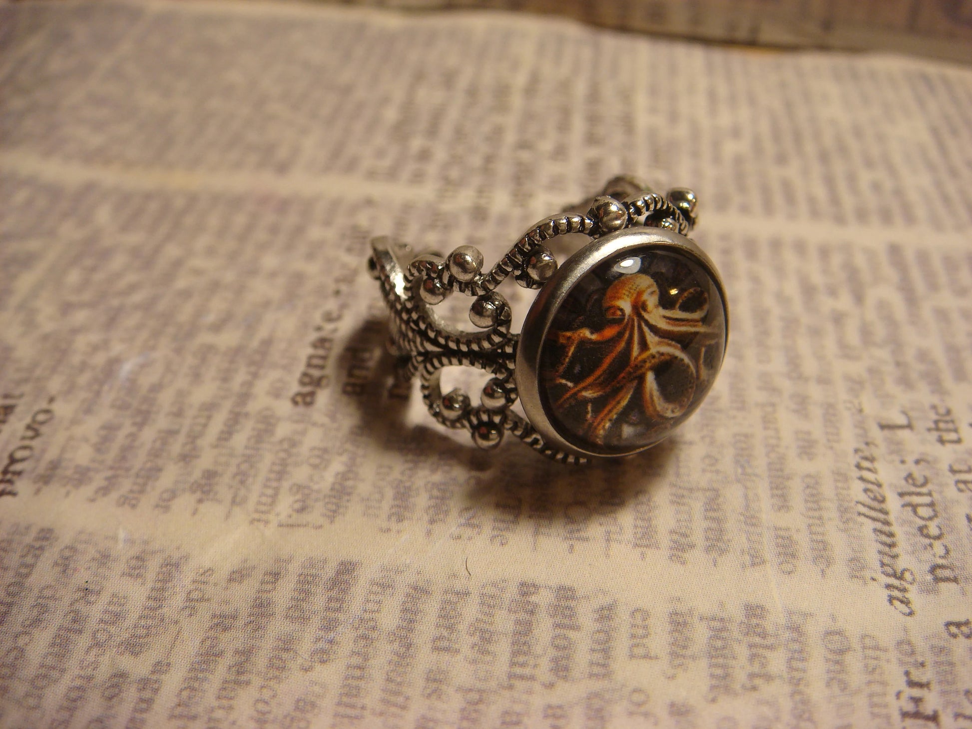 This beautiful ring features an octopus image cabochon set on a sturdy antique silver filigree Victorian style adjustable ring.