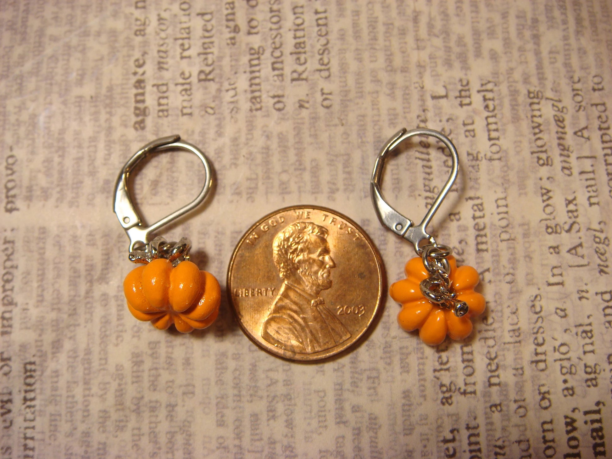 These earrings are made with orange enamel pumpkins hanging on stainless steel lever back earrings.