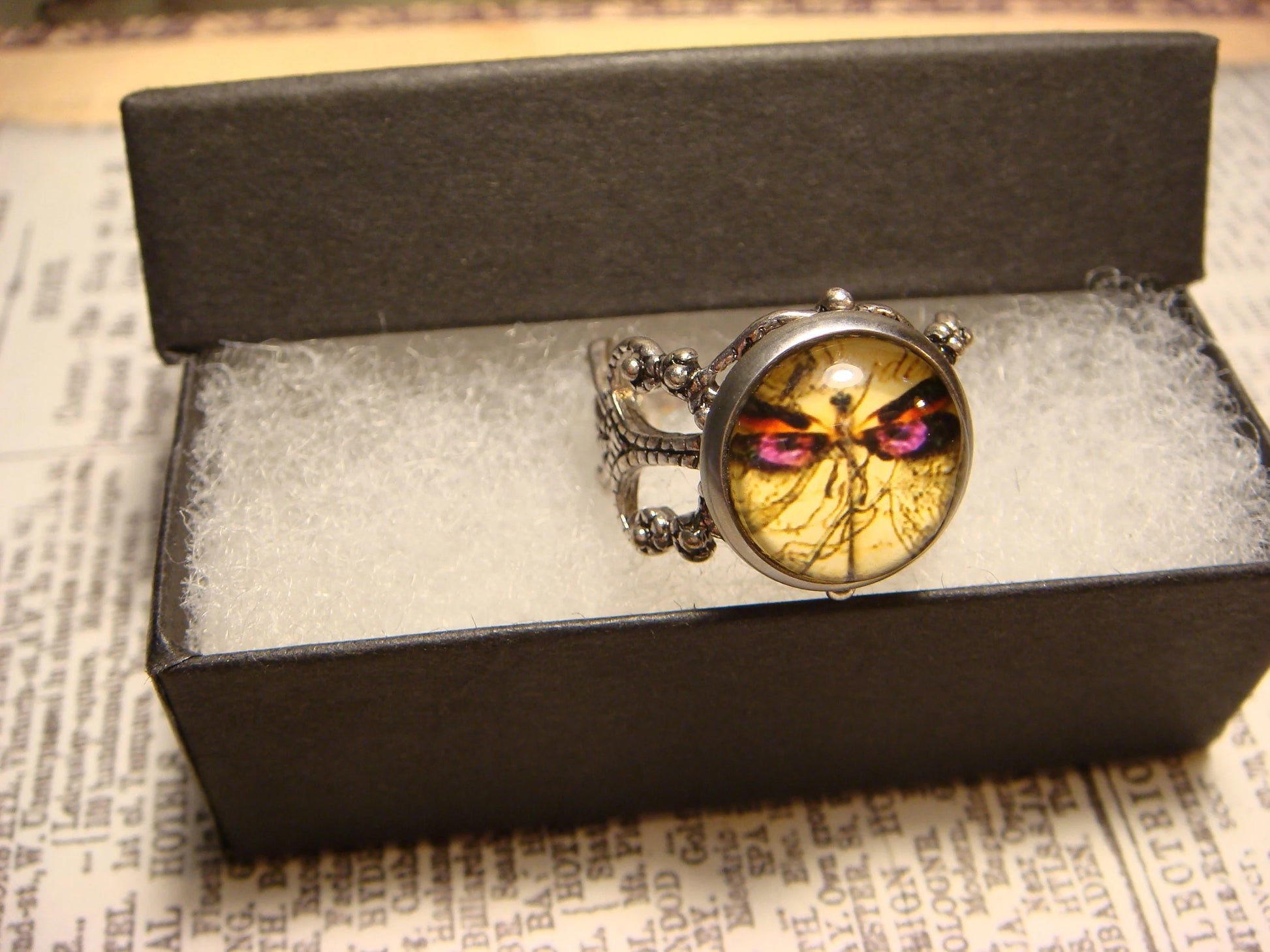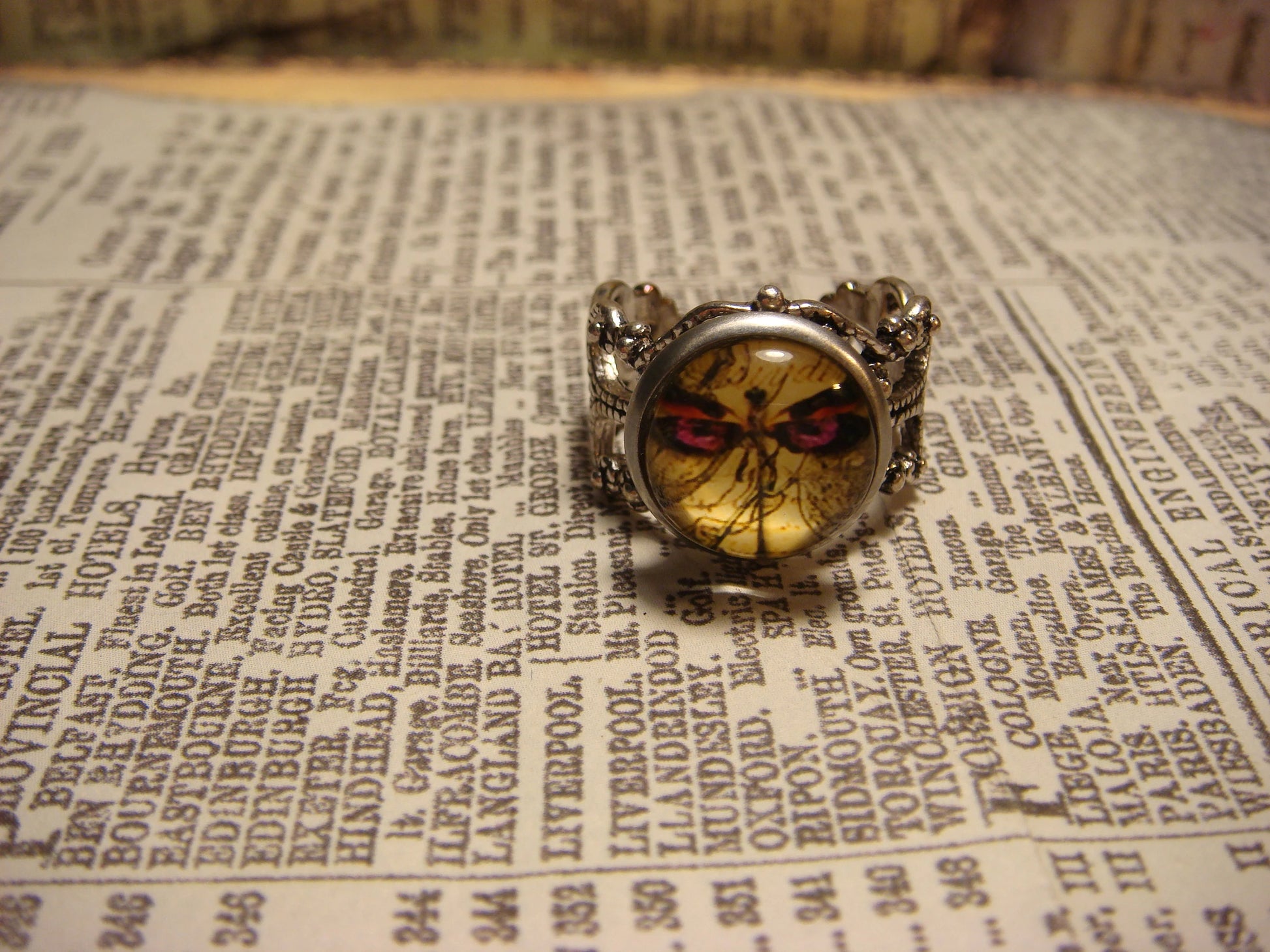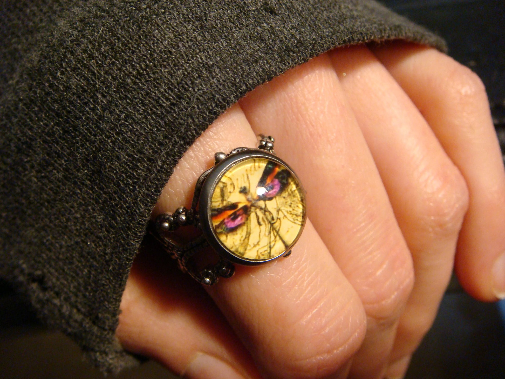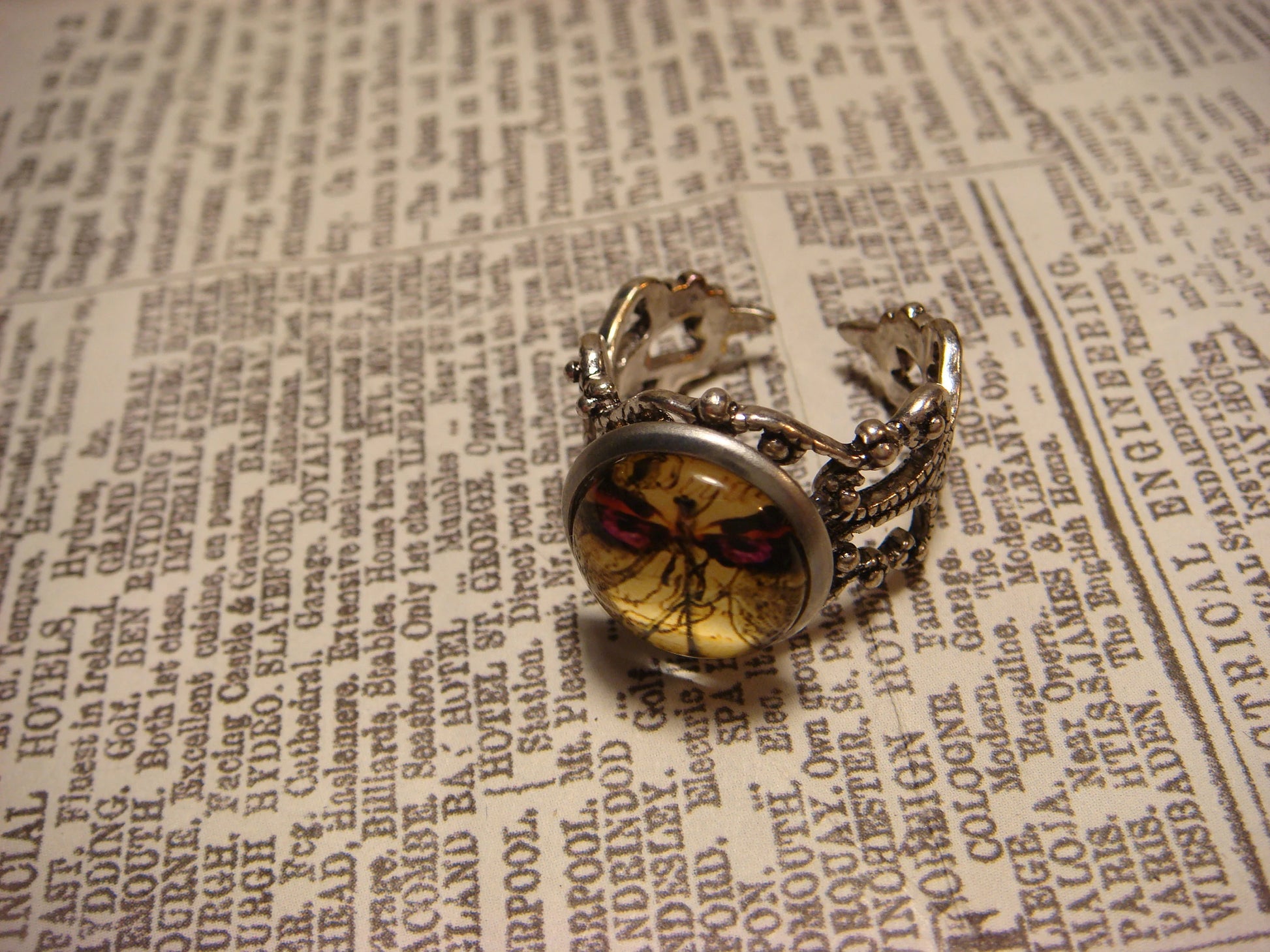 This beautiful ring features a purple dragonfly image cabochon set on a sturdy antique silver filigree Victorian style adjustable ring.