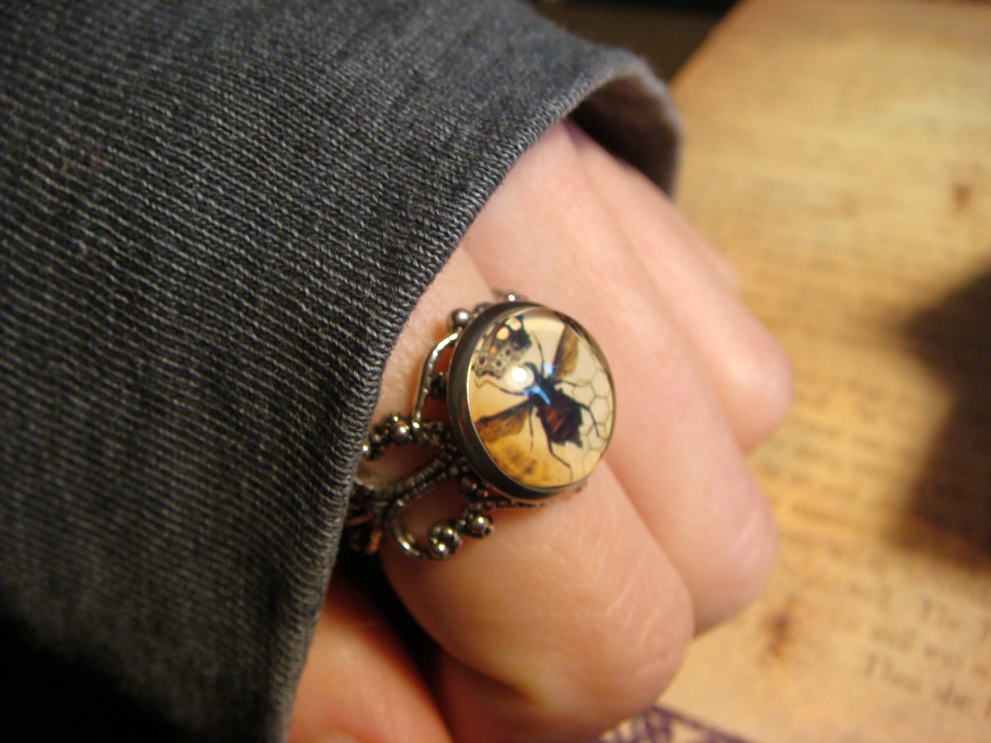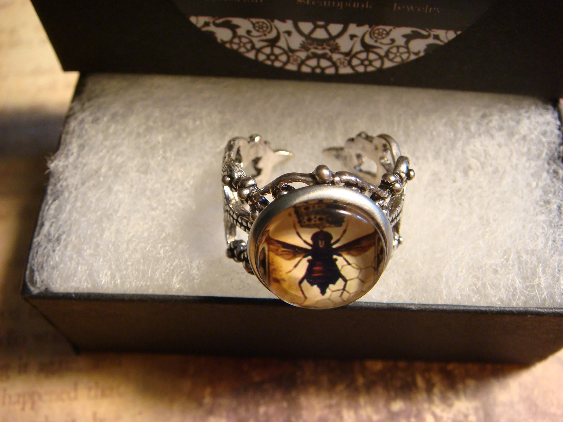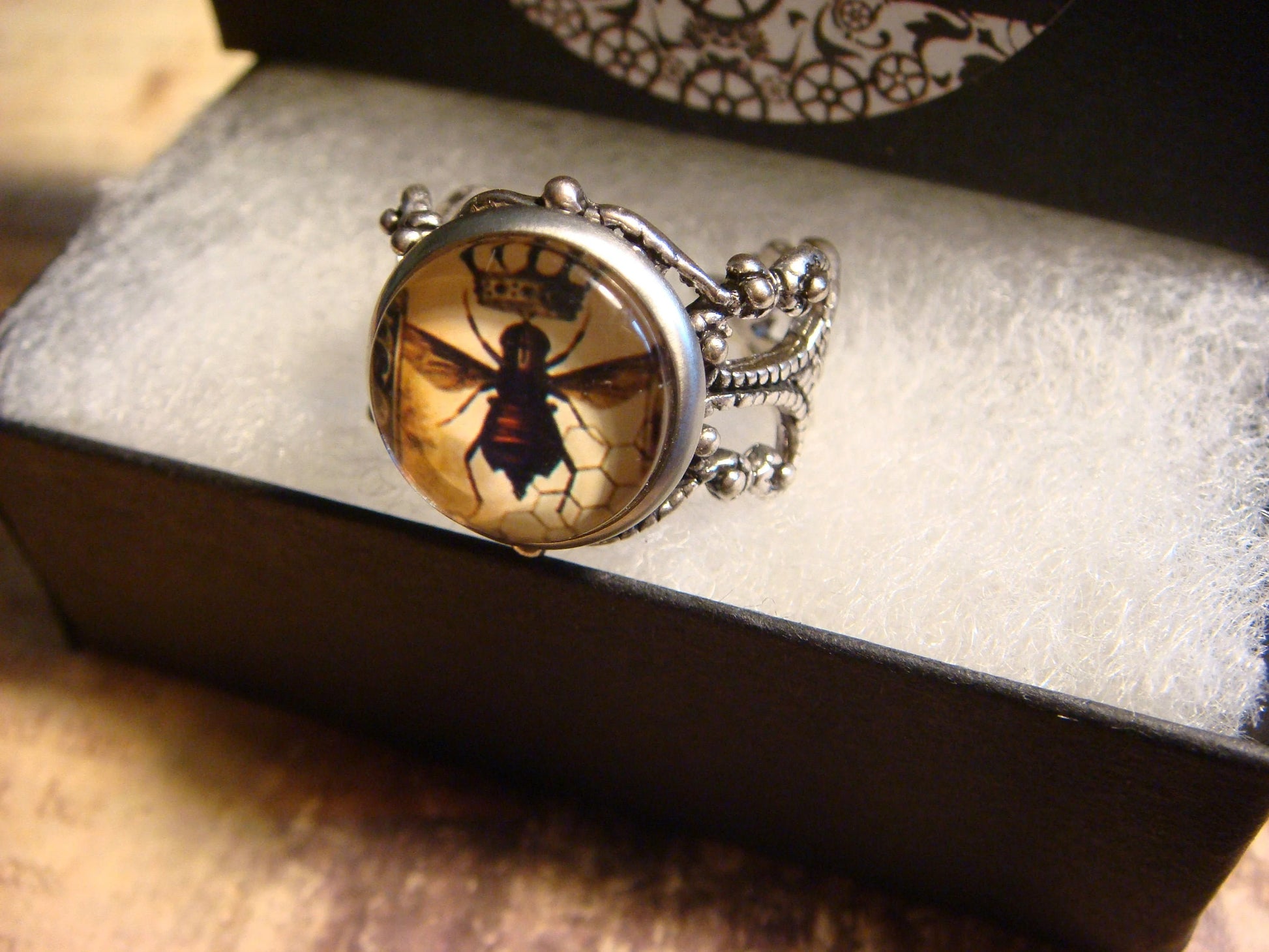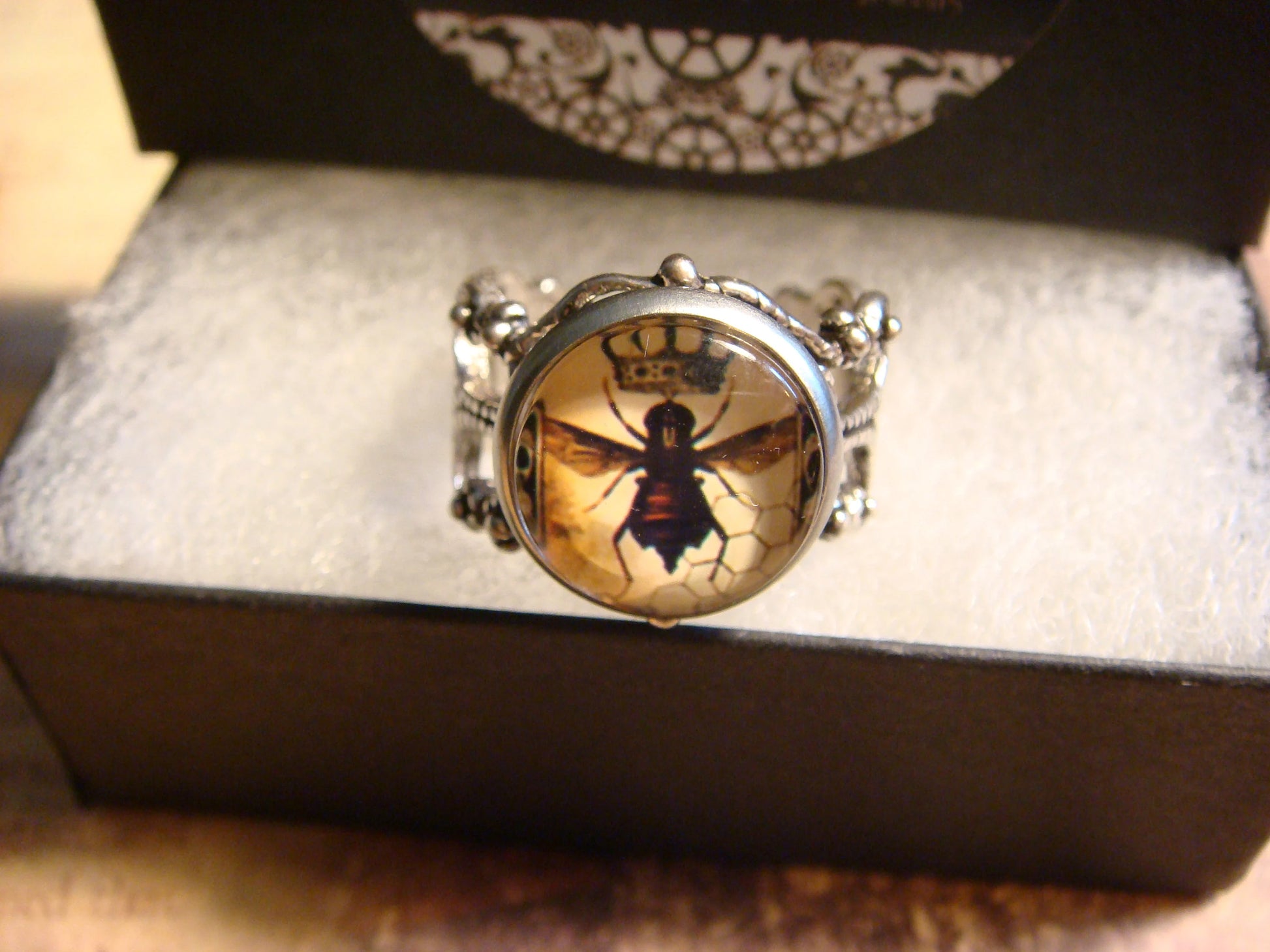 This beautiful ring features a crown and bee image cabochon set on a sturdy antique silver filigree Victorian style adjustable ring.