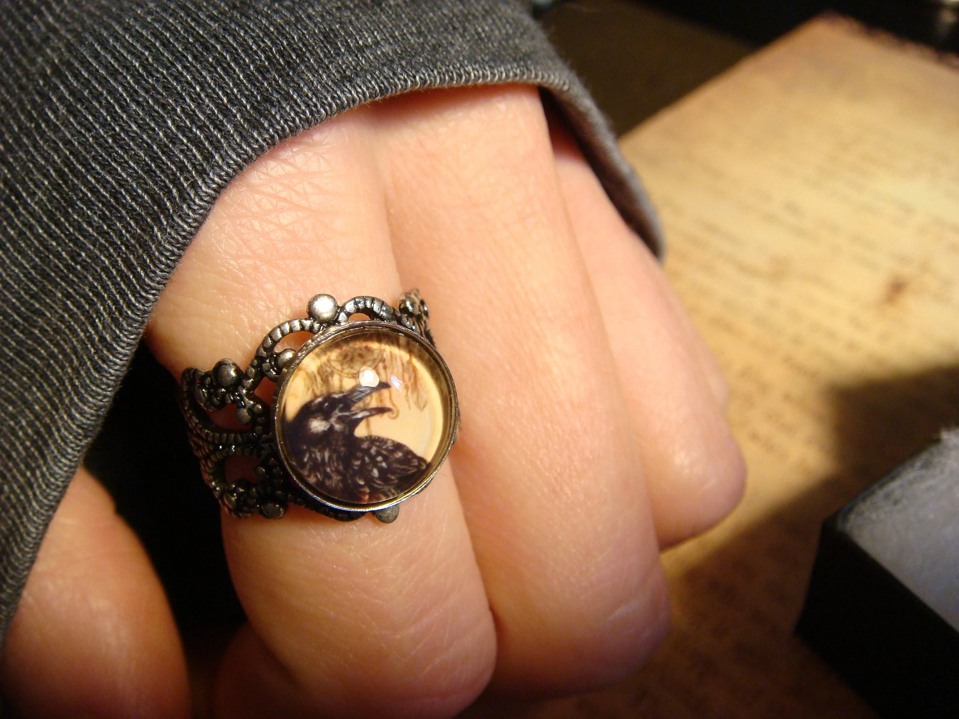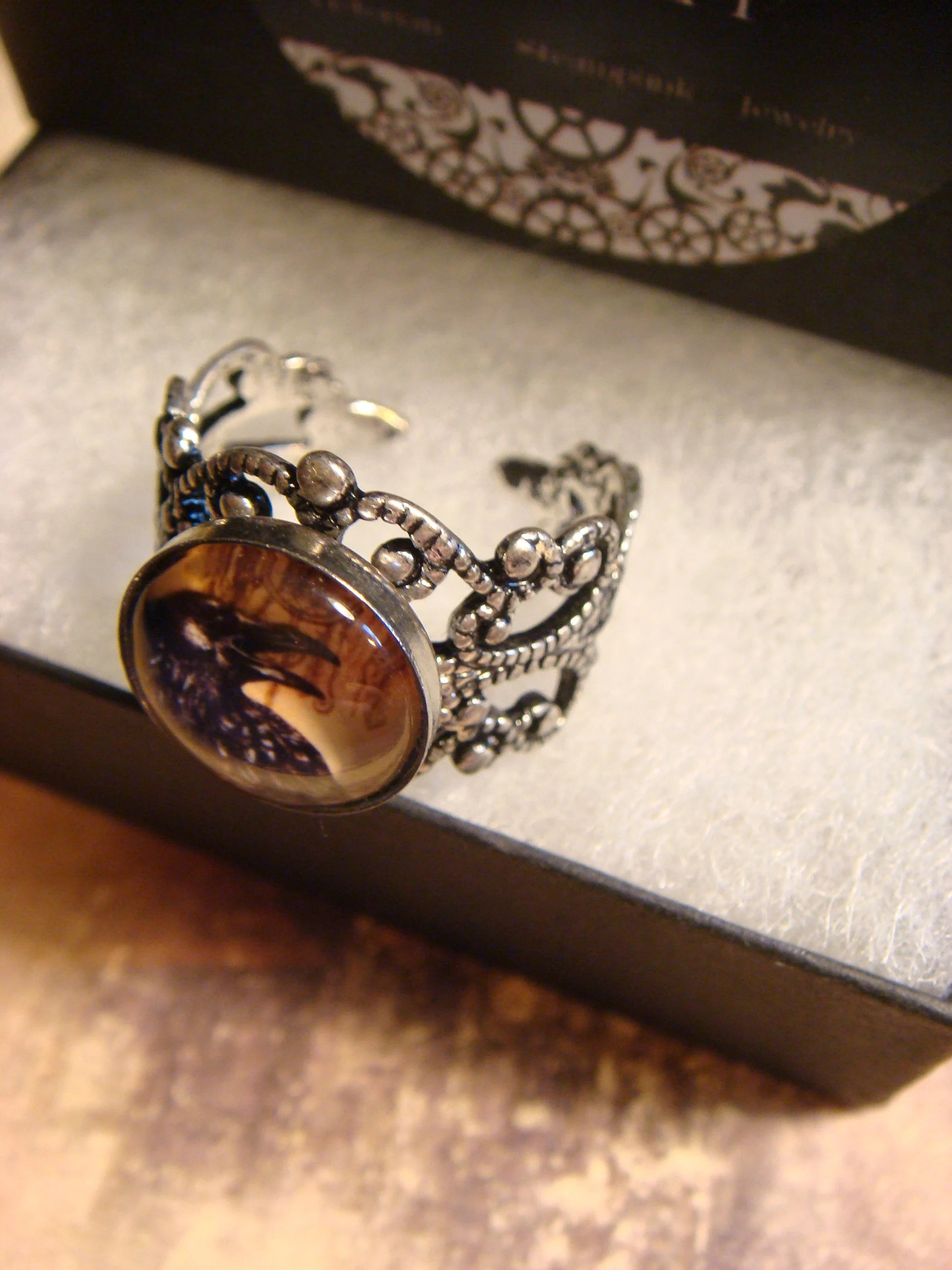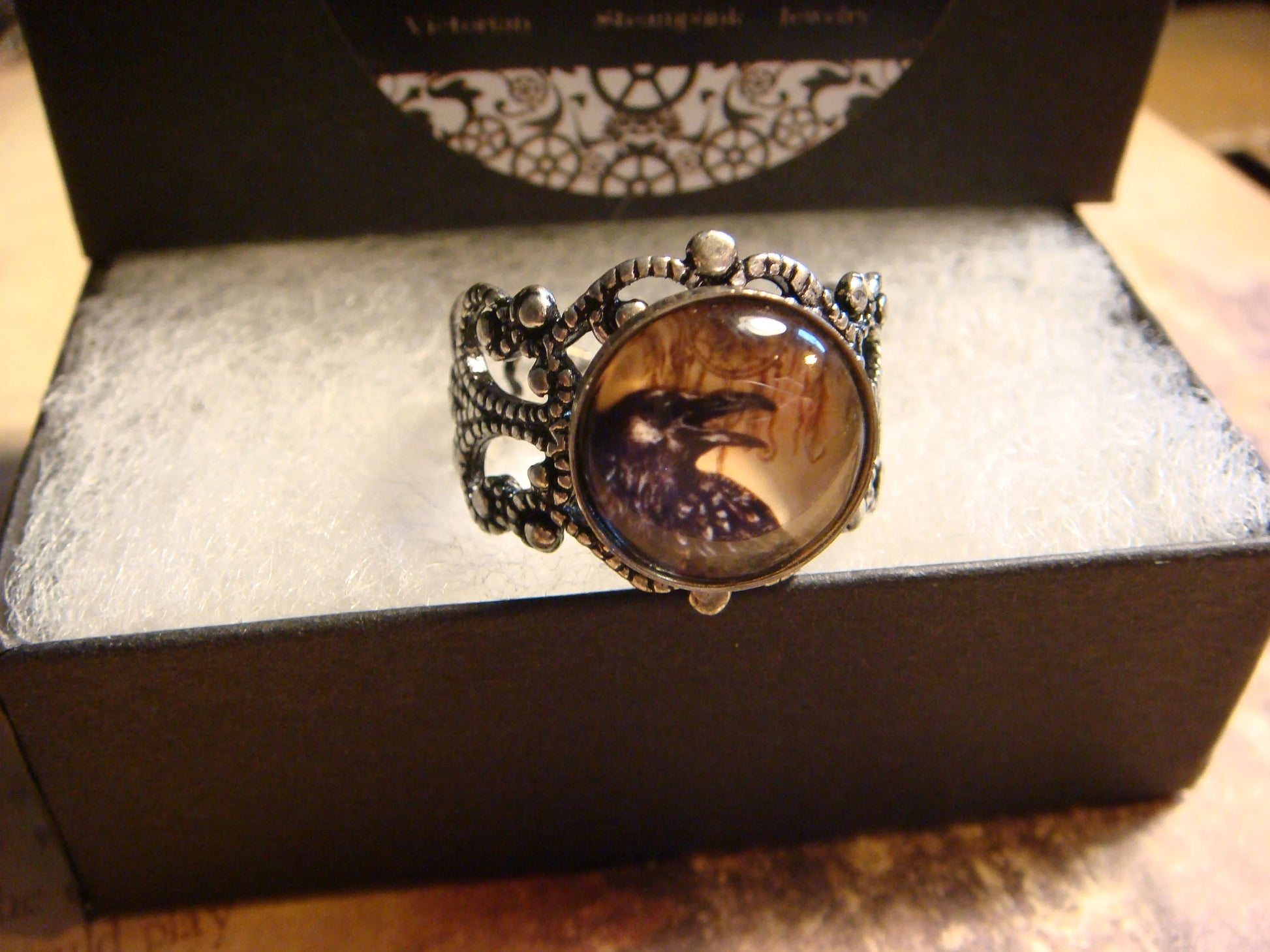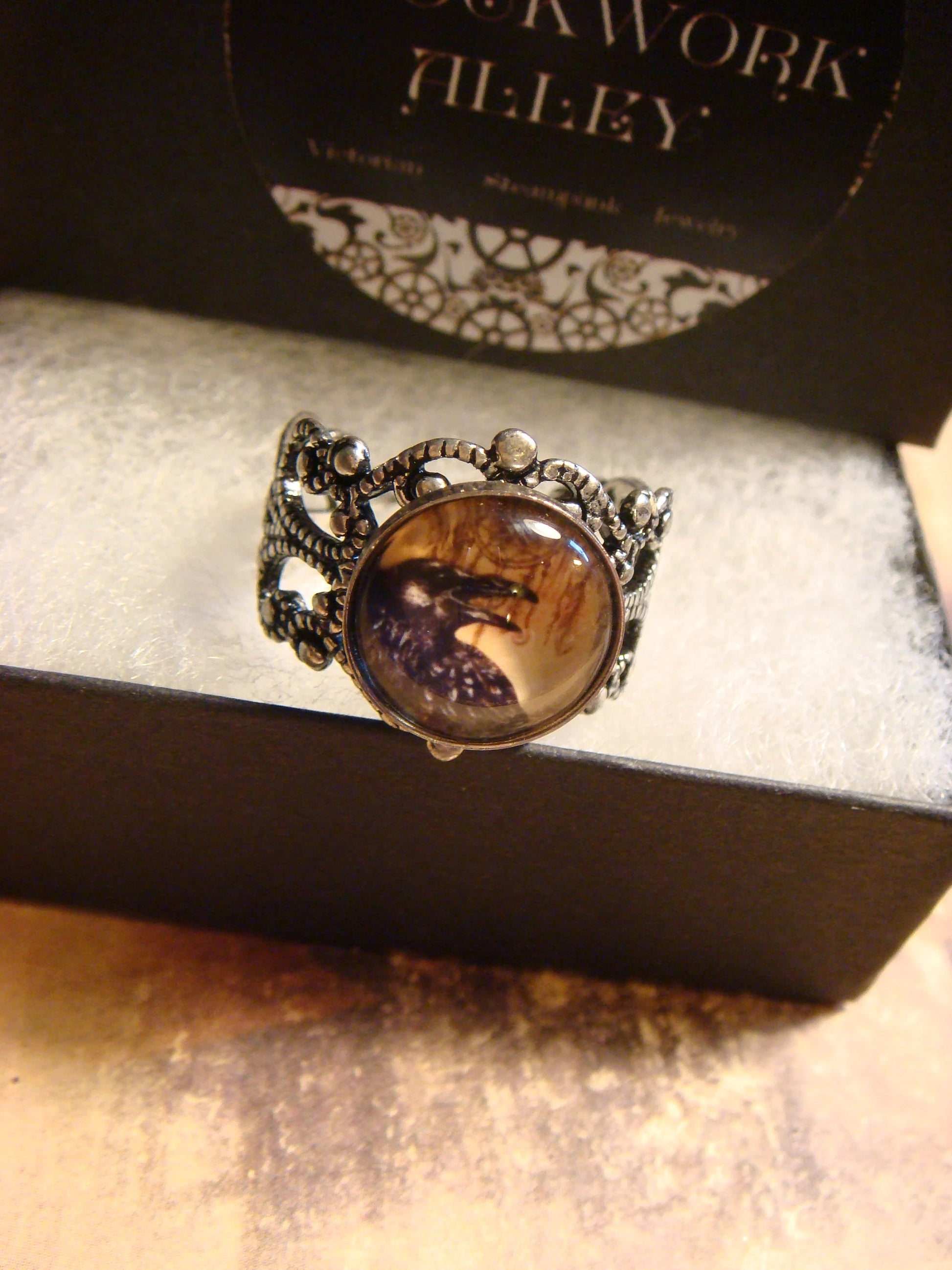 This beautiful ring features a raven image cabochon set on a sturdy antique silver filigree Victorian style adjustable ring.
