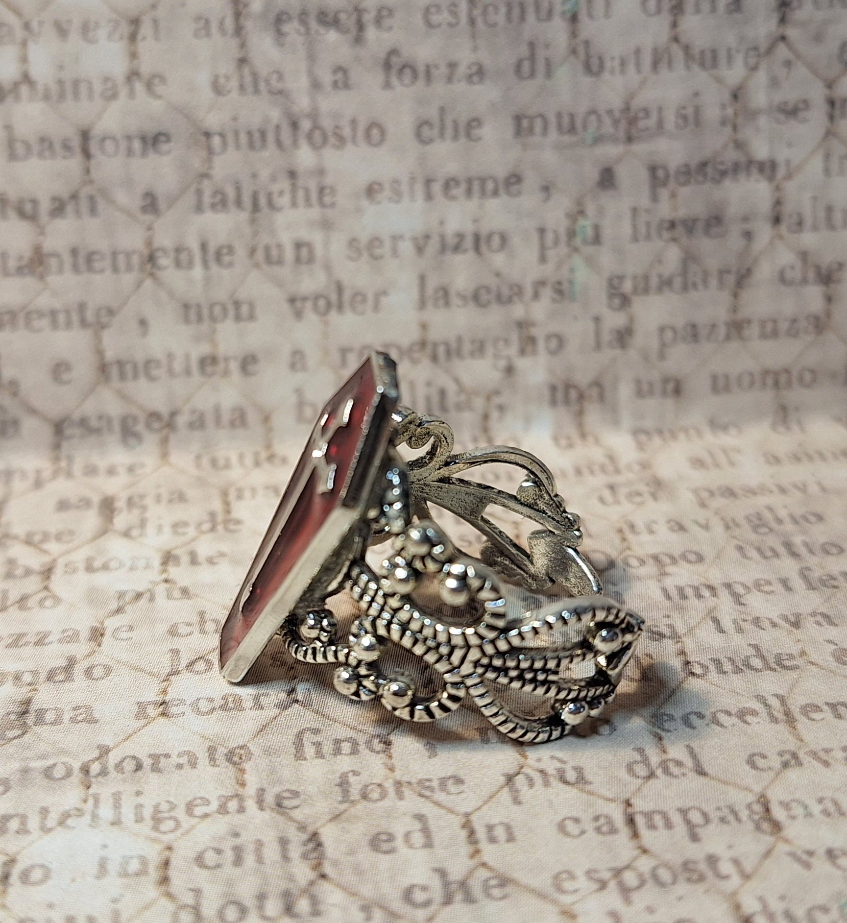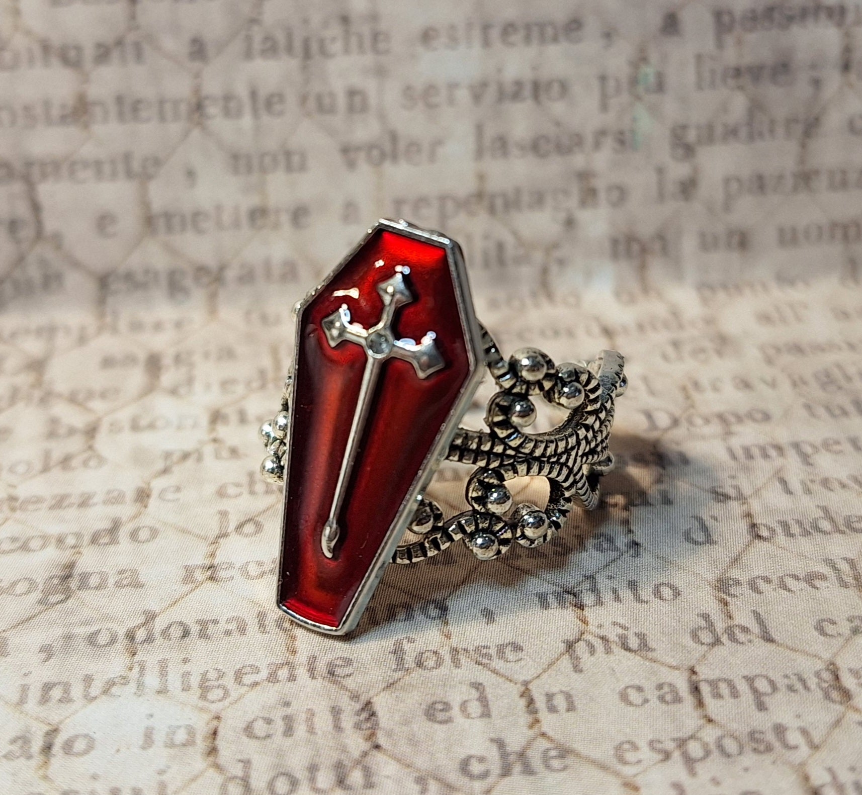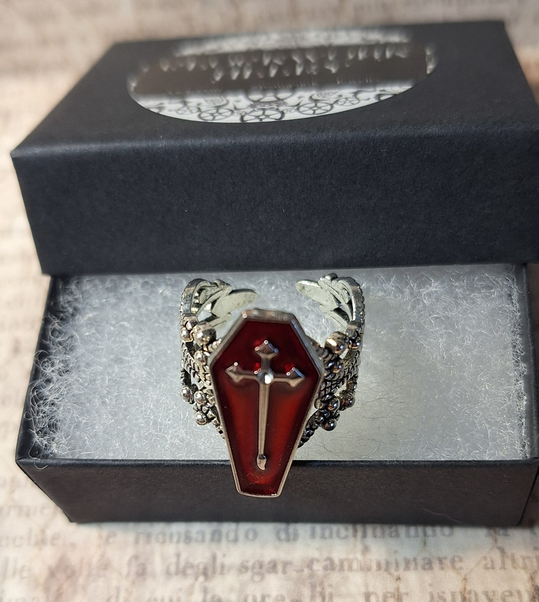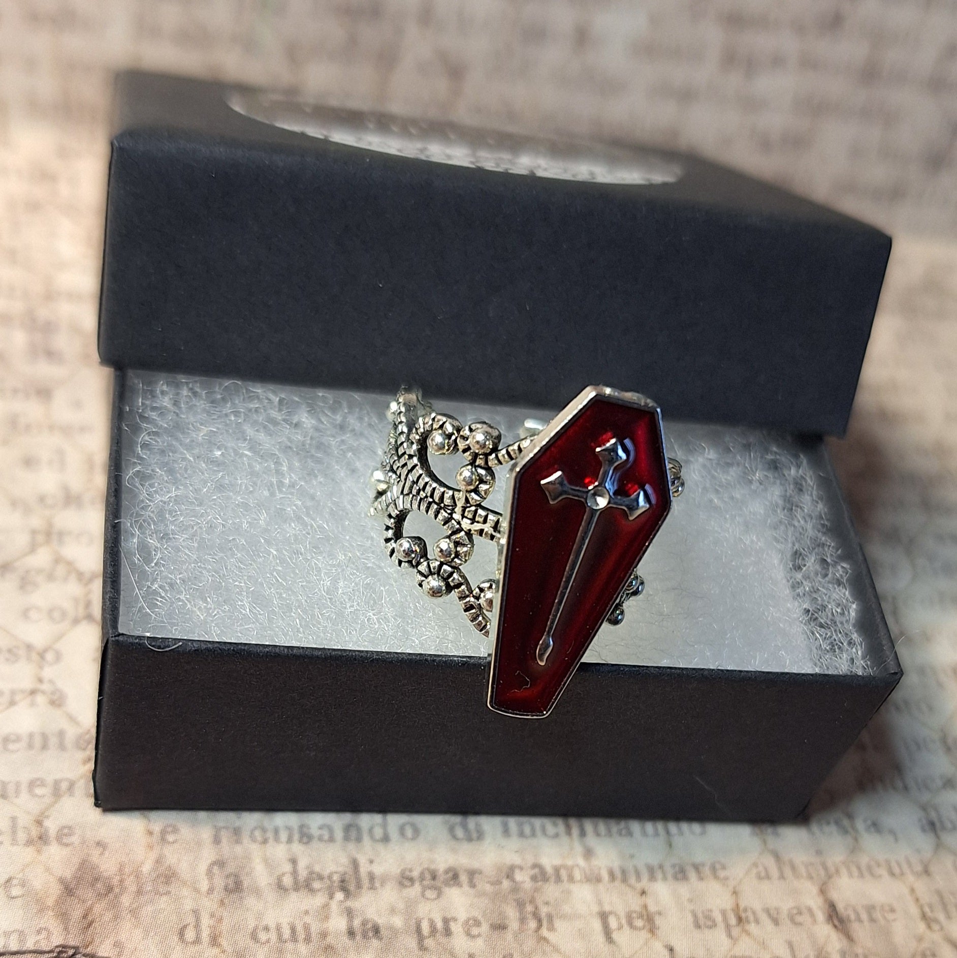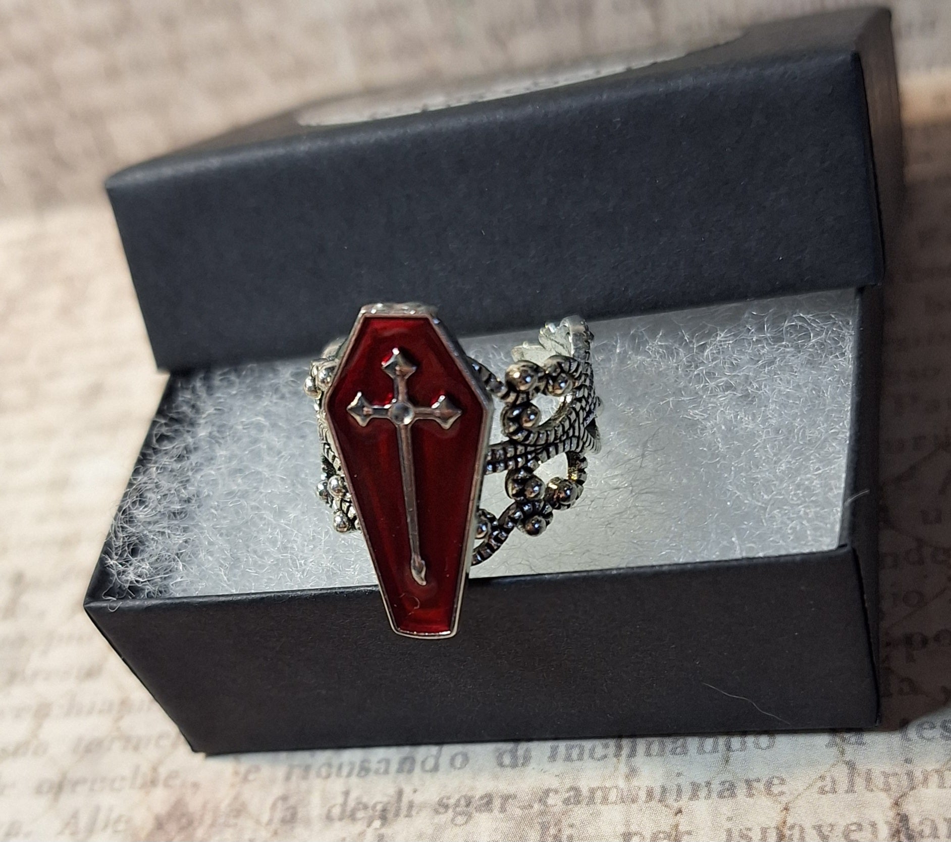 This unique ring features a red coffin with a cross on an adjustable antique silver filigree ring.