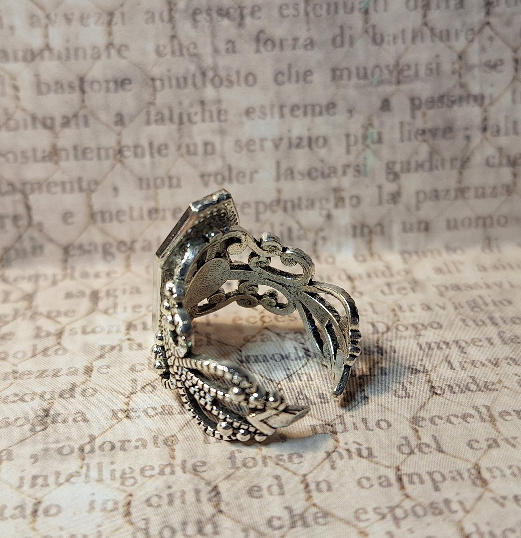 This ring is antique silver plated over copper