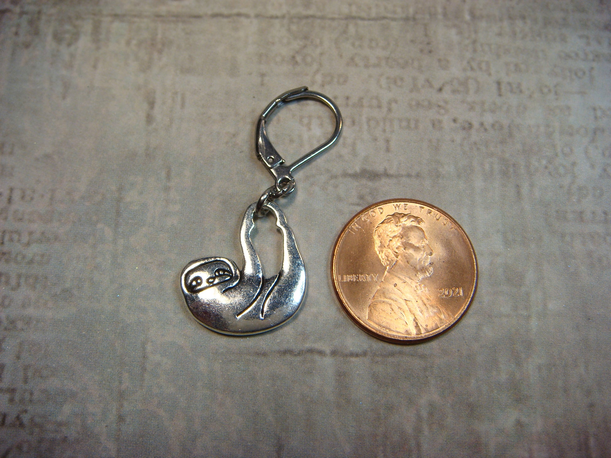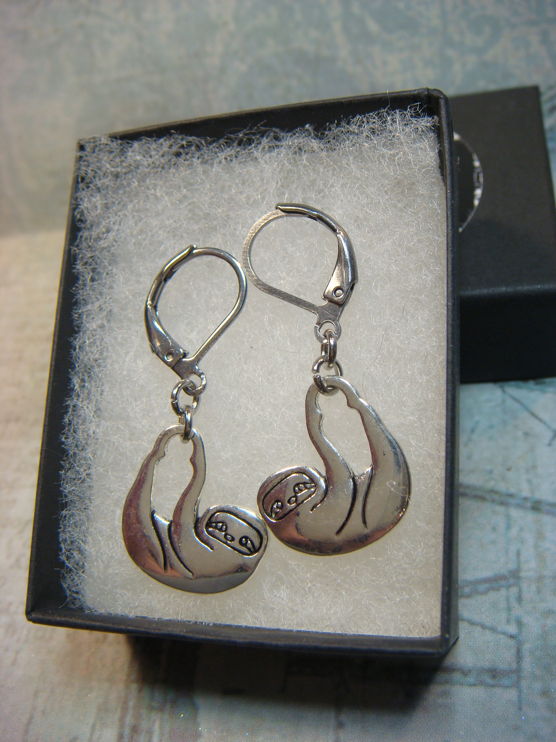 These earrings are made with antique silver sloths hanging on stainless steel lever back earrings.