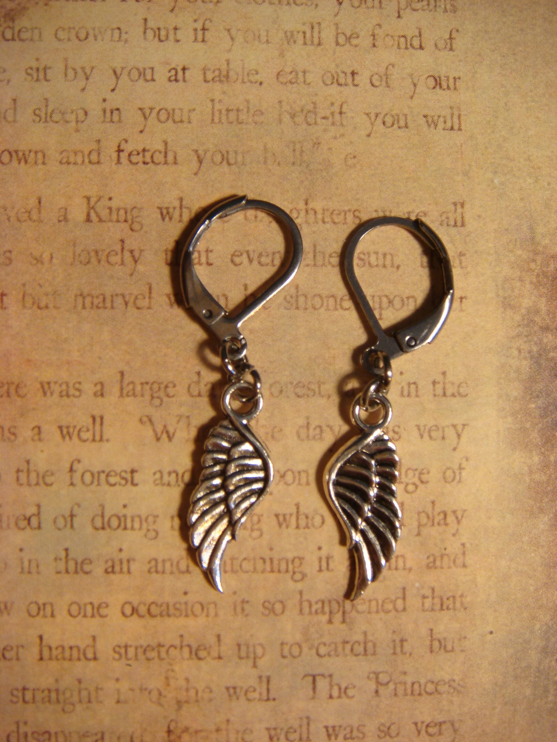 These earrings are made with small antique silver wing charms hanging on stainless steel lever back earrings.