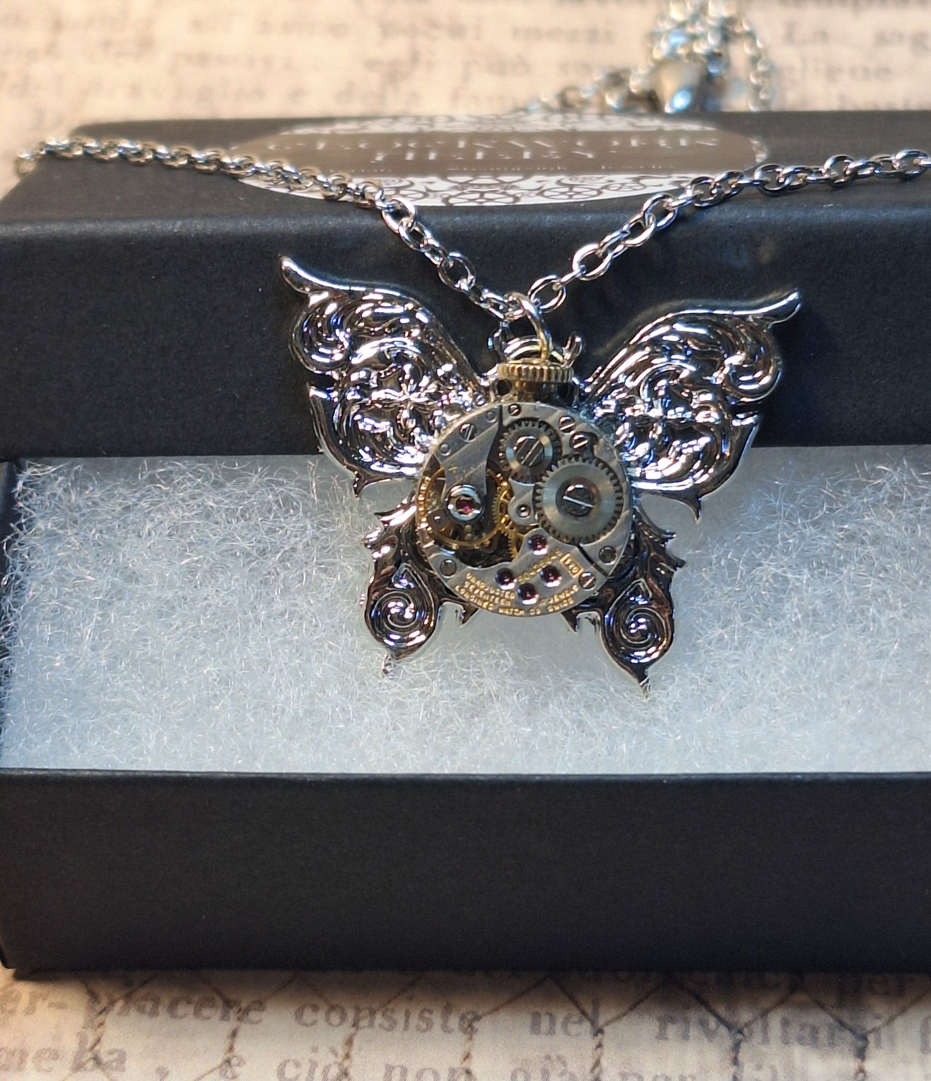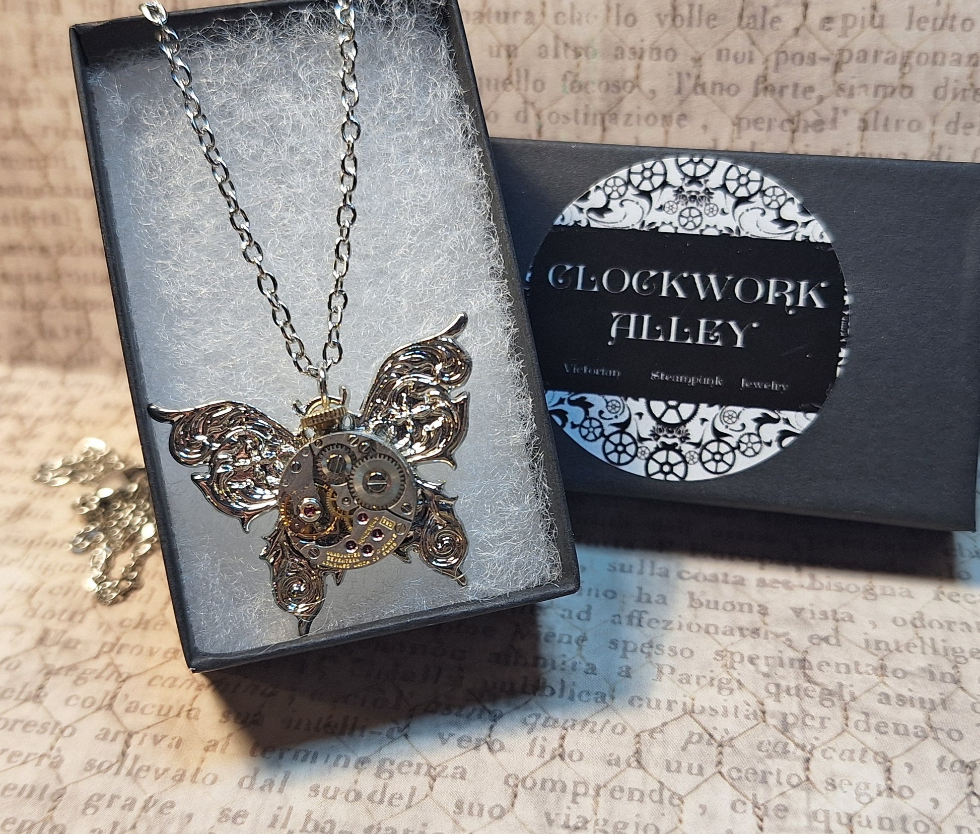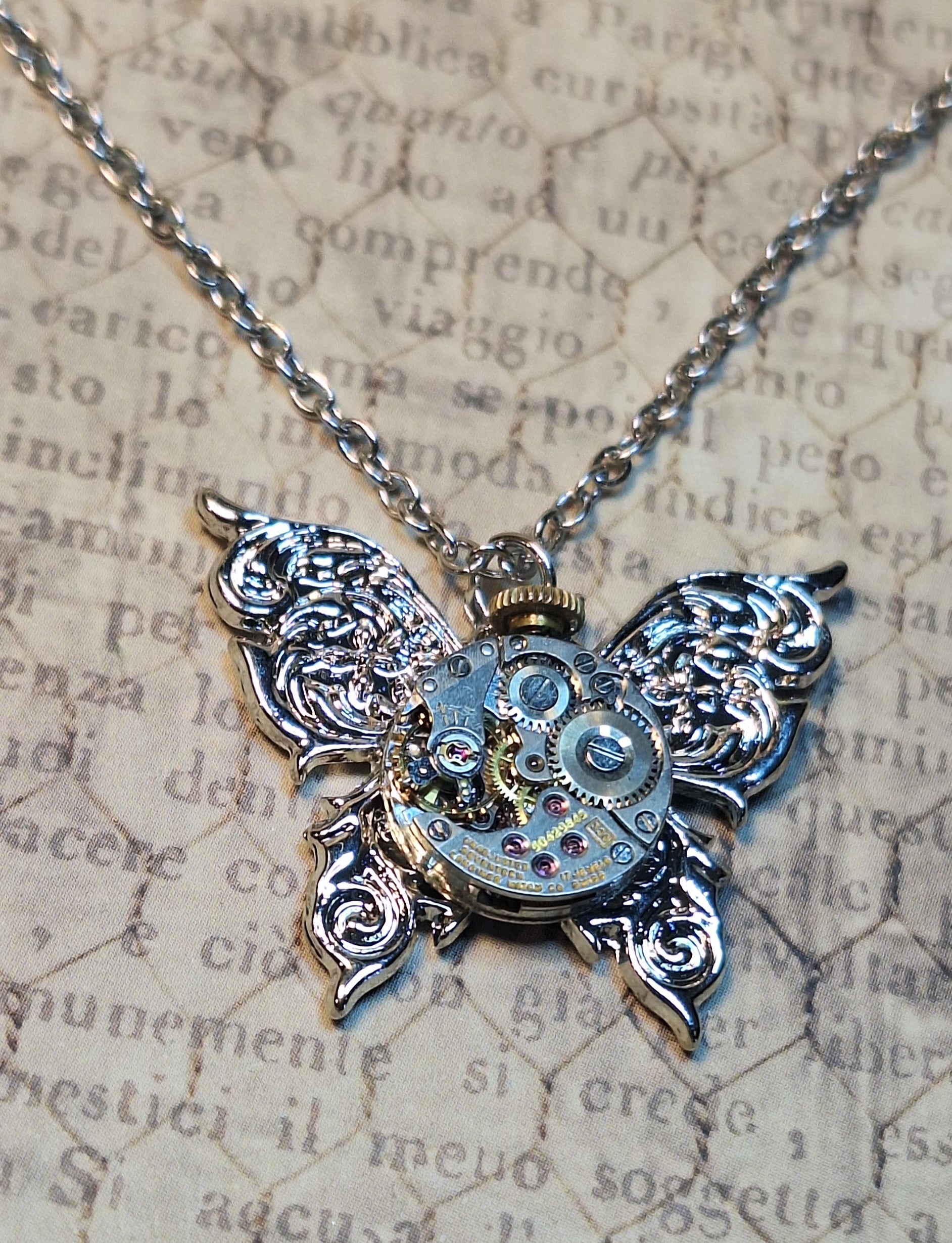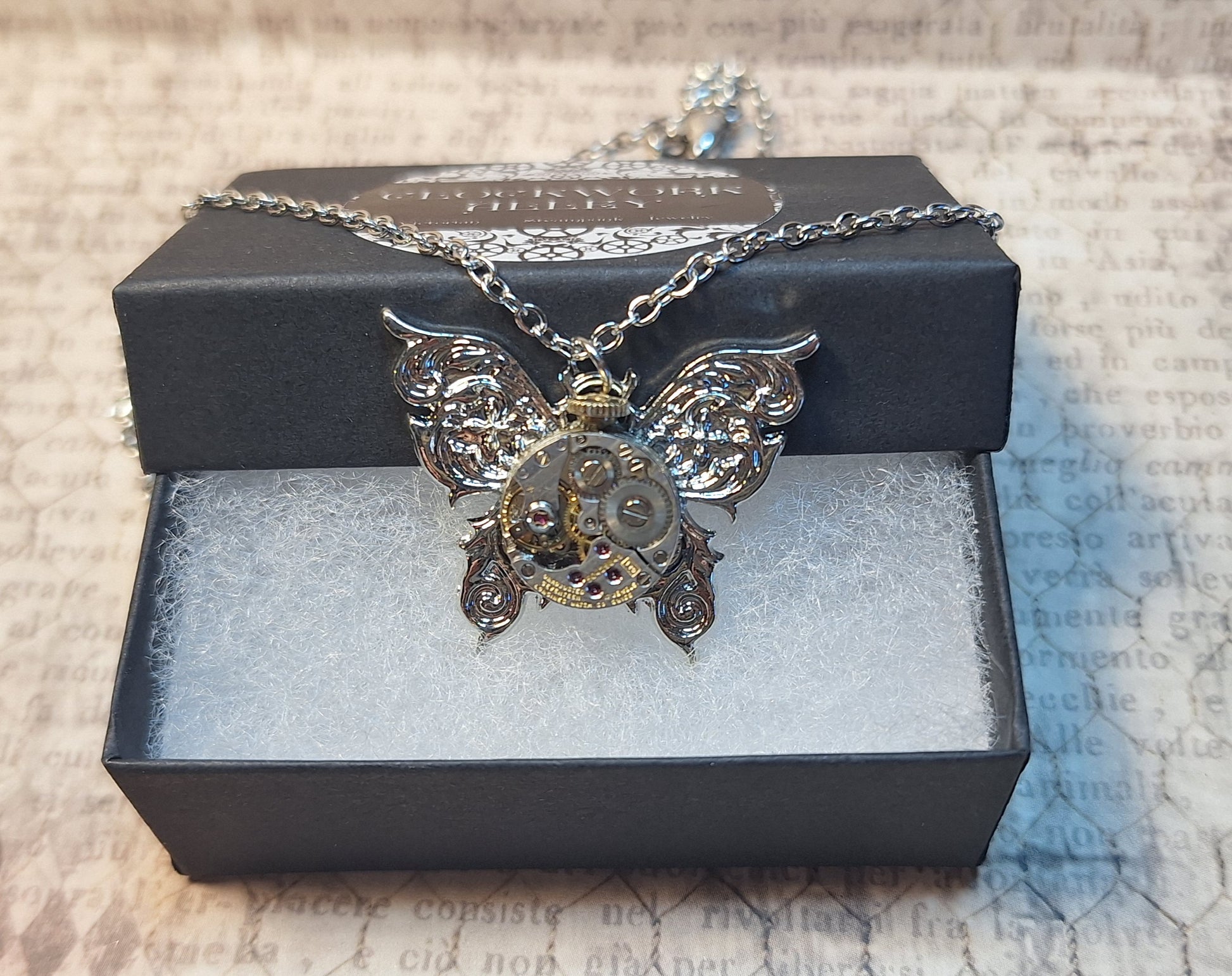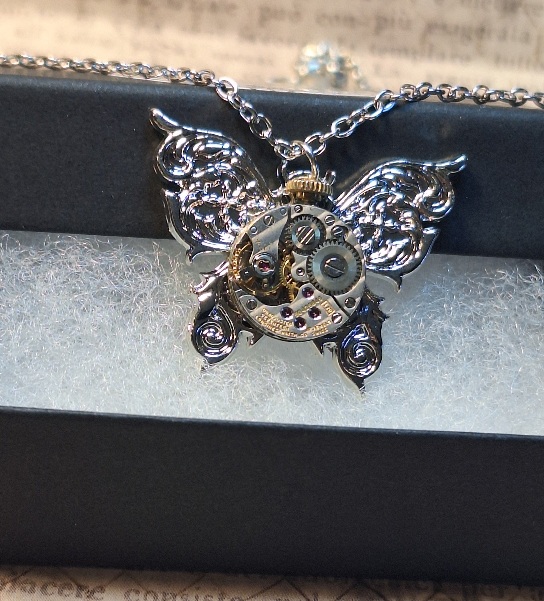 This beautiful, unique necklace features a upcycled, non-working watch movement on a small Silver Butterfly pendant.
