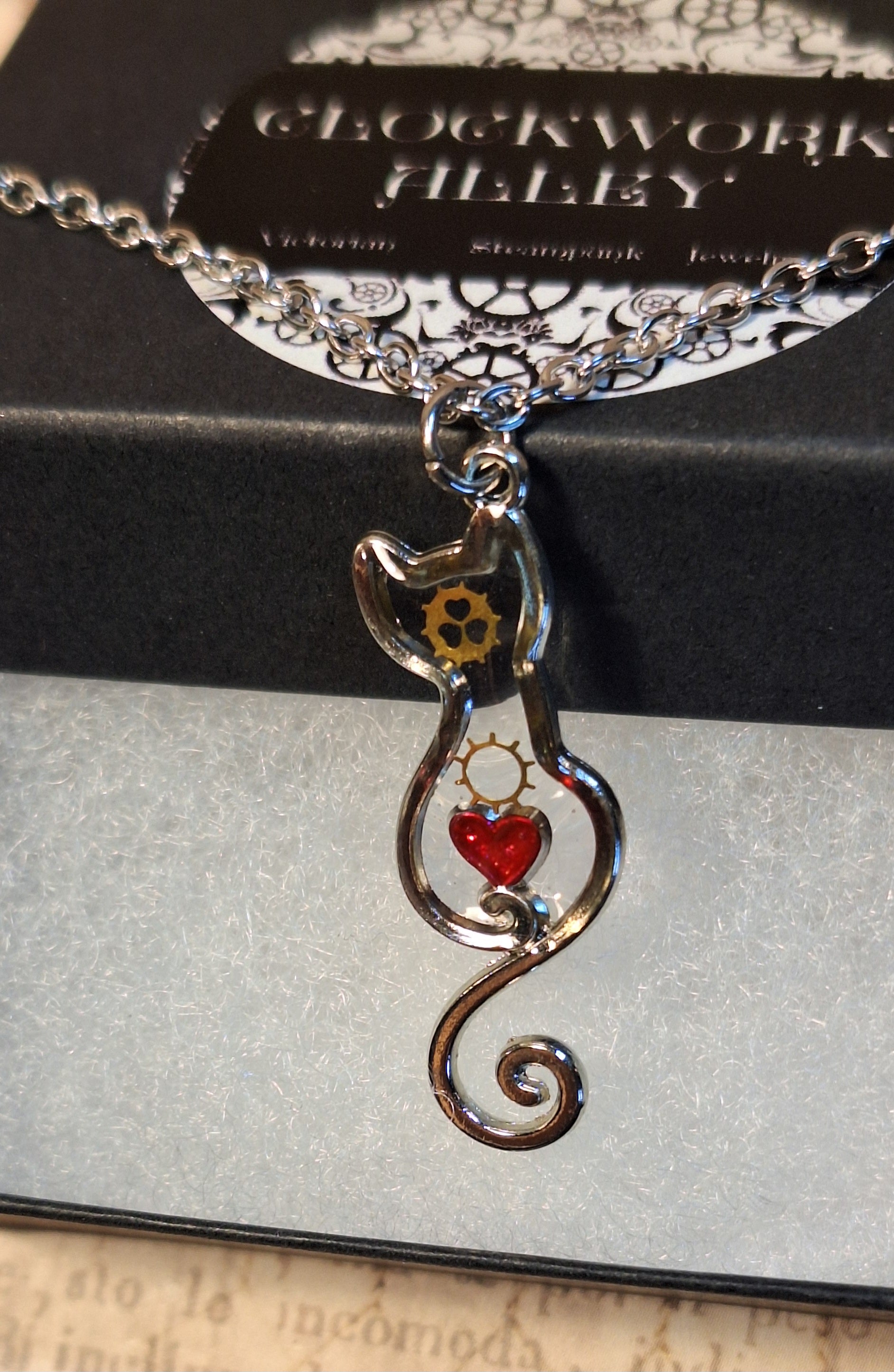 This steampunk necklace features a red heart and watch parts set in resin in a see-through, antique silver cat-shaped pendant.