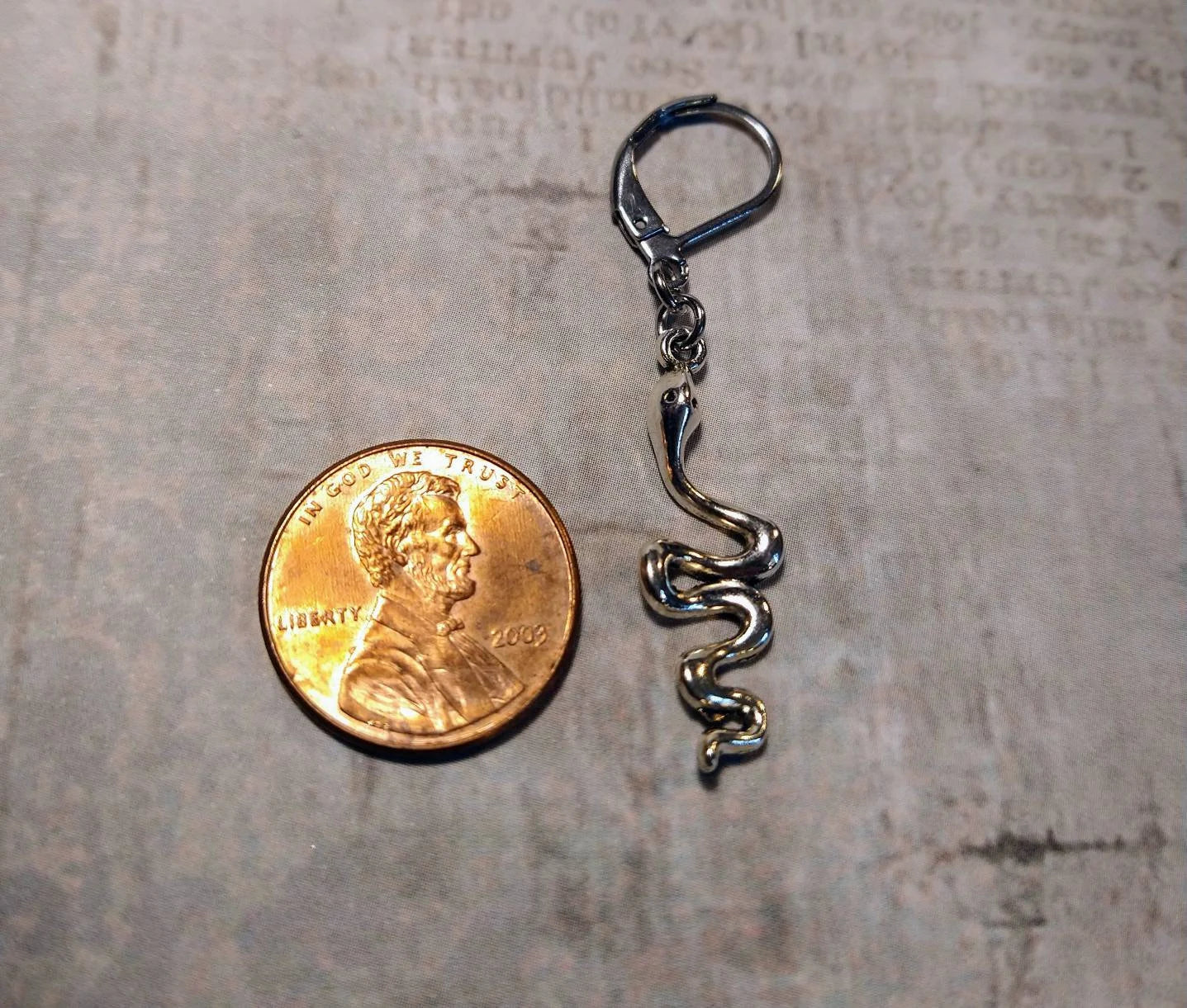 These earrings are made with antique silver snakes hanging on stainless steel lever back earrings.