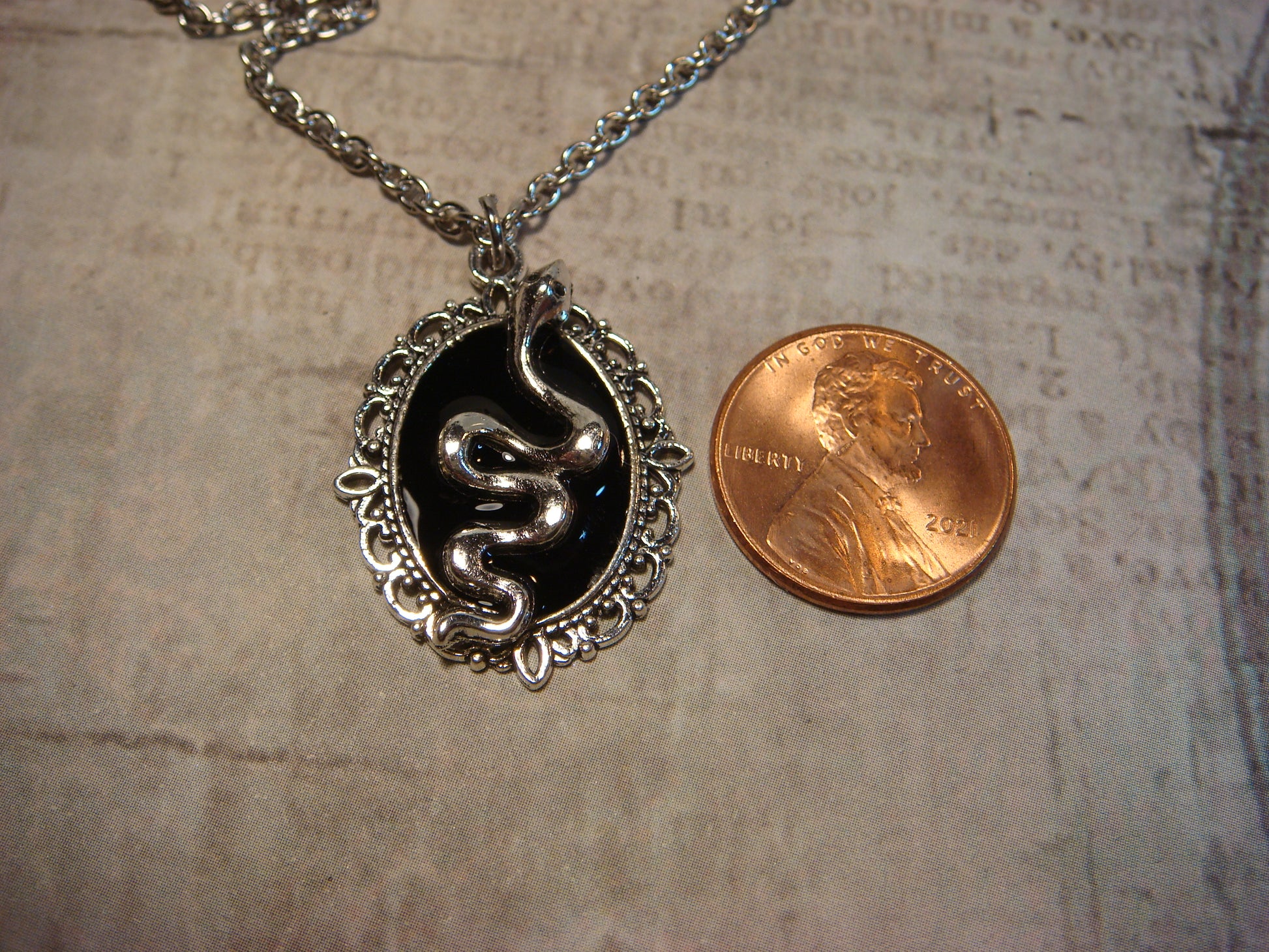 This necklace features an antique silver snake encased in ice resin in an ornate antique silver setting with a black background.