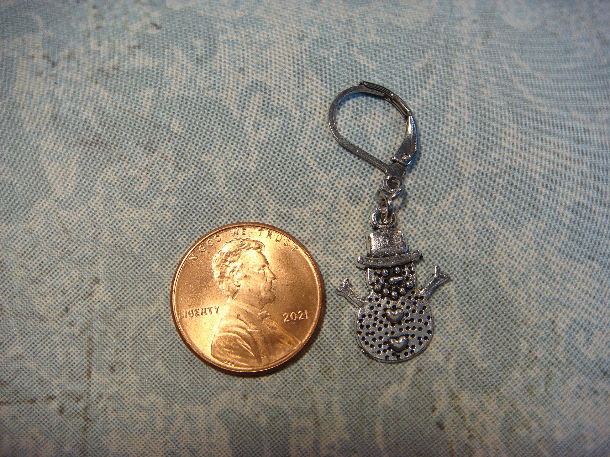 These holiday earrings are made with antique silver snowman charms hanging on stainless steel lever back earrings.
