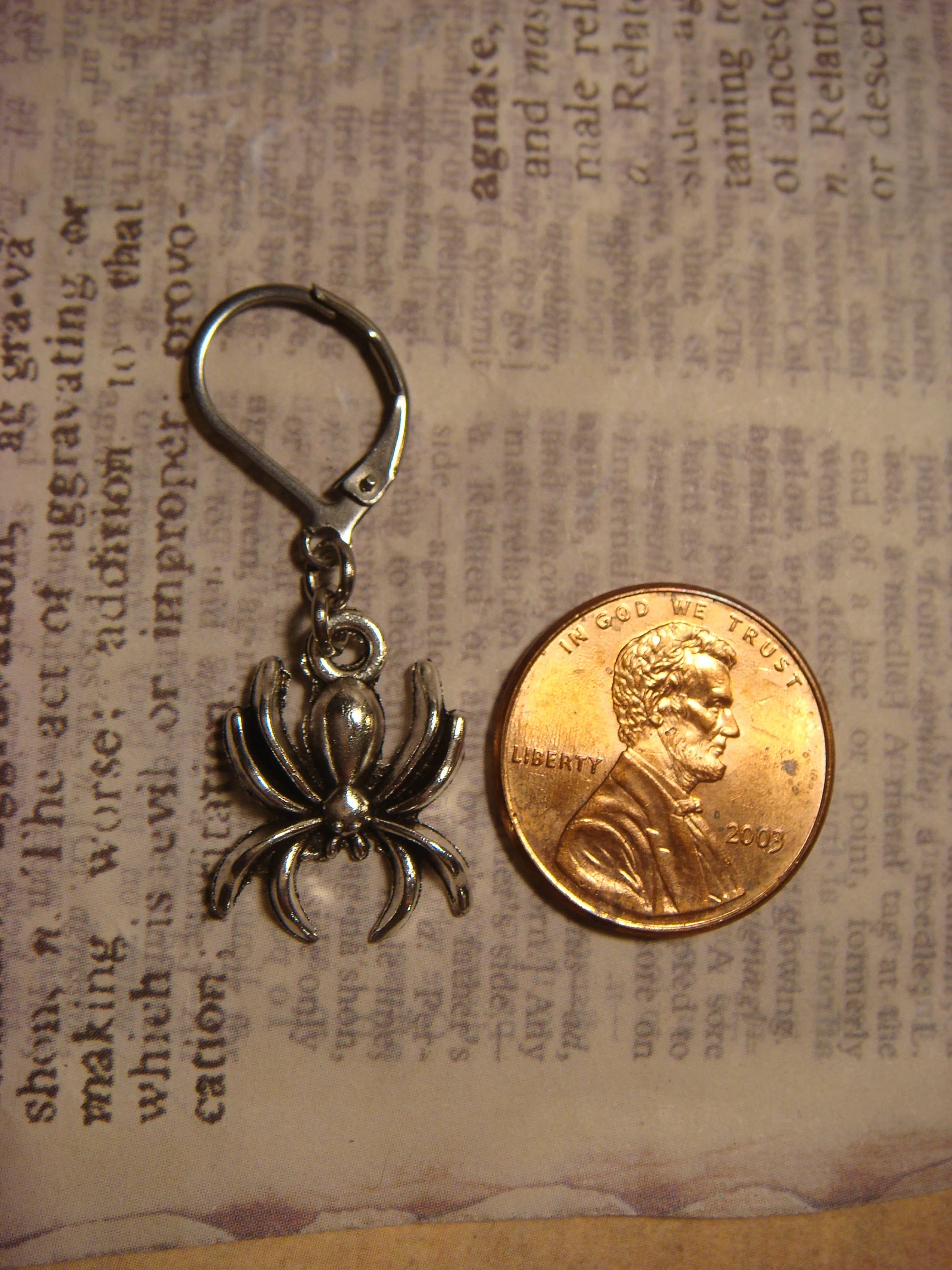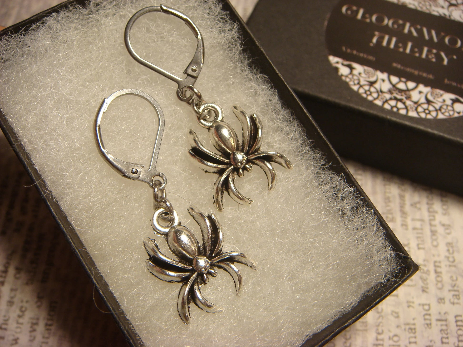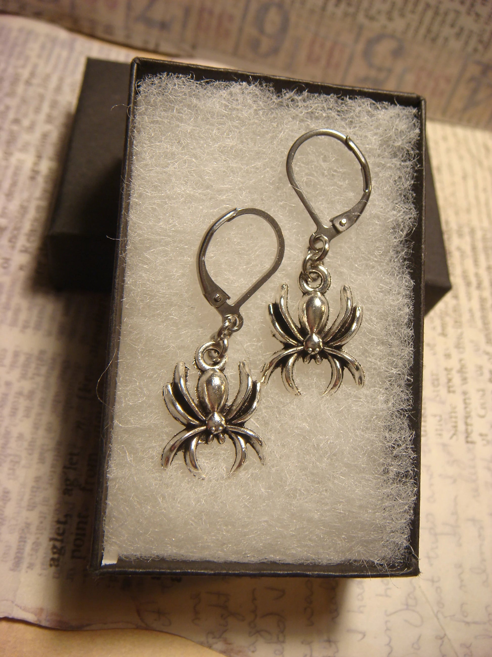 These earrings are made with antique silver spiders hanging on stainless steel lever back earrings.