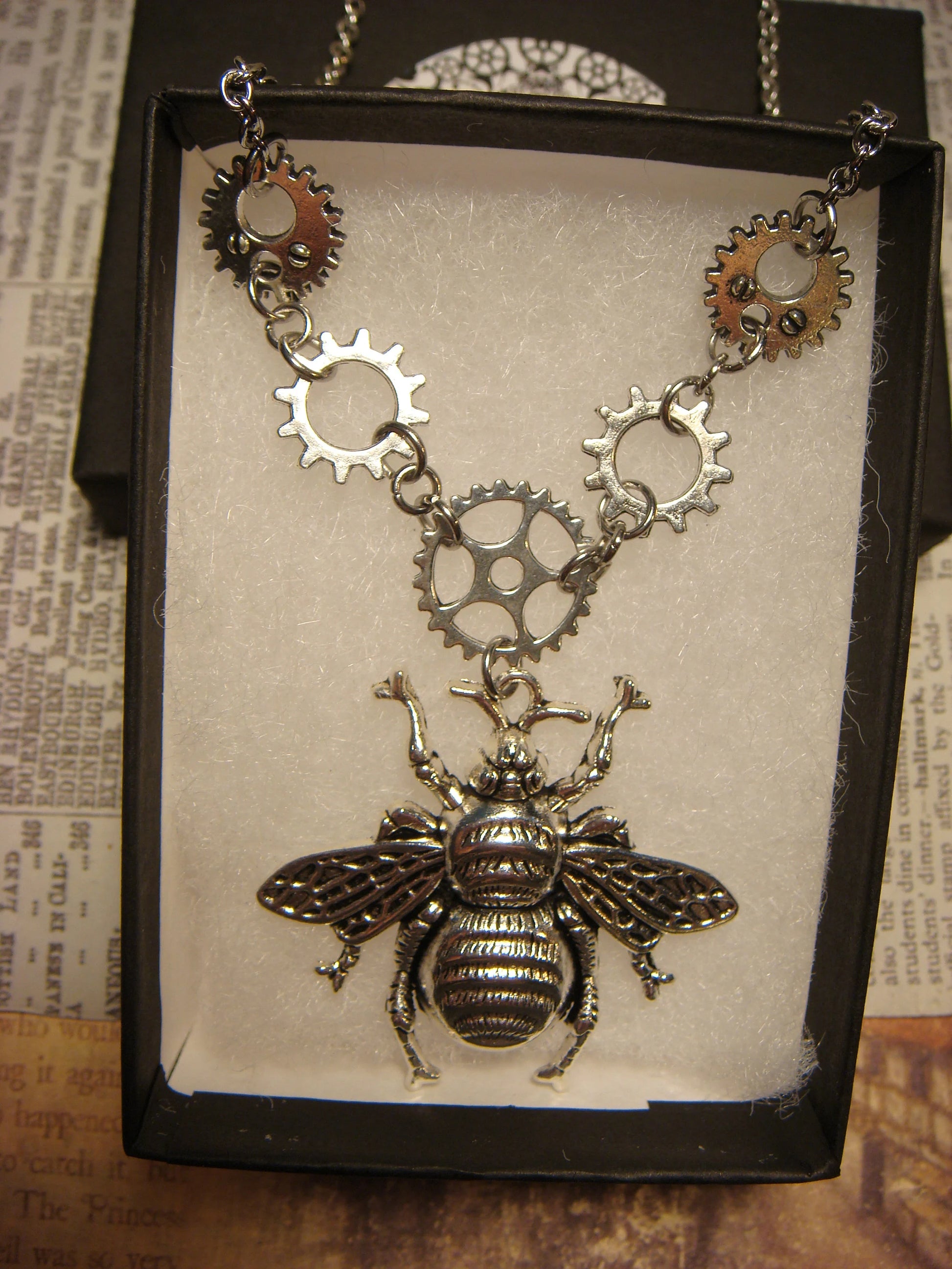 This steampunk necklace features a large antique silver bee with antique silver gears.