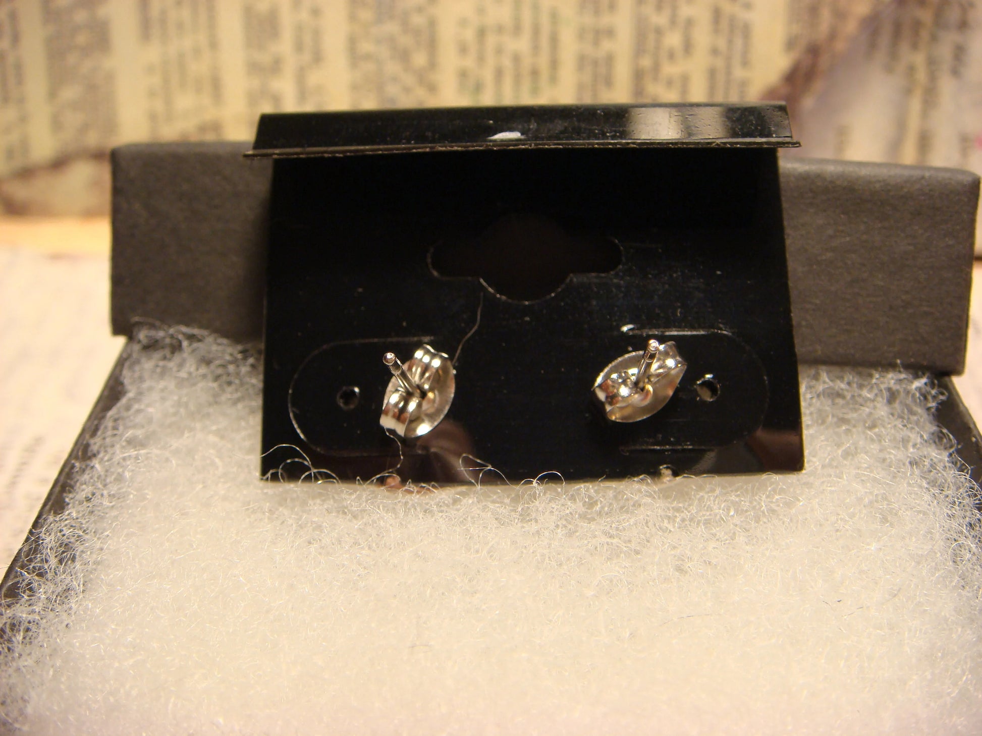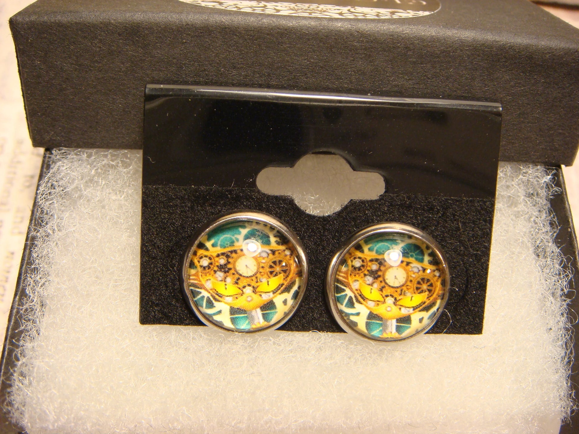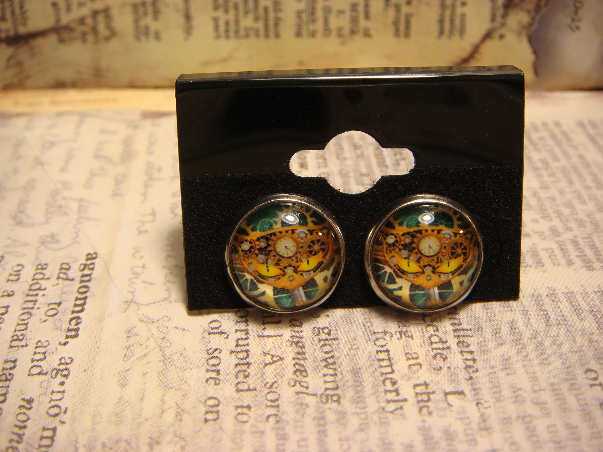 These earrings feature steampunk cat image cabochons set in stainless steel earring studs.