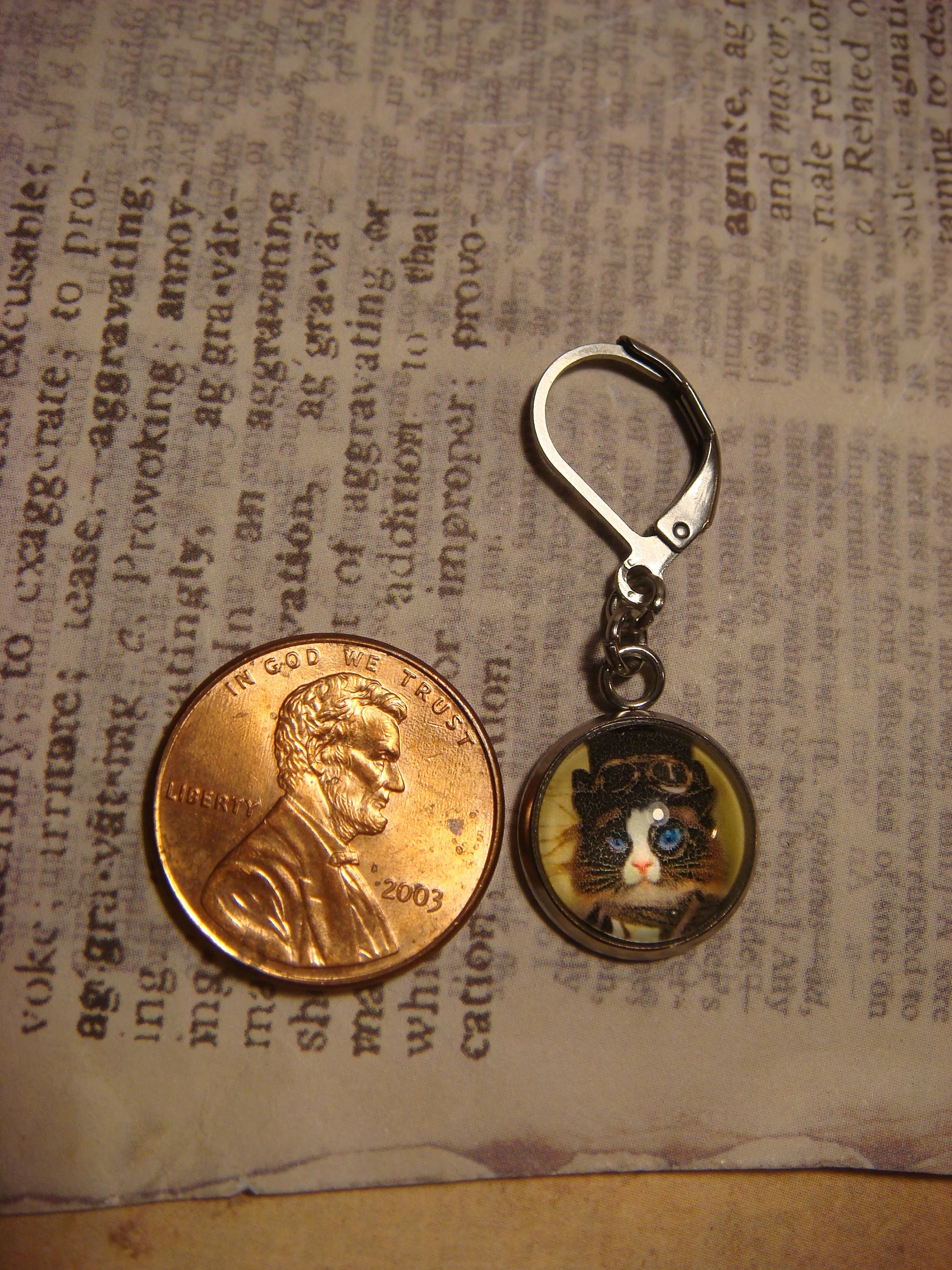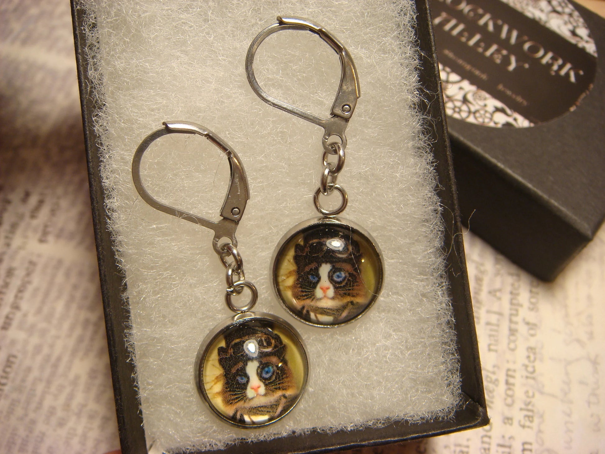 These steampunk earrings are made with top hat and goggle wearing cat image cabochons on stainless steel settings hanging on stainless steel lever back earrings.