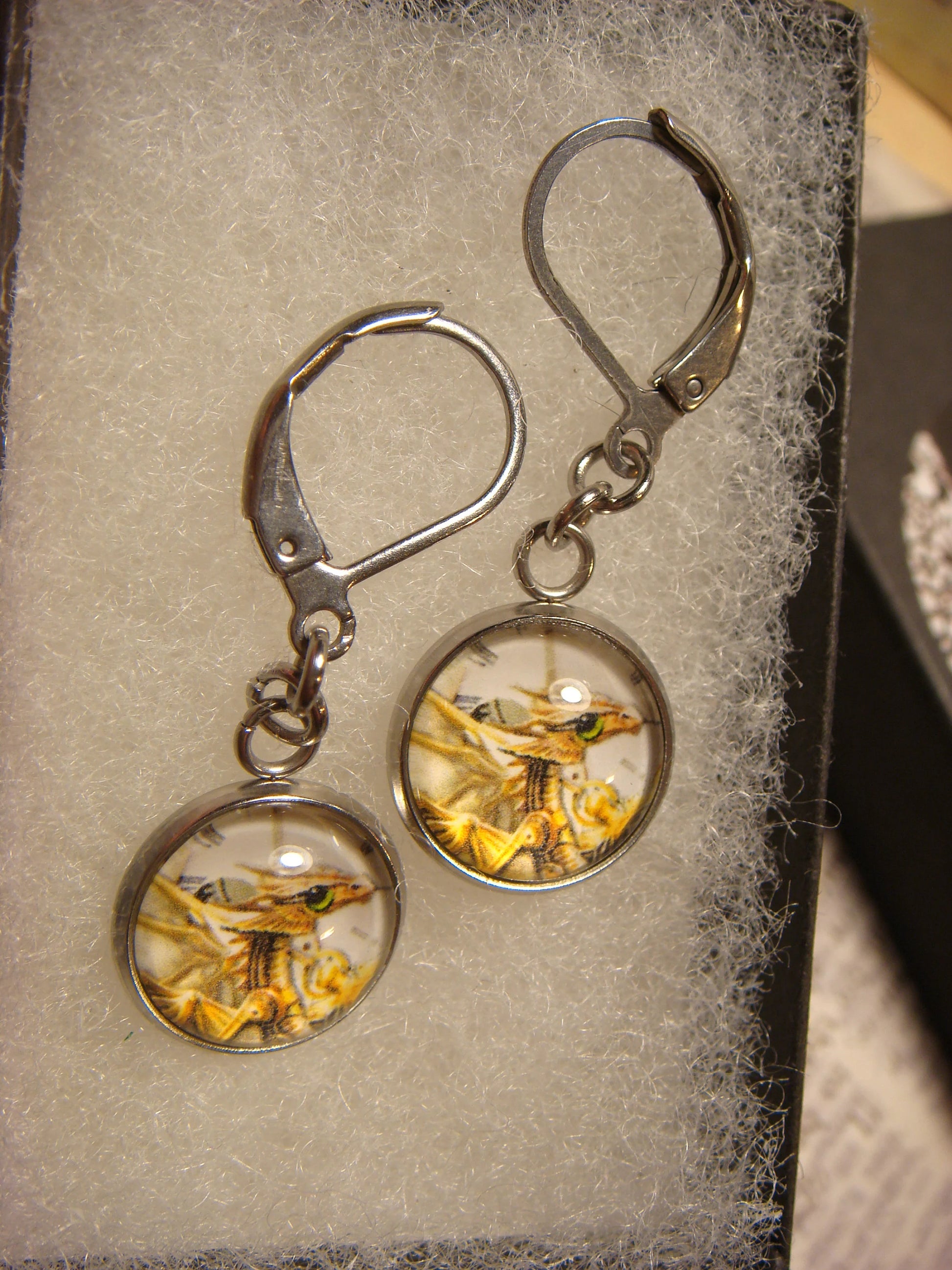 These earrings are made with steampunk dragon image cabochons on stainless steel settings hanging on stainless steel lever back earrings.