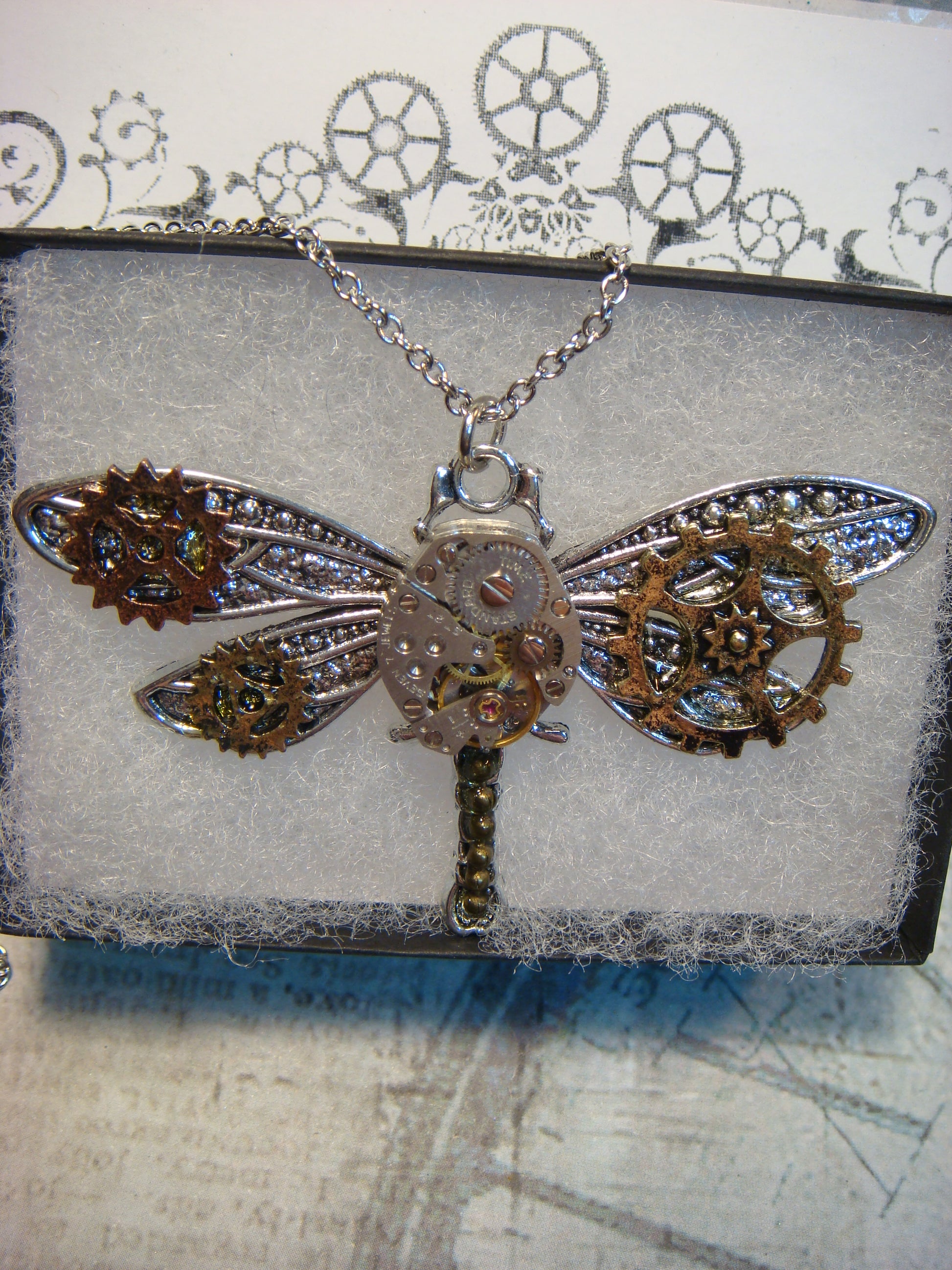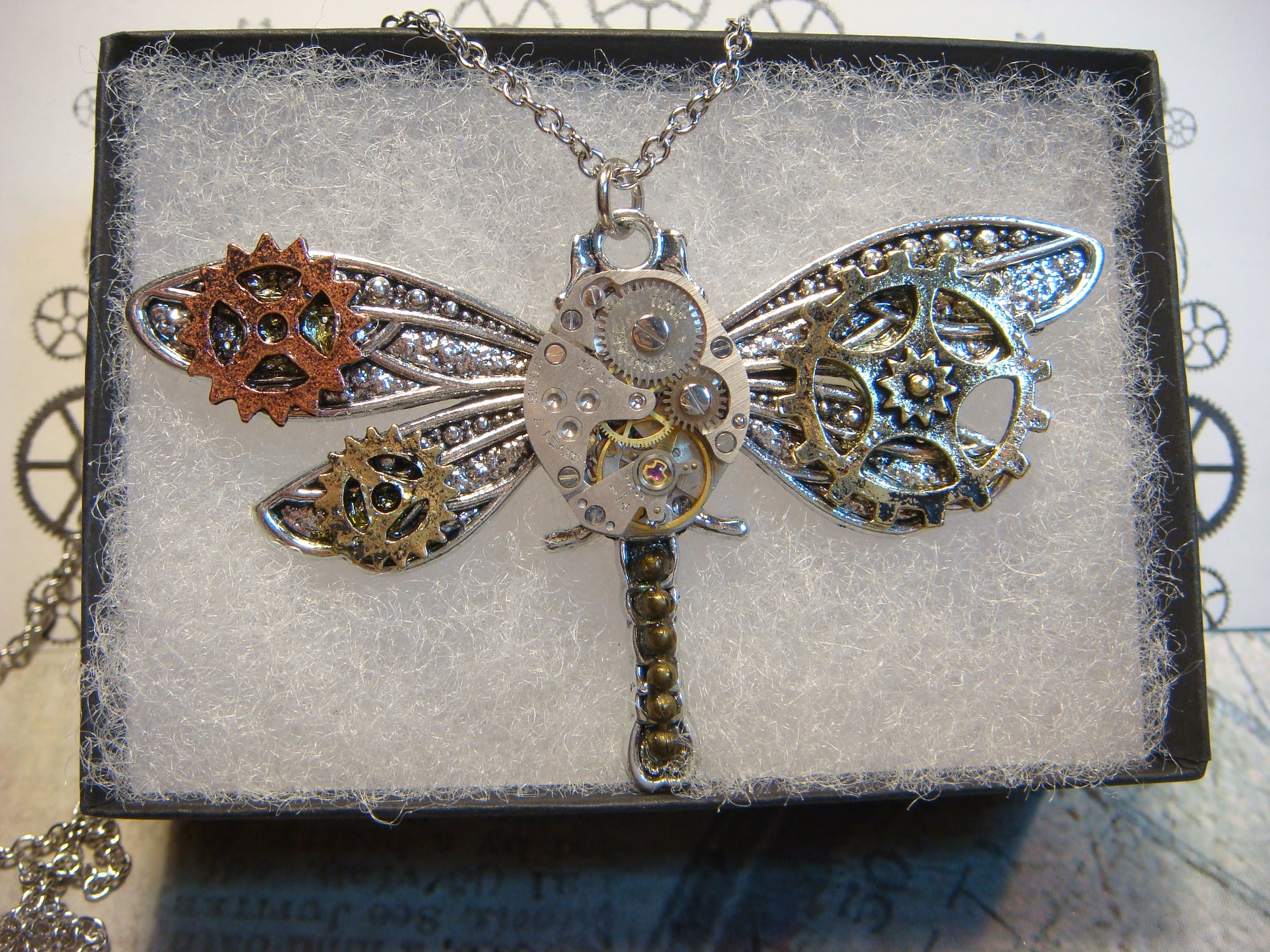 This beautiful, unique necklace features a large, antique silver dragonfly with an upcycled, non-working watch movement.
