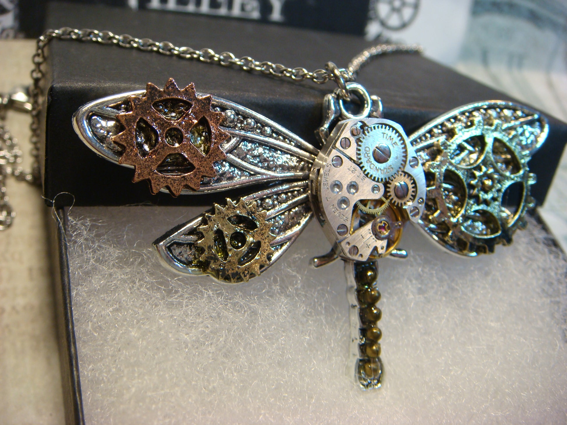 Steampunk Dragonfly Watch Movement Necklace with Exposed Gears