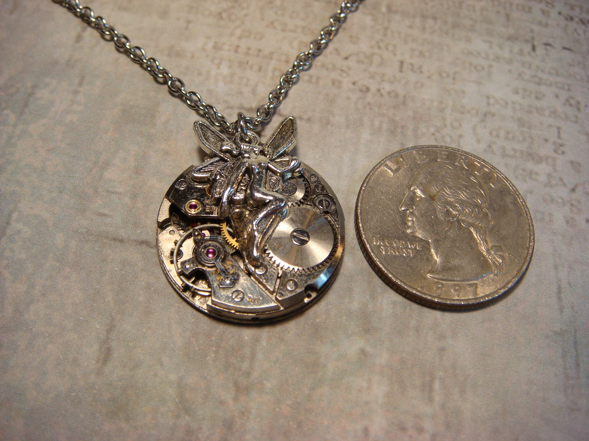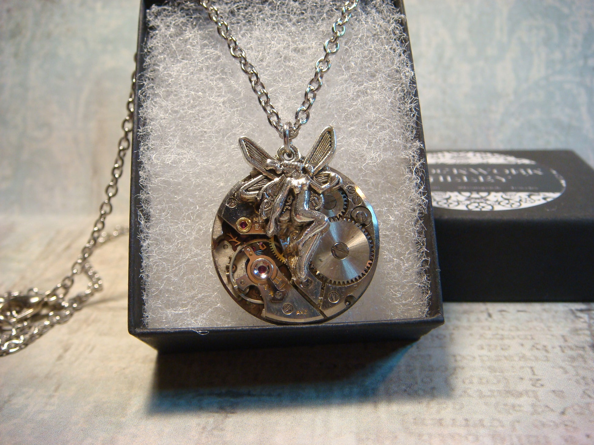 This beautiful, unique necklace features an antique silver fairy attached to an upcycled, non-working watch movement.