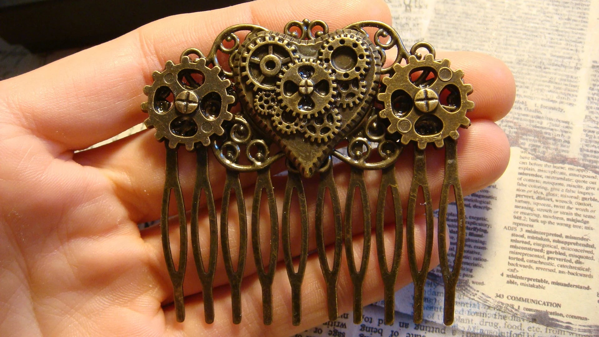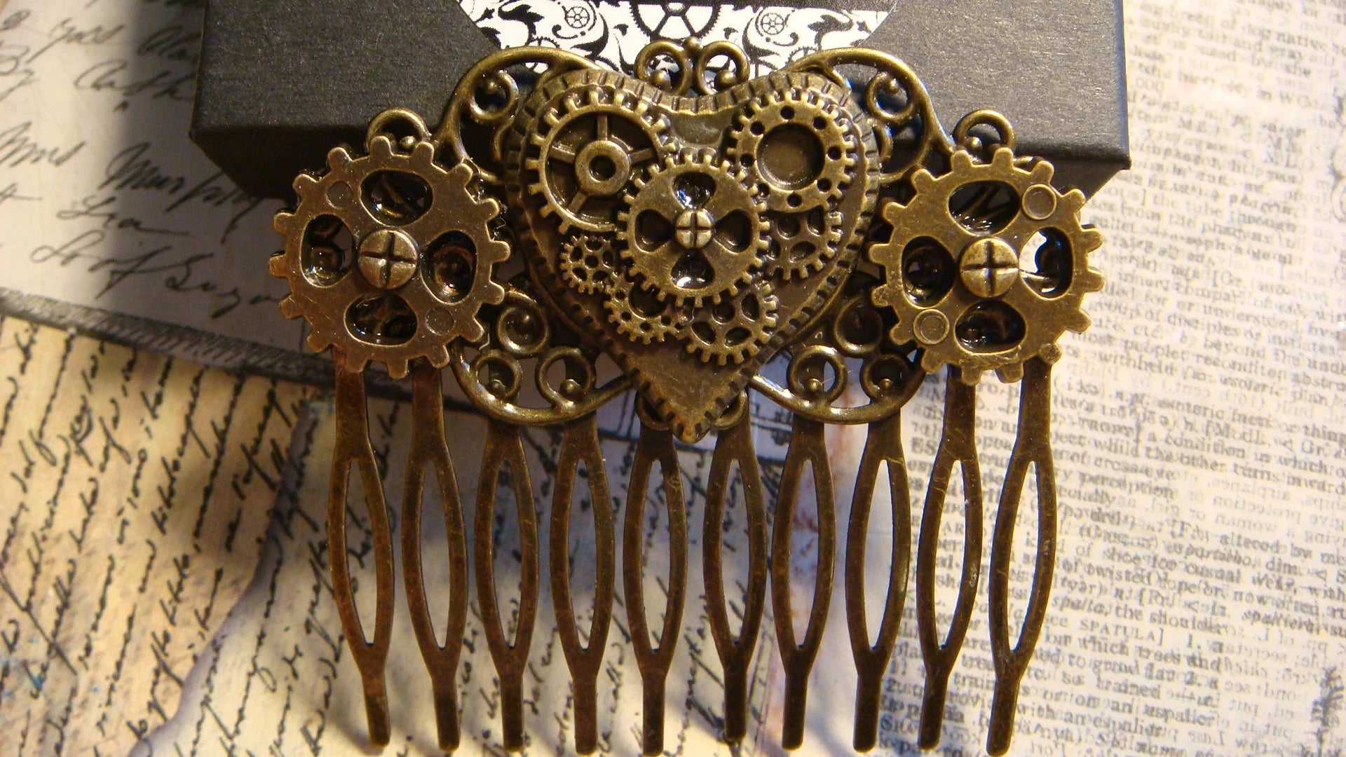 An antique bronze hair comb featuring an antique bronze steampunk charm.
