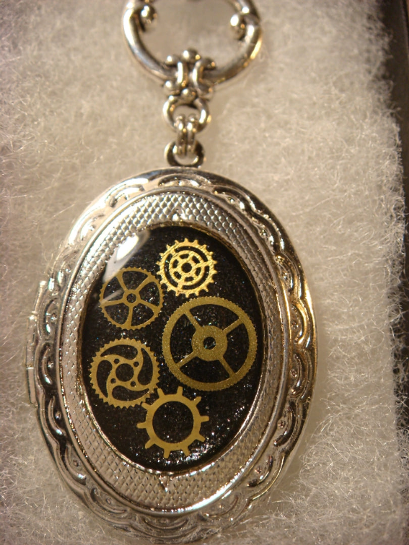 This necklace features upcycled watch gears in resin set in a silver picture locket. The chain is stainless steel 18" long with a lobster clasp closure.