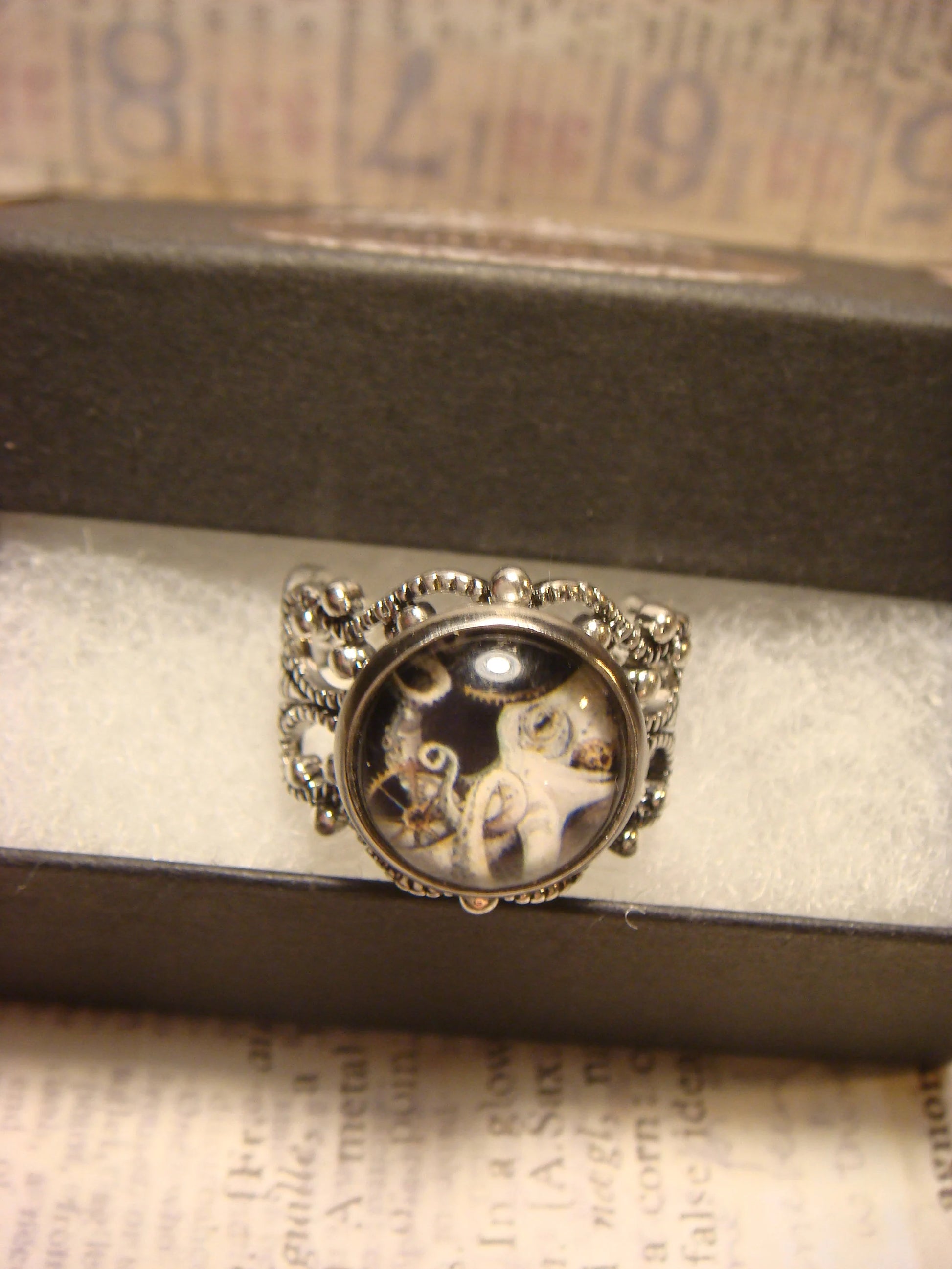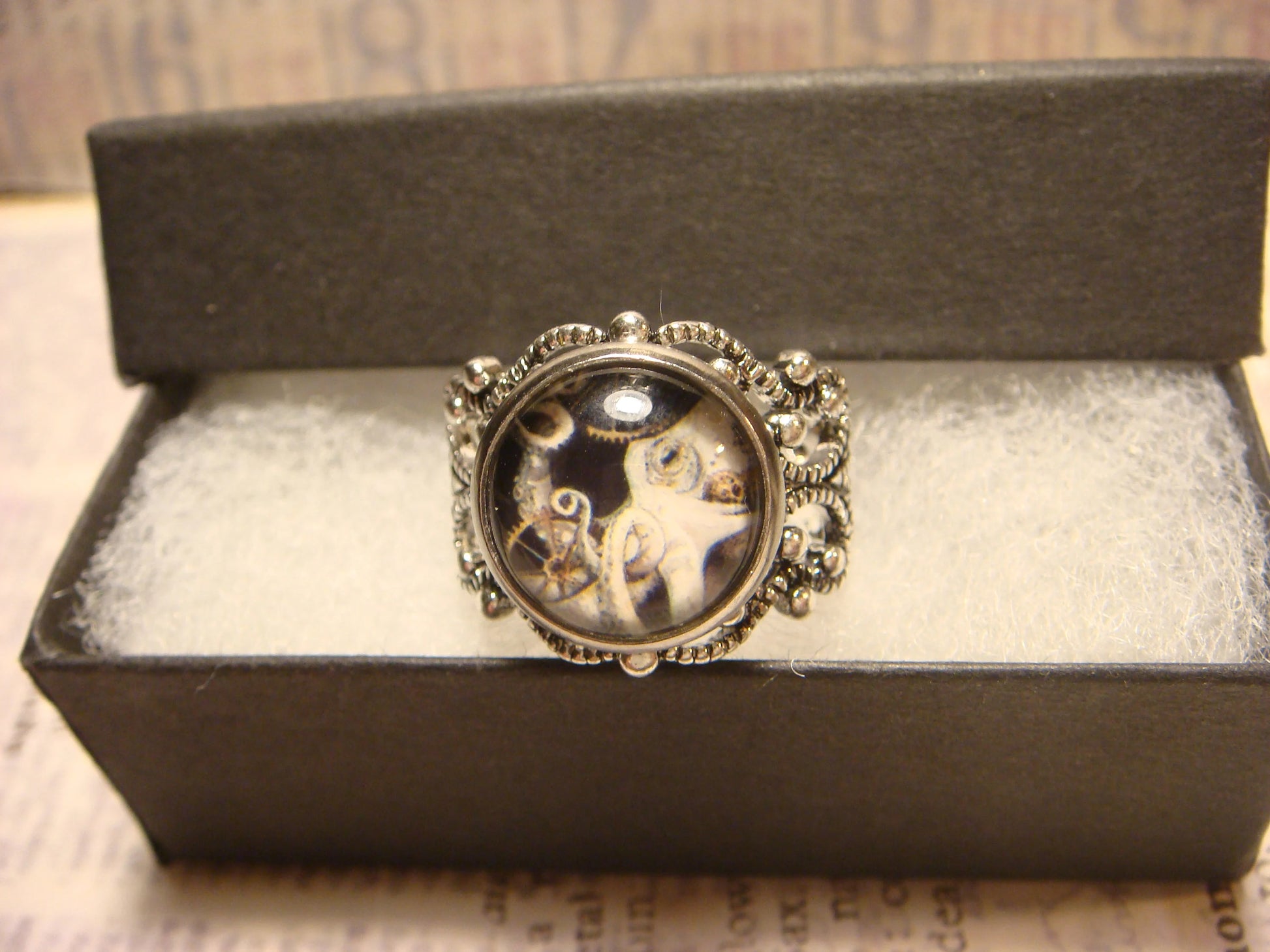 This beautiful ring features a steampunk octopus image cabochon set on a sturdy antique silver filigree Victorian style adjustable ring.