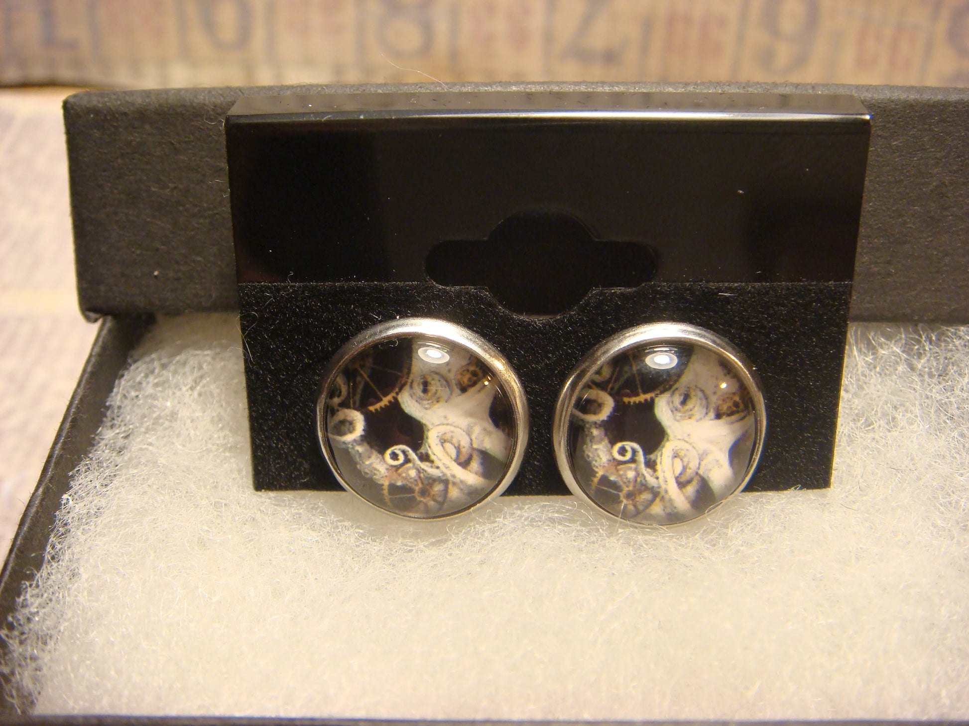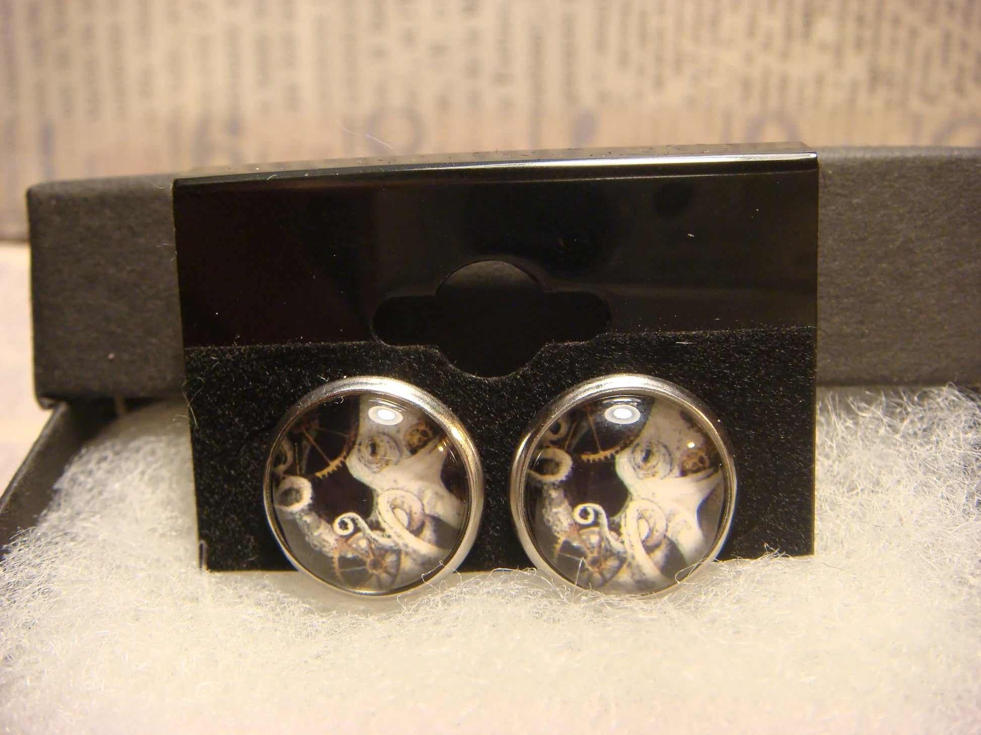 These earrings feature steampunk octopus image cabochons set in stainless steel earring studs.
